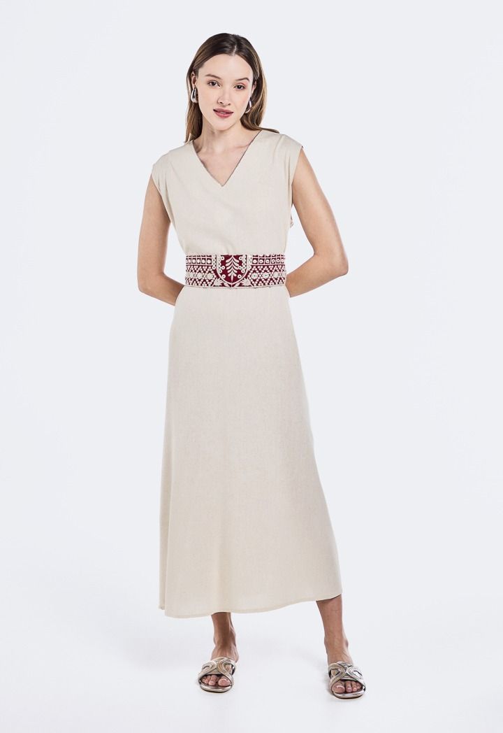 Design:Side Pockets, Lurex , Mirror Embroidered, Inner Sleevless Dress With V-Neck, Belt