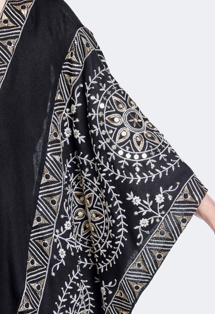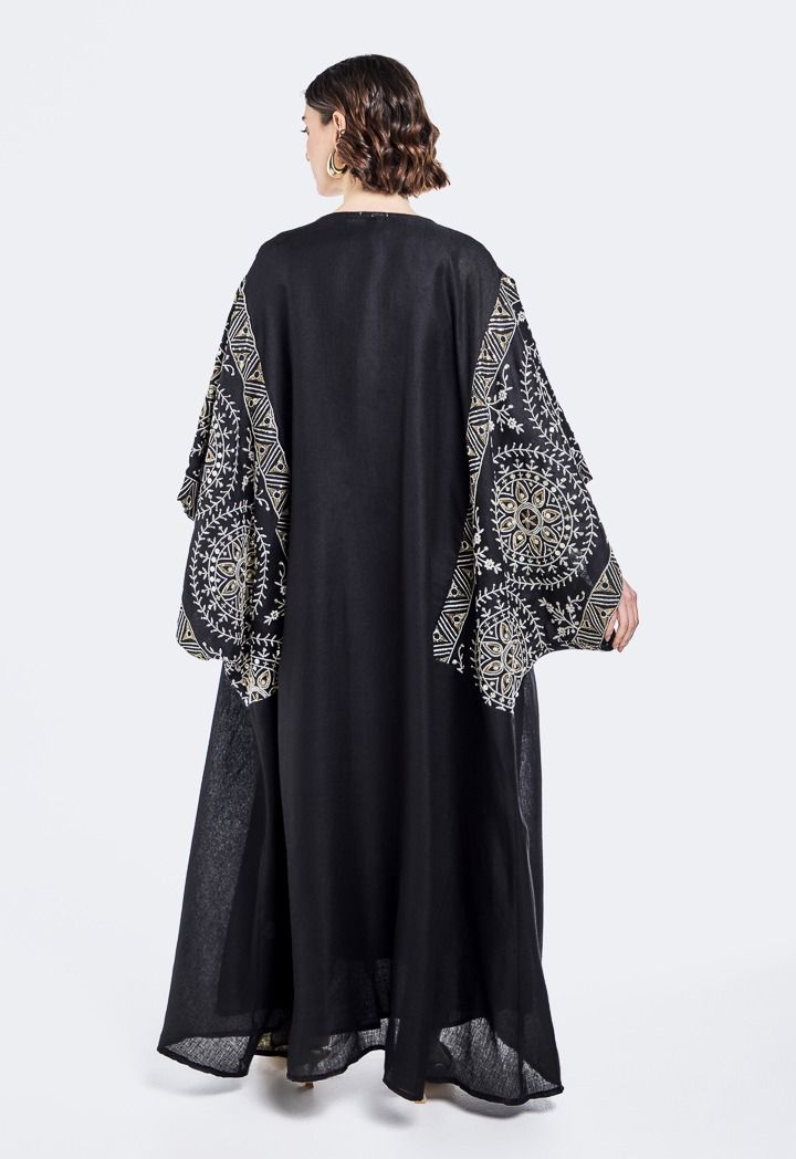 Add a touch of luxury to your look with an embroidered abaya and dress set, featuring waist ties on both sides to highlight your beauty and elegance in every detail.