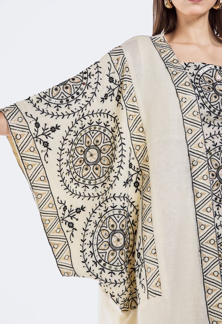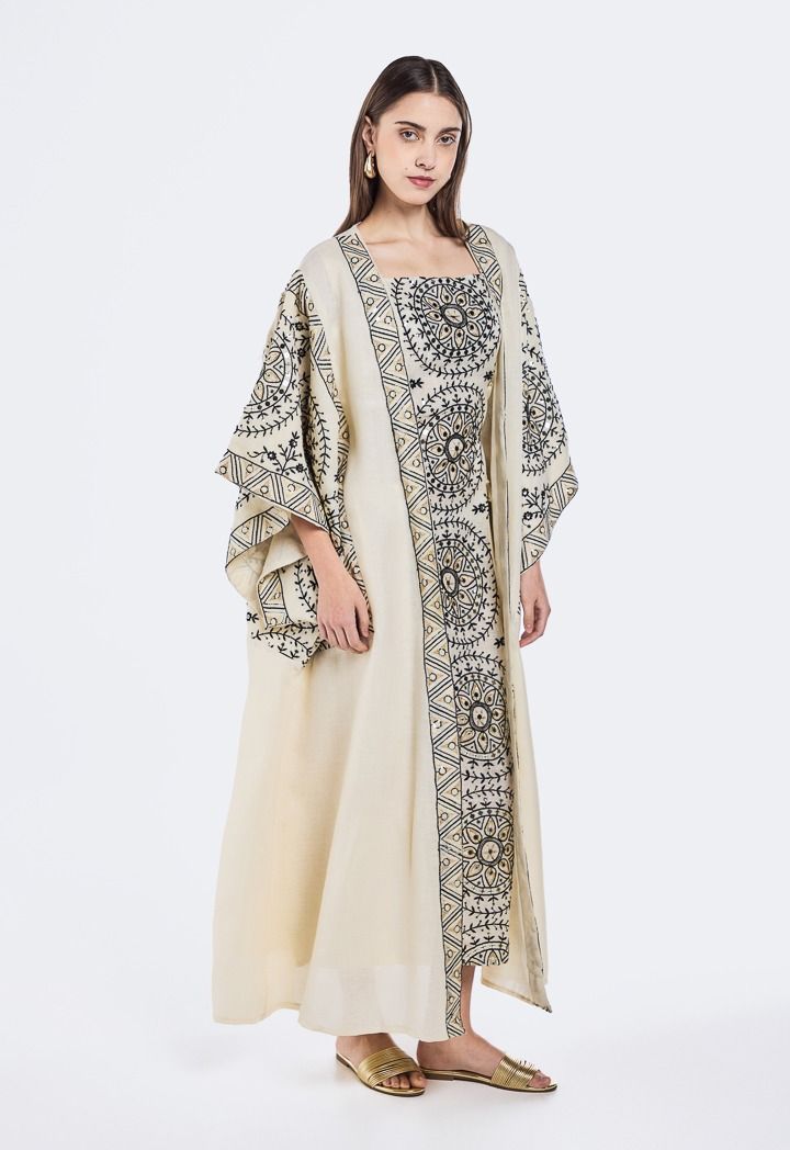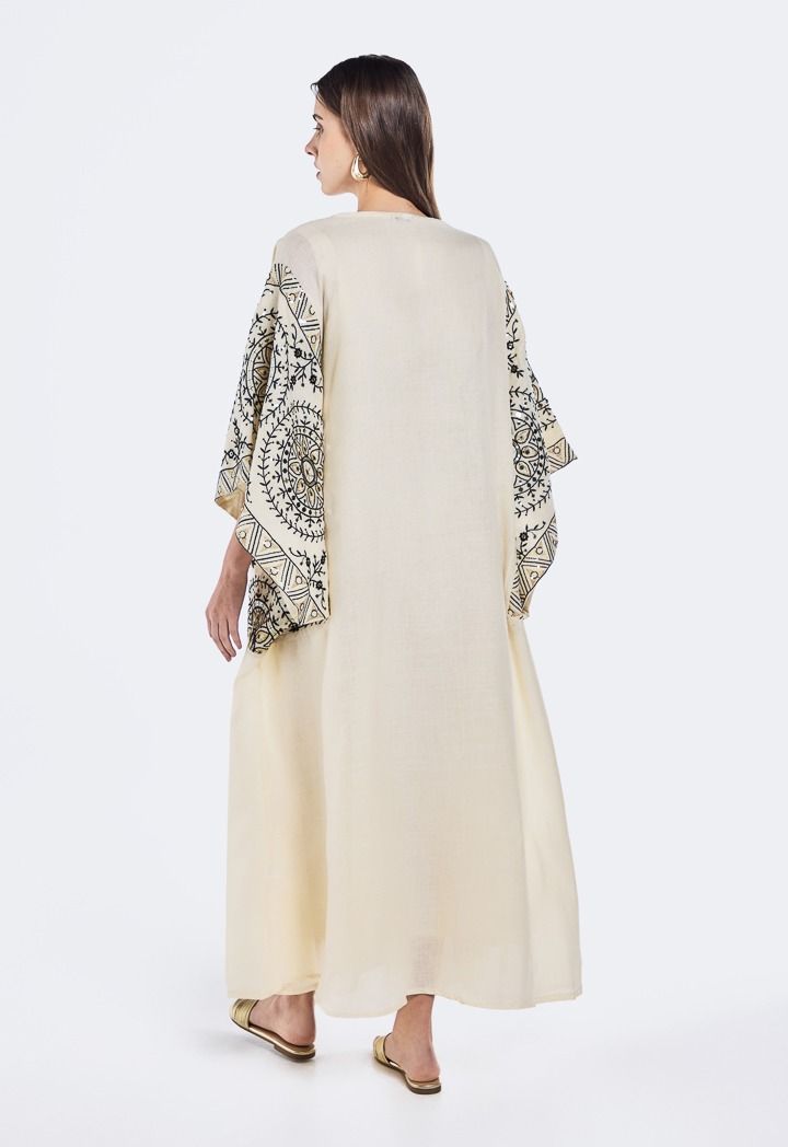 Add a touch of luxury to your look with an embroidered abaya and dress set, featuring waist ties on both sides to highlight your beauty and elegance in every detail.