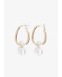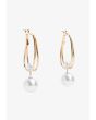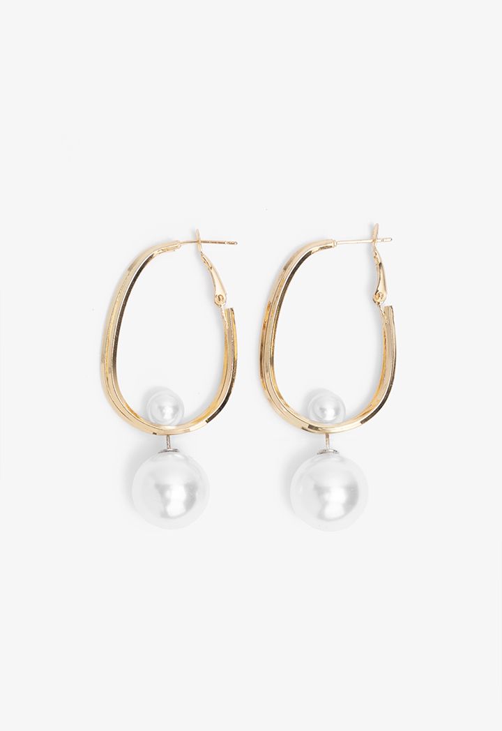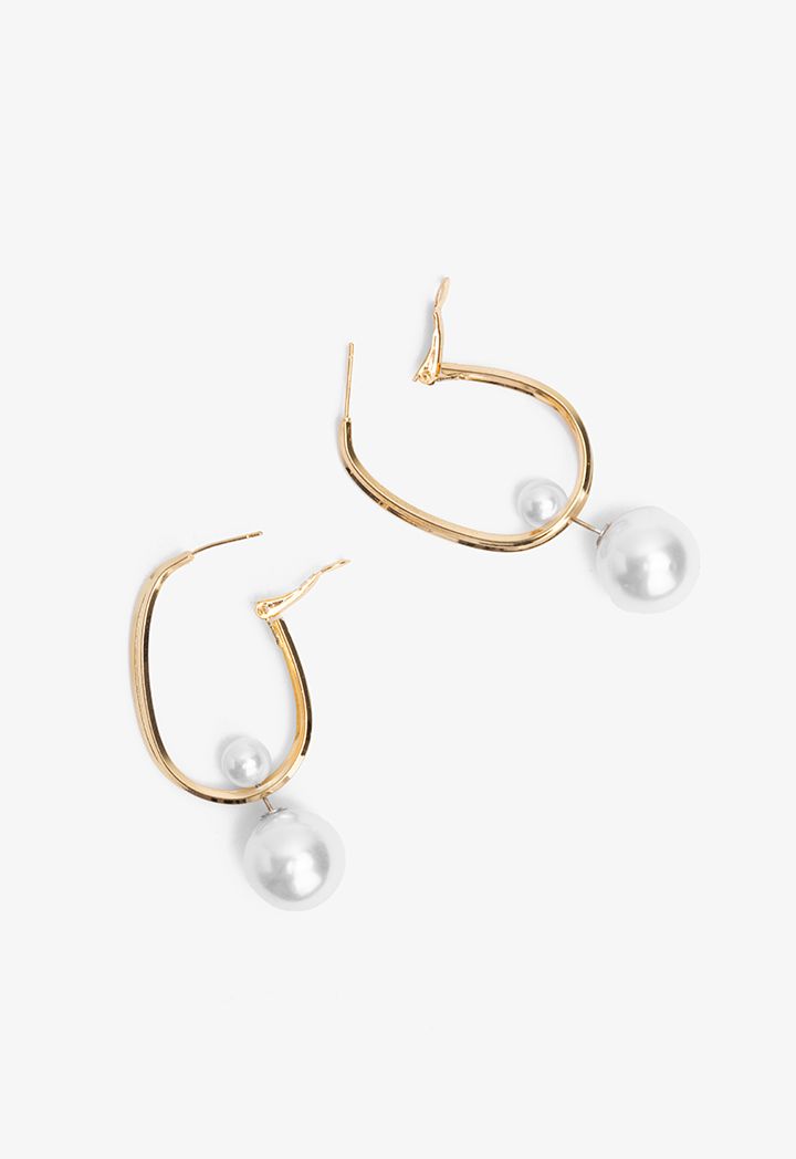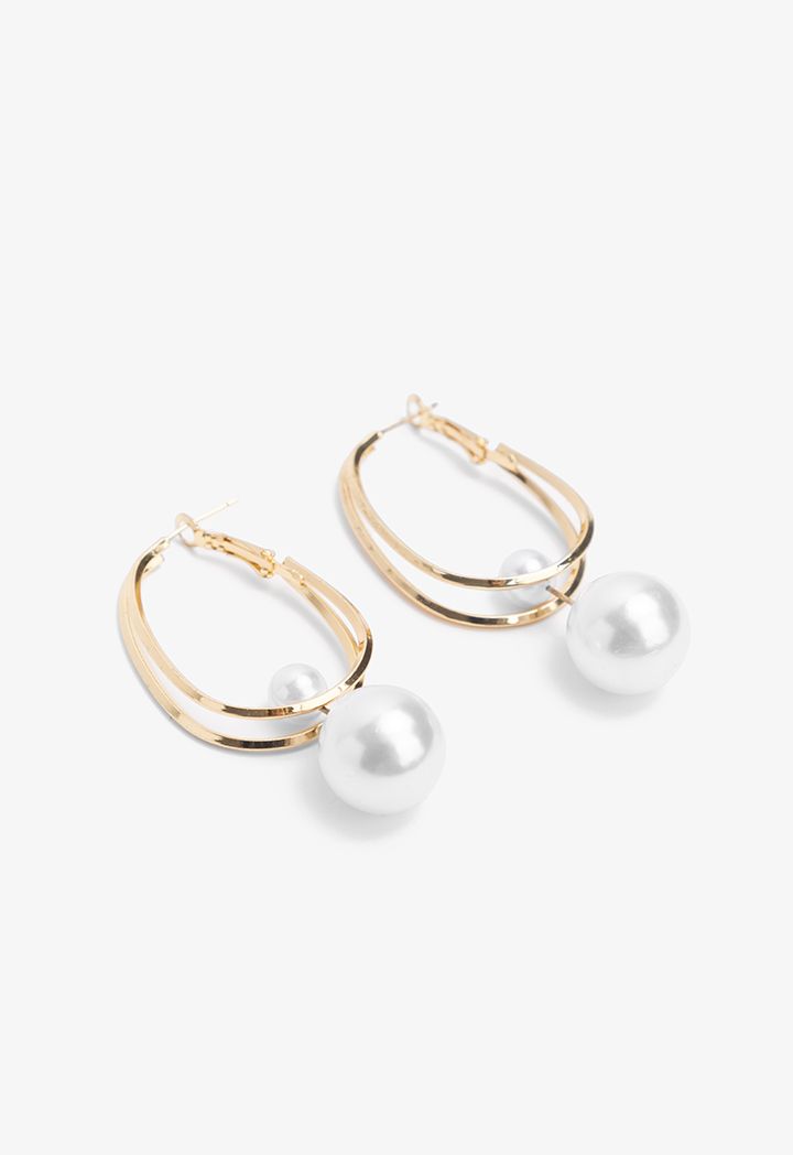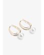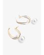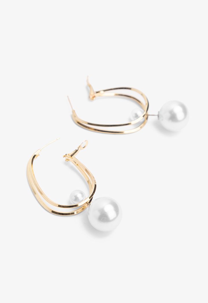 A pair of earrings that features a small hoop design that is embellished with a dual faux pearls.