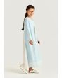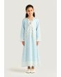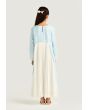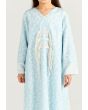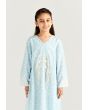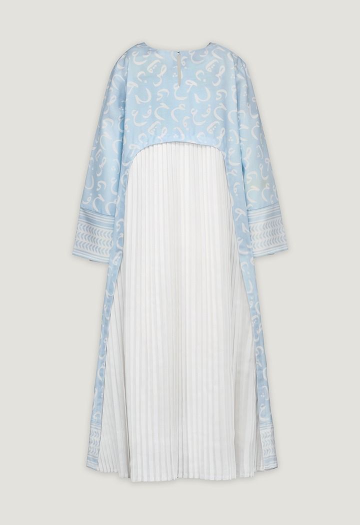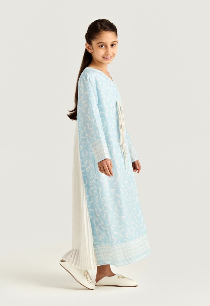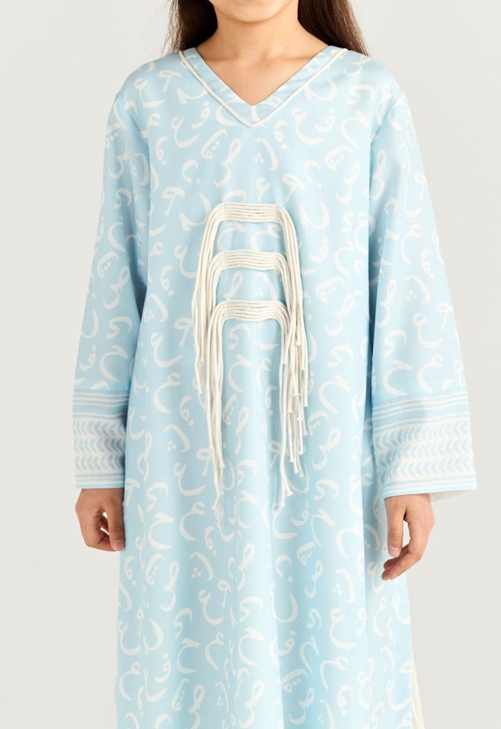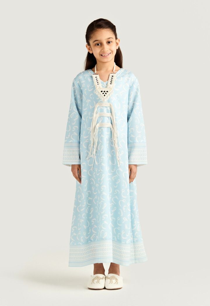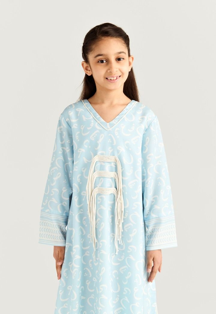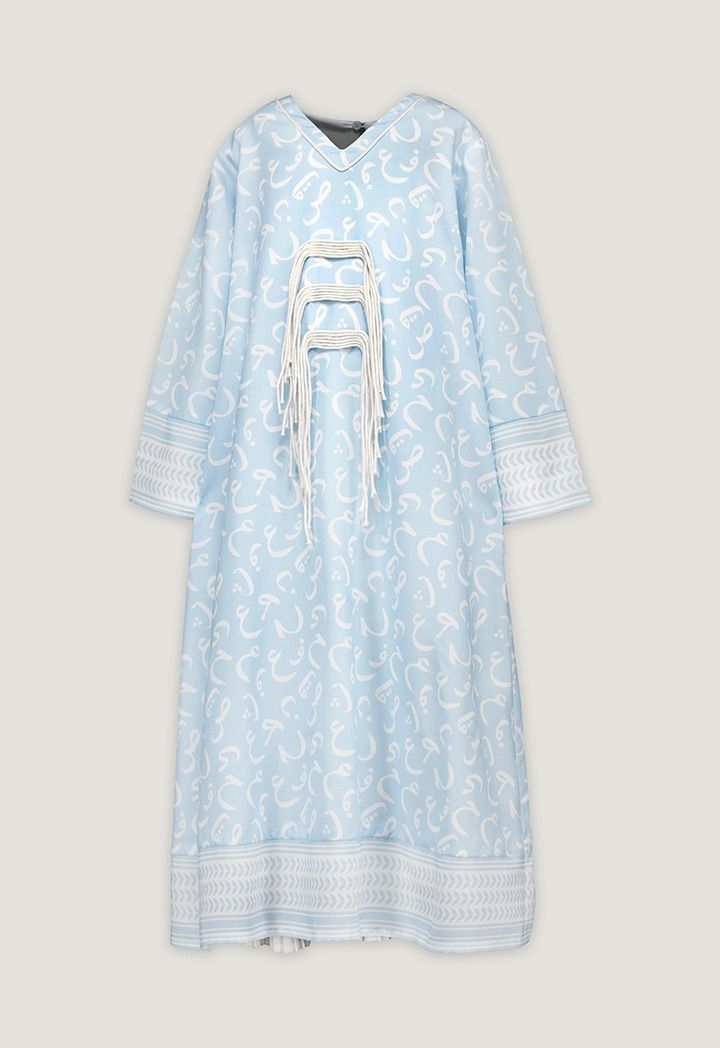 A light dress covered in soft Arabic Letter-style swirls and finished with contrast trims for calm yet standout look throughout the days of Ramadan.