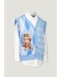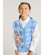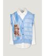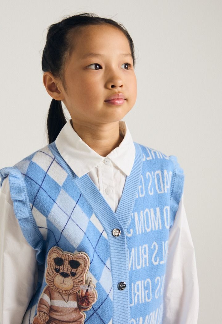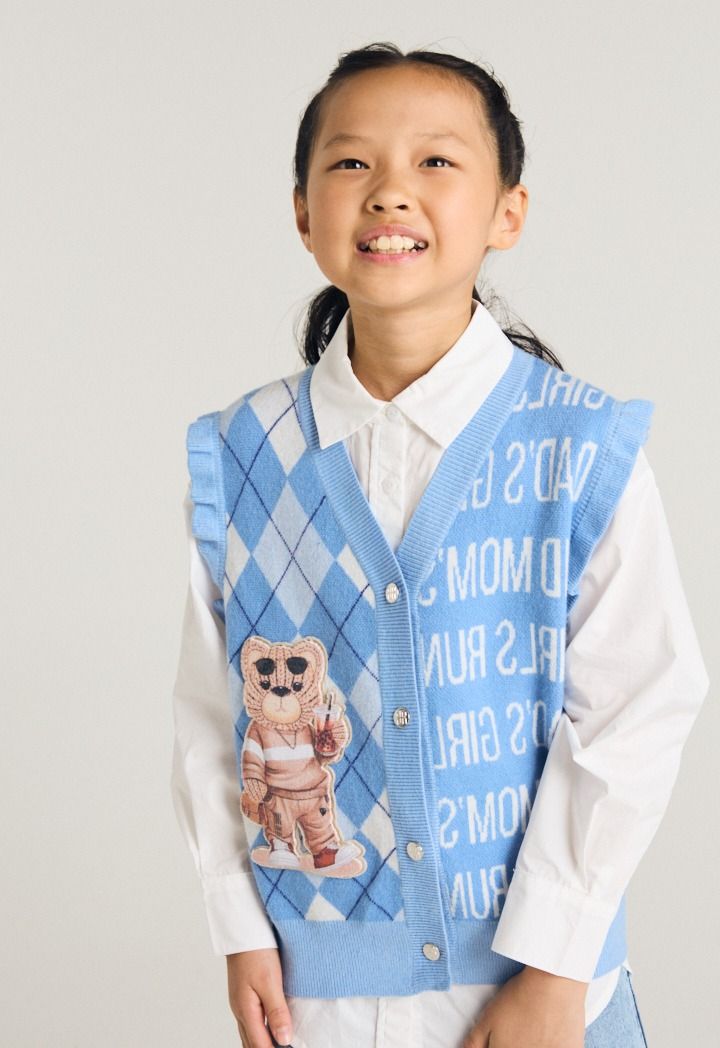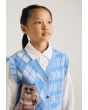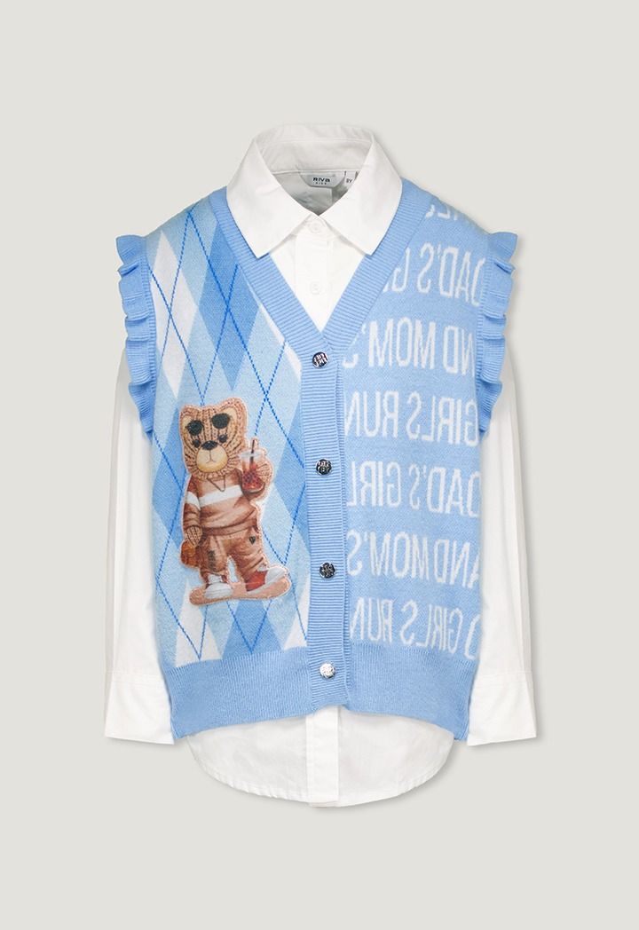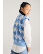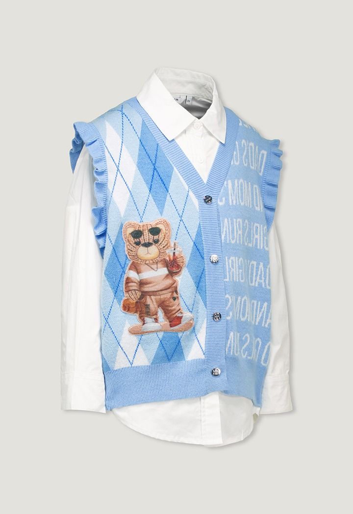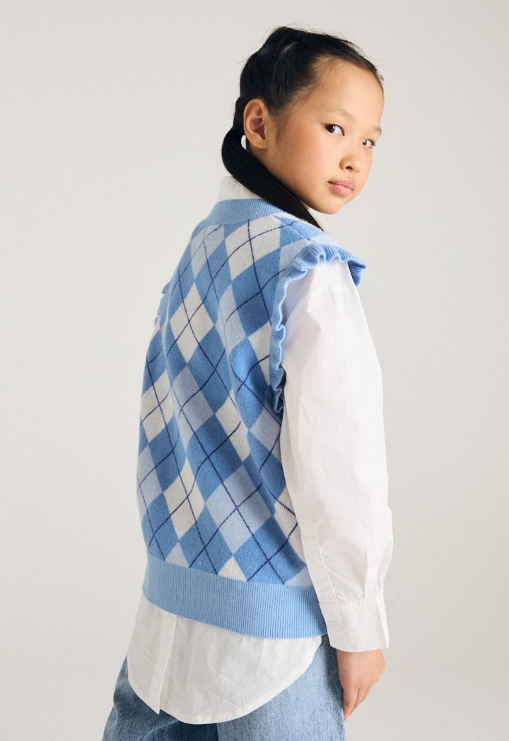 A knitted argyle vest paired with a unique double-faced buttoned shirt.