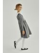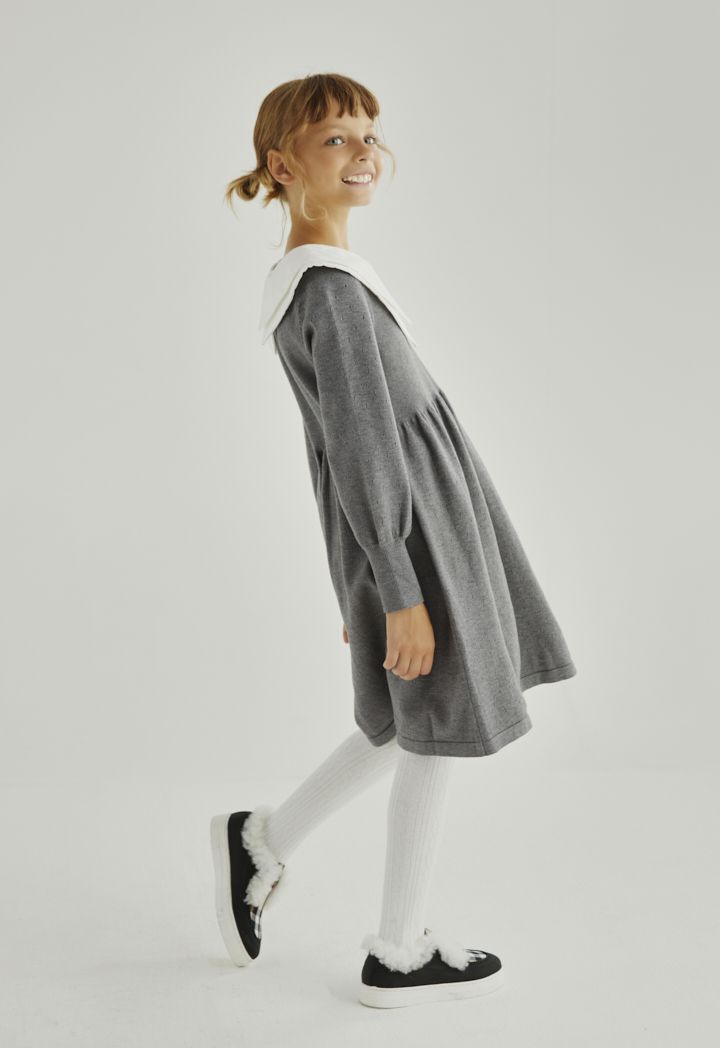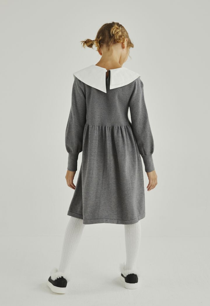 A knitted dress that features a unique asymmetrical collar and long sleeves.