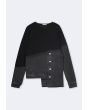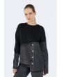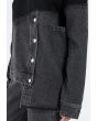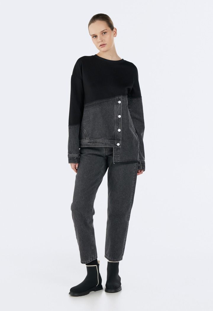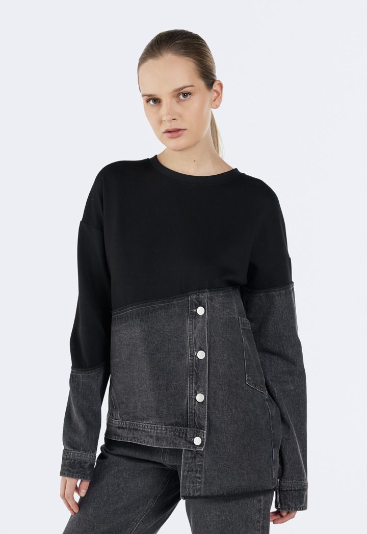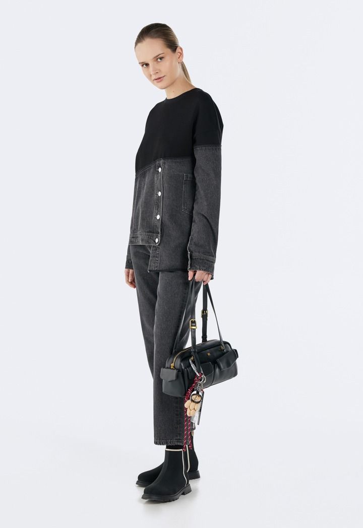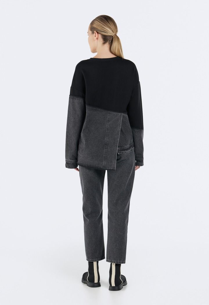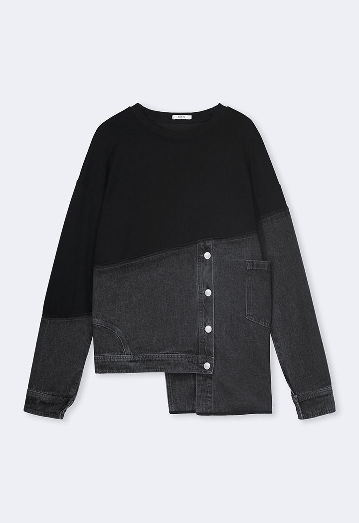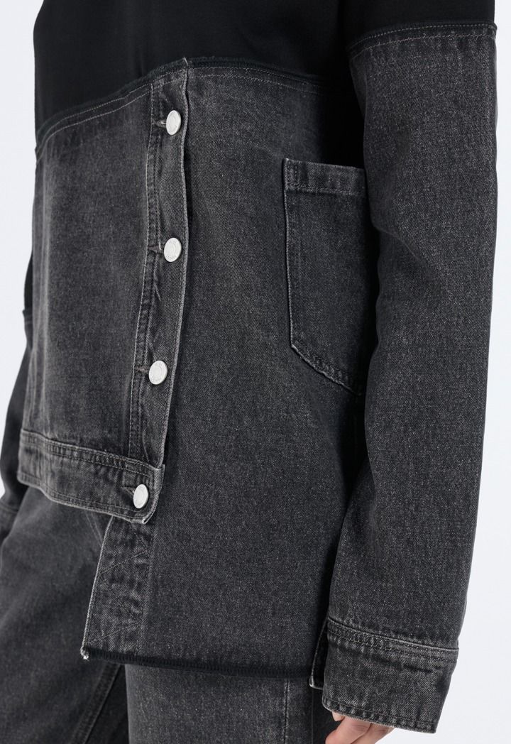 Design: Denim Details, Drop Shoulders, Patch Pocket, Back Slit, Asymmetrical Hem