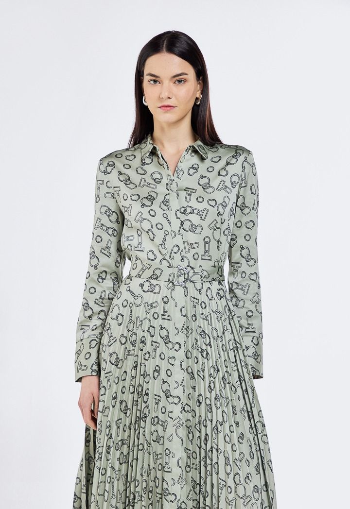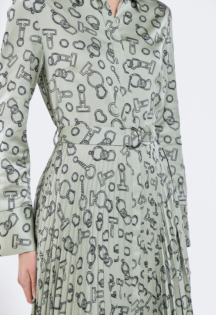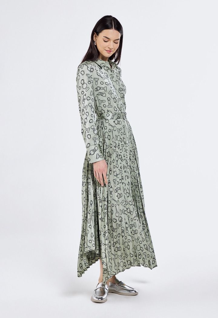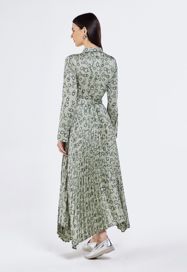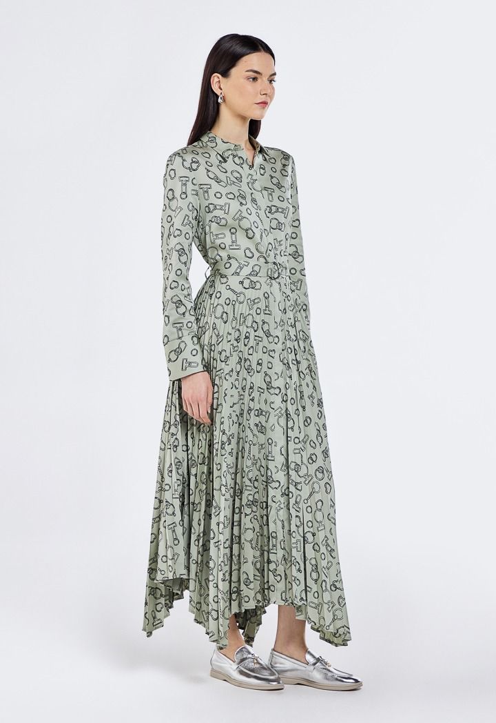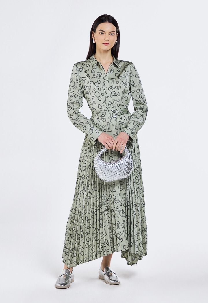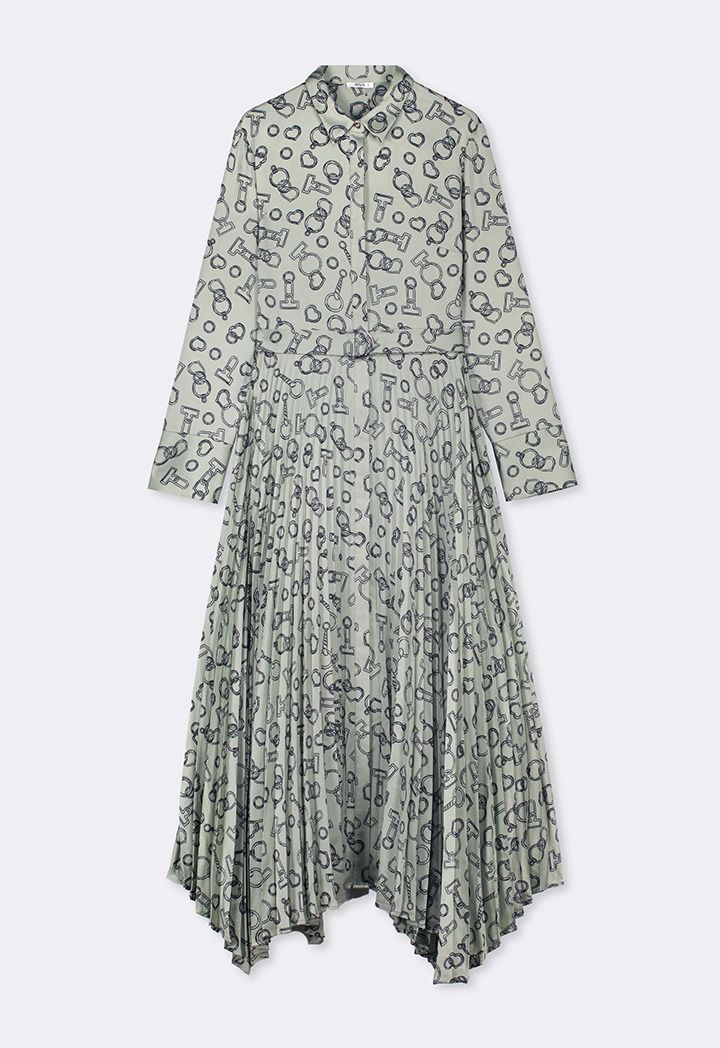 Design: Printed, Pleated, Asymmetrical Hem, Belted