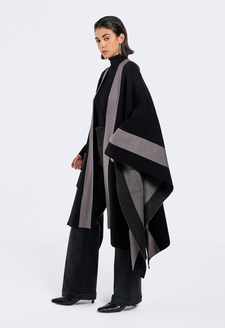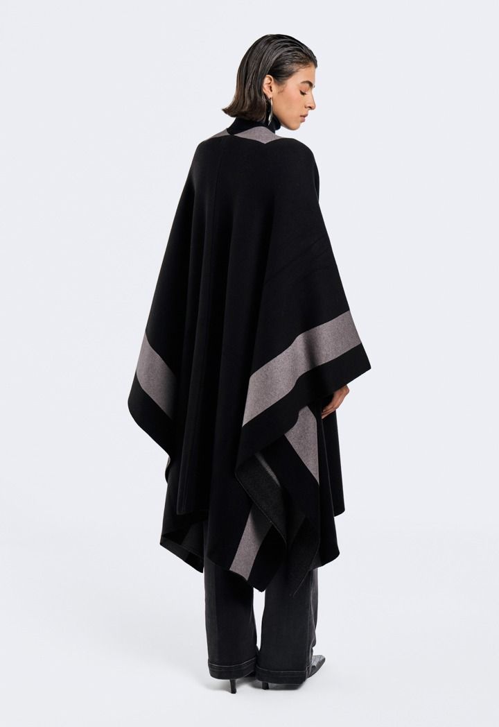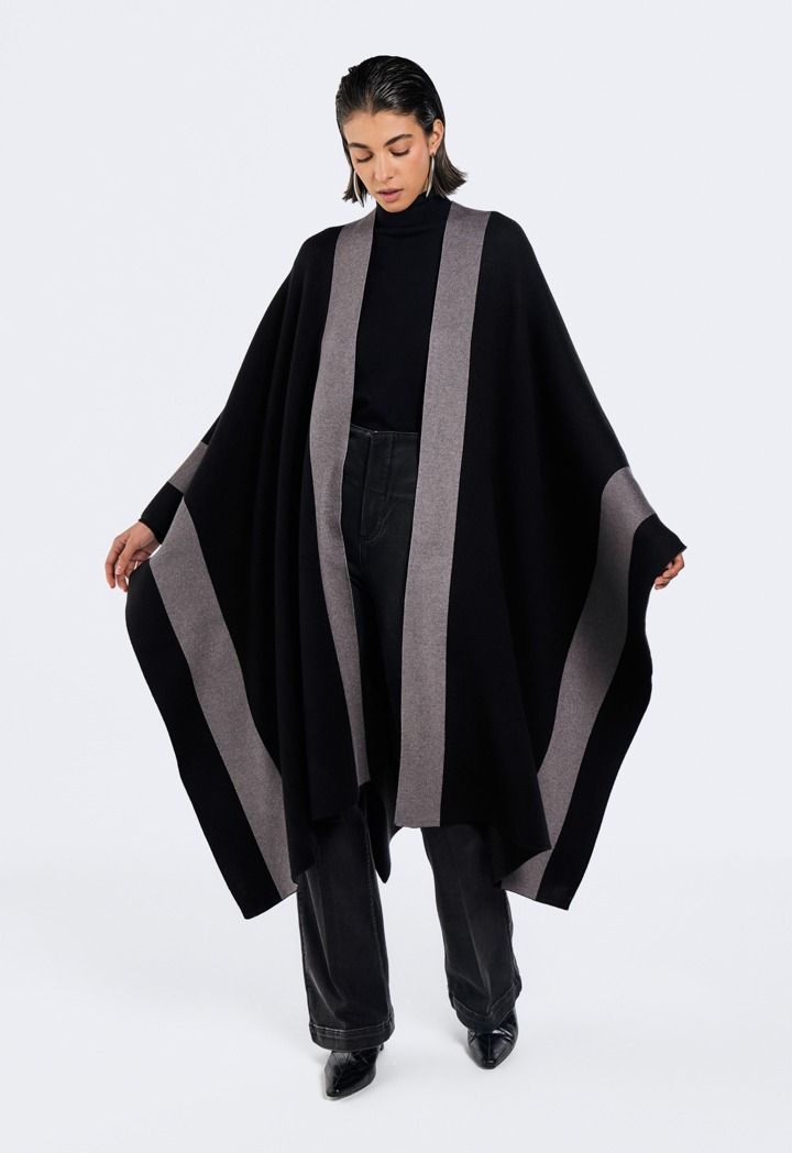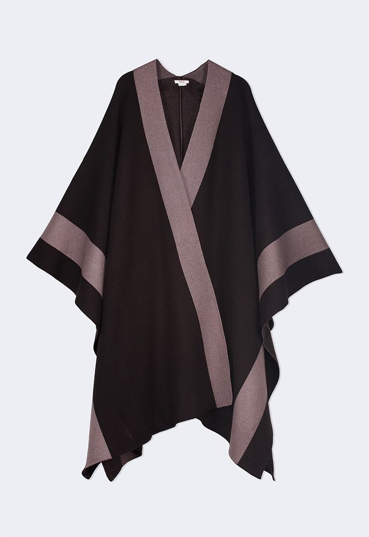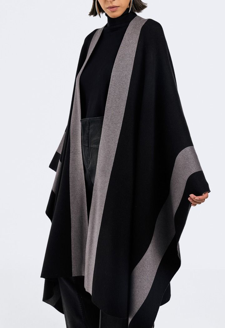 A knitted poncho that features an asymmetrical contrast design to add to its appeal.