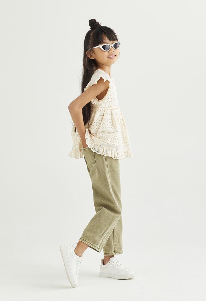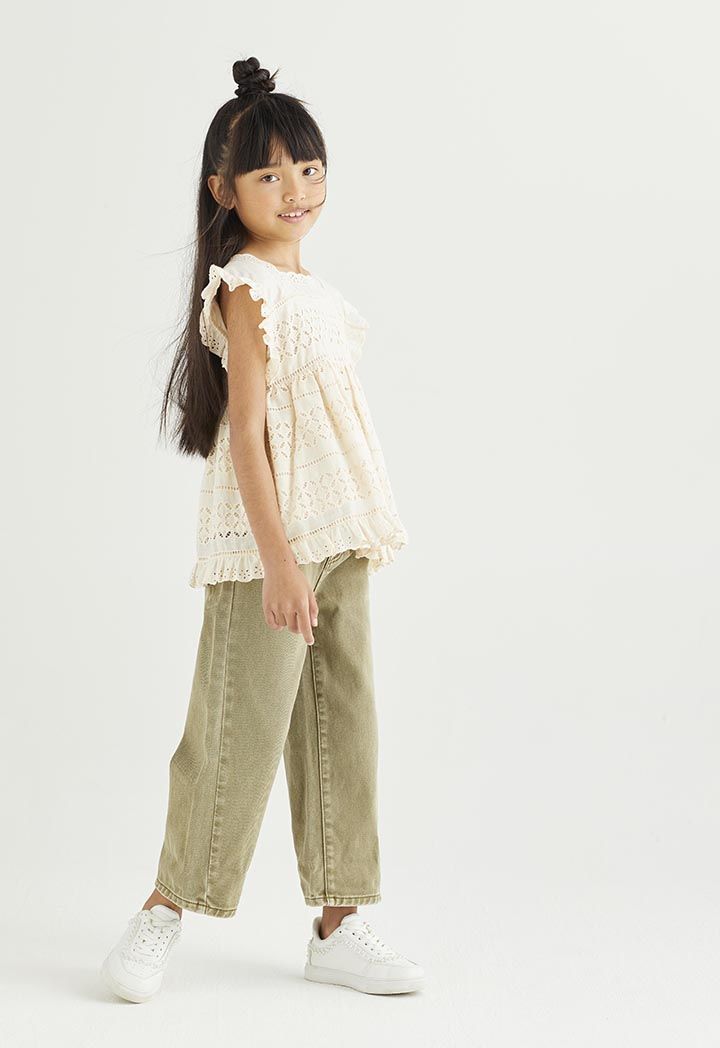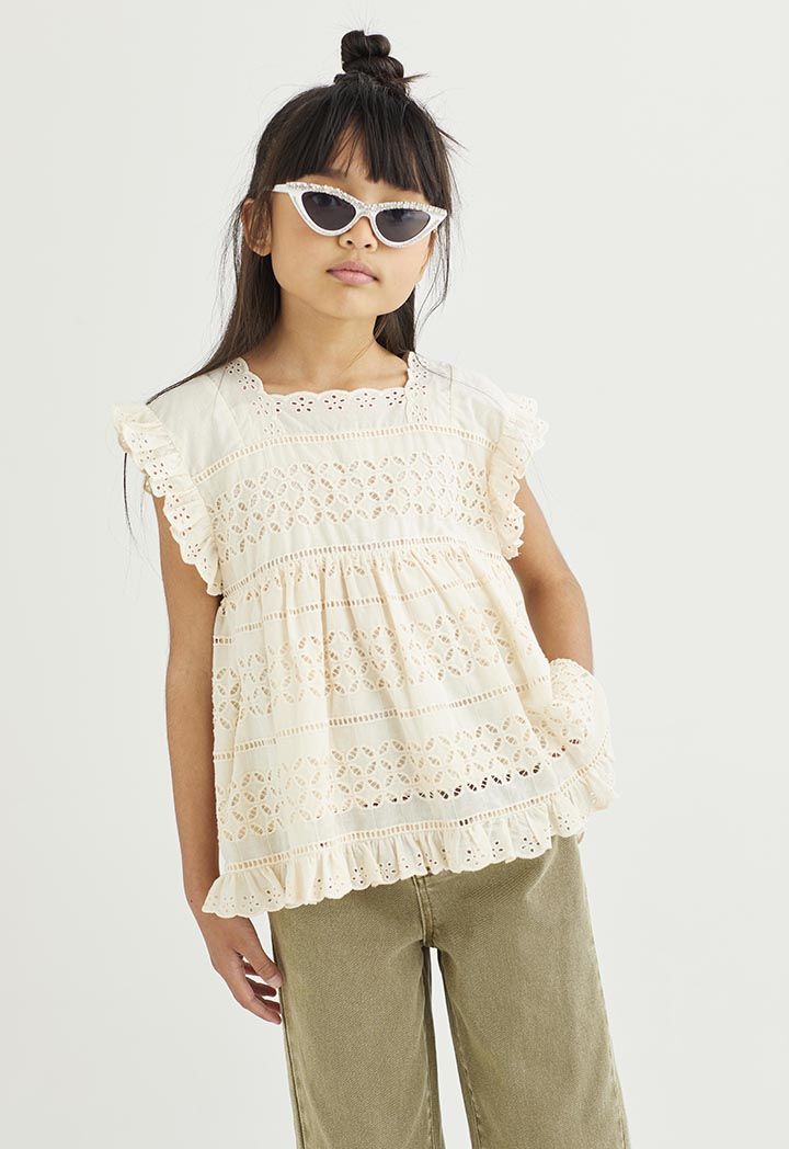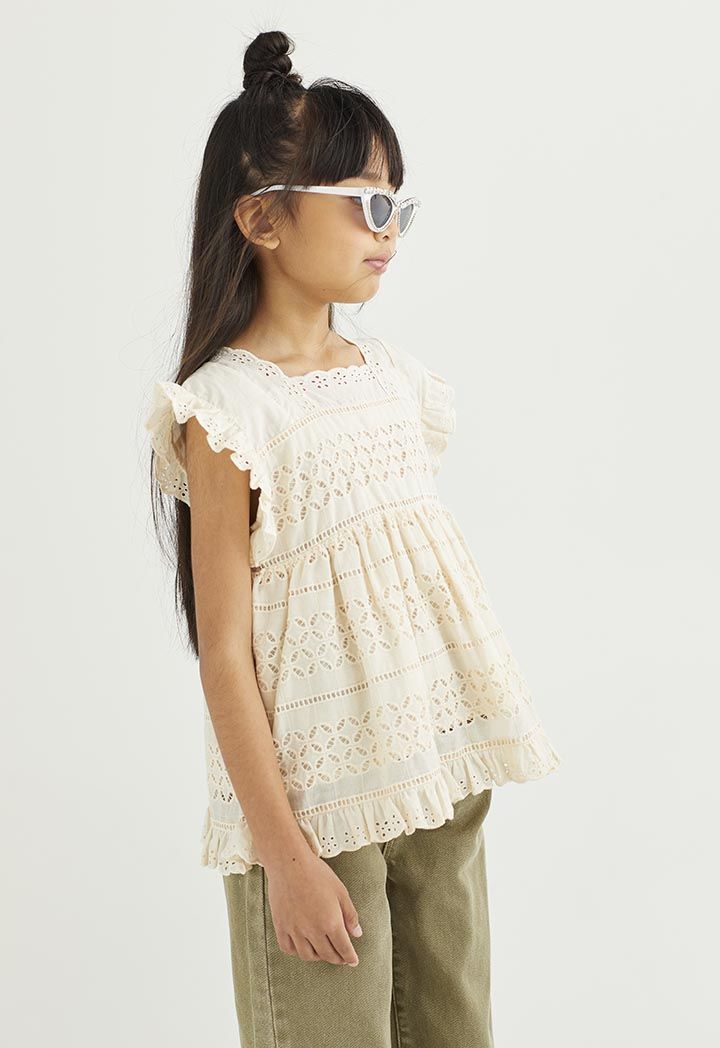 A schiffli top that features a fun and light design that can be worn with solid bottoms.