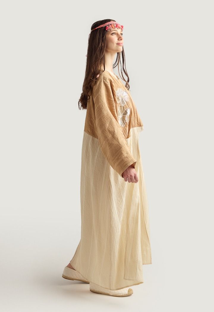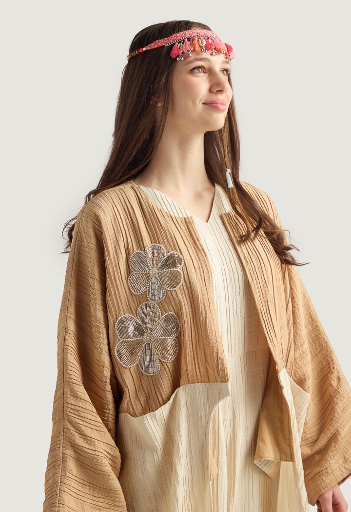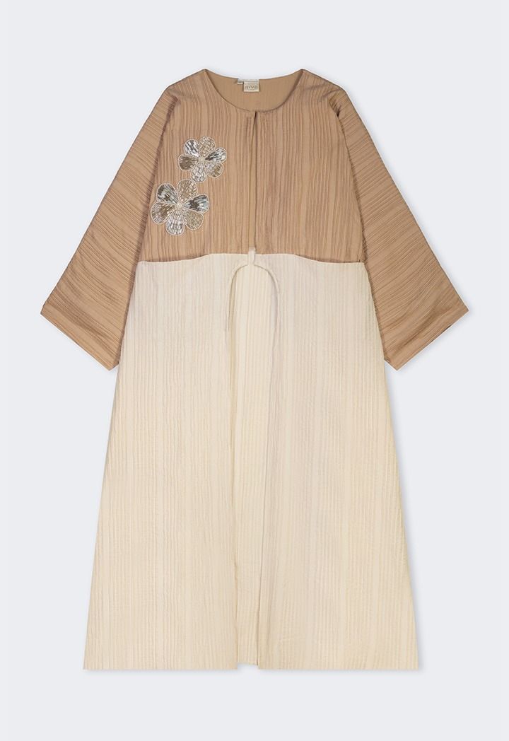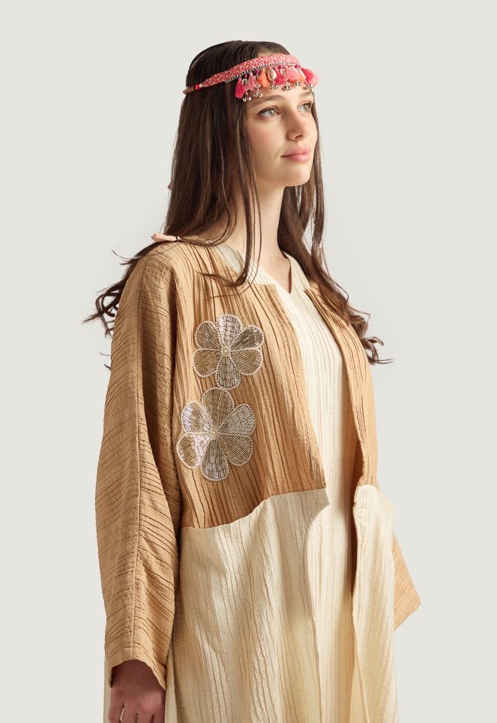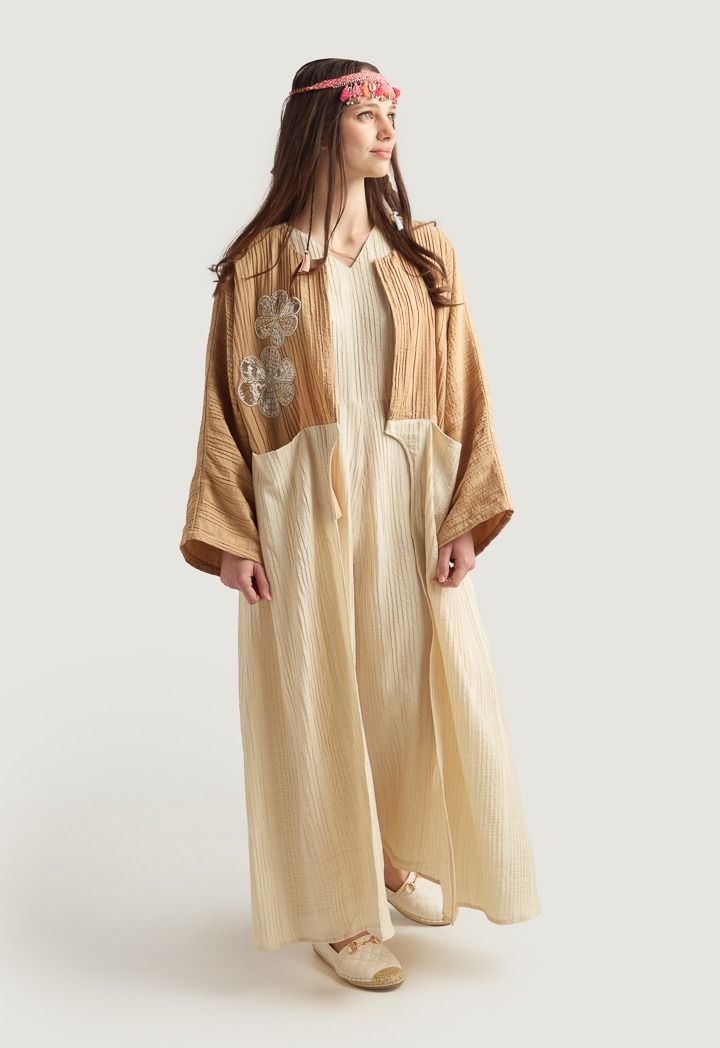 A textured and a sparkling design that features a floral beaded abaya and a solid sleeveless jumpsuit.