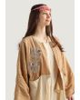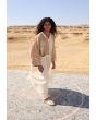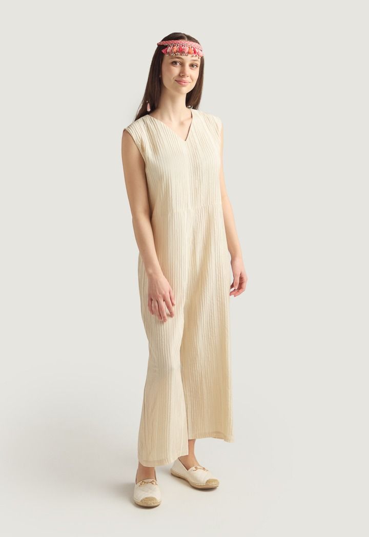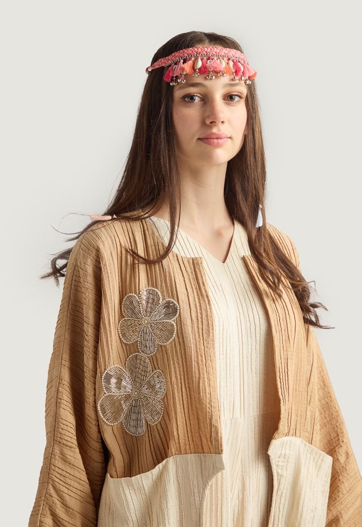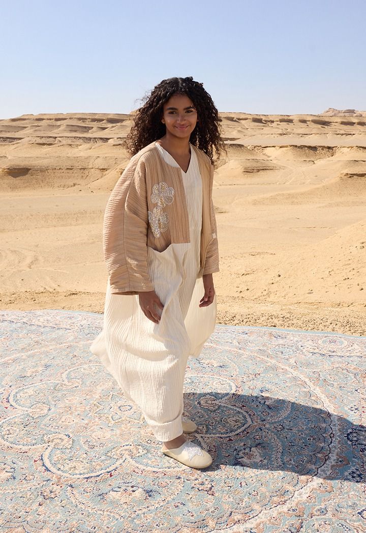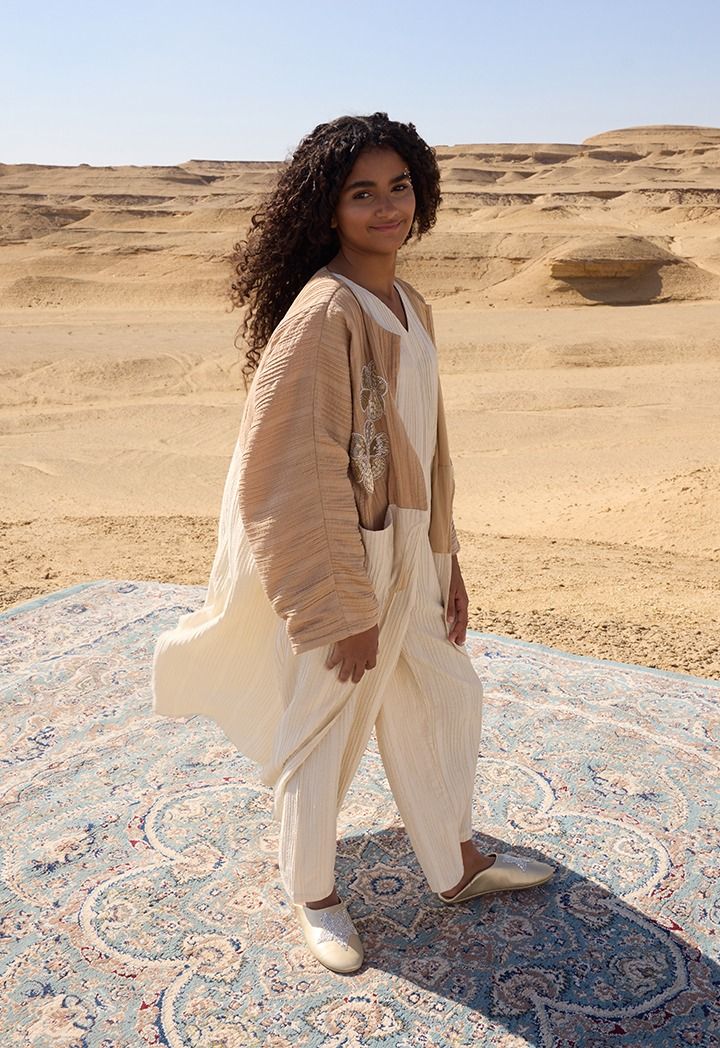 A textured and a sparkling design that features a floral beaded abaya and a solid sleeveless jumpsuit.