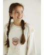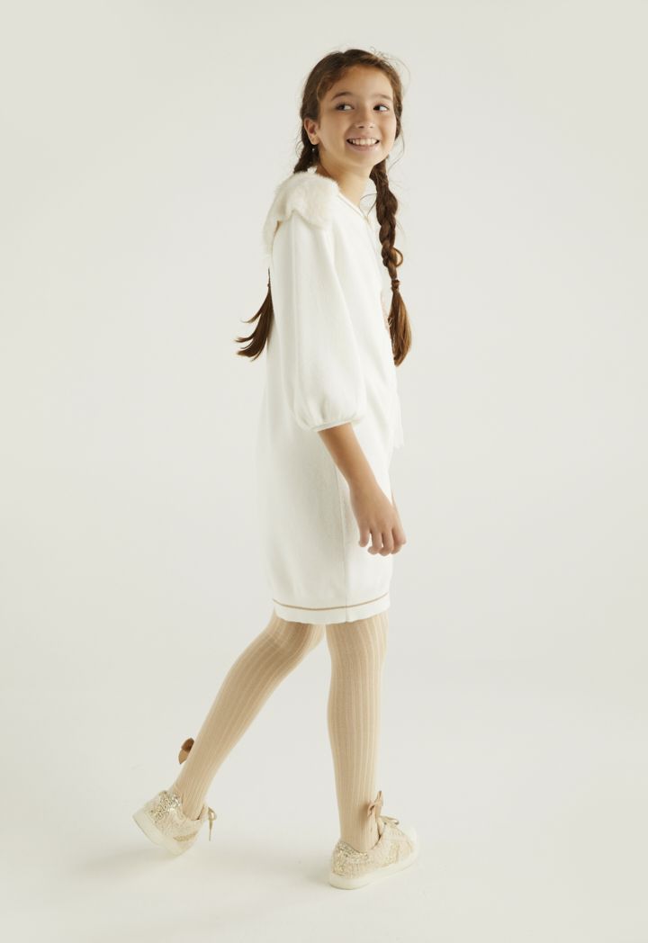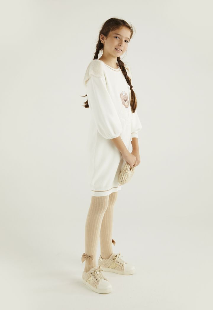 A warm dress that features a printed bear and faux rabbit hair touches.