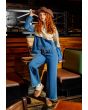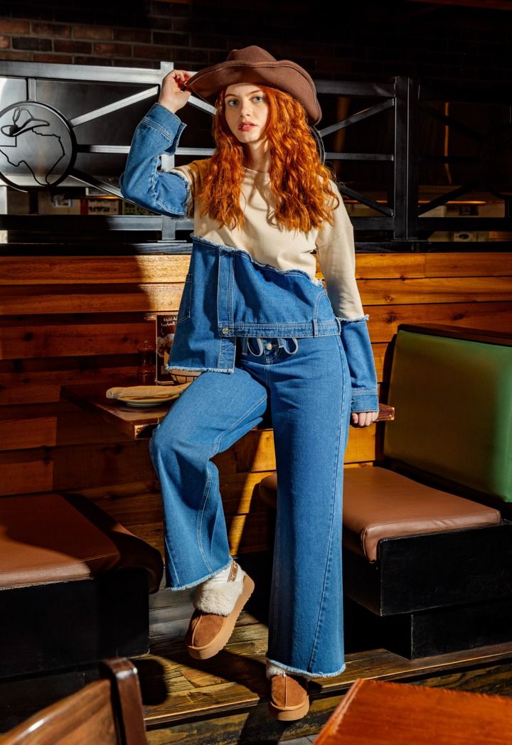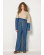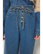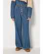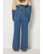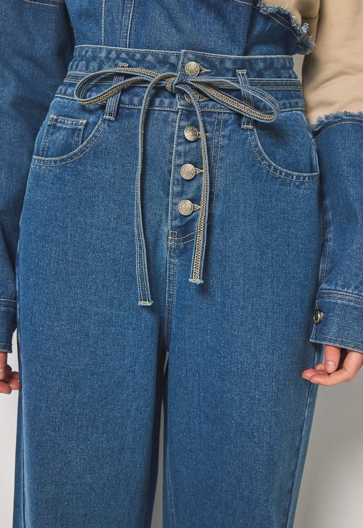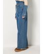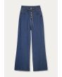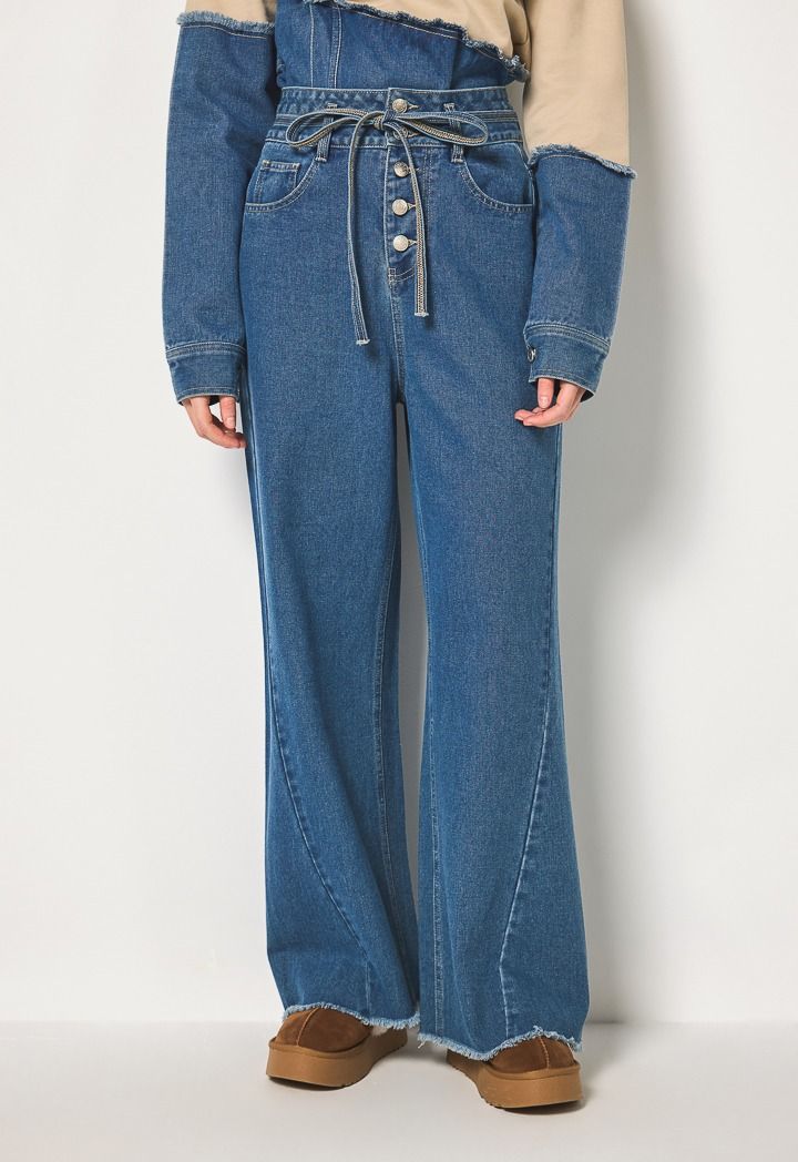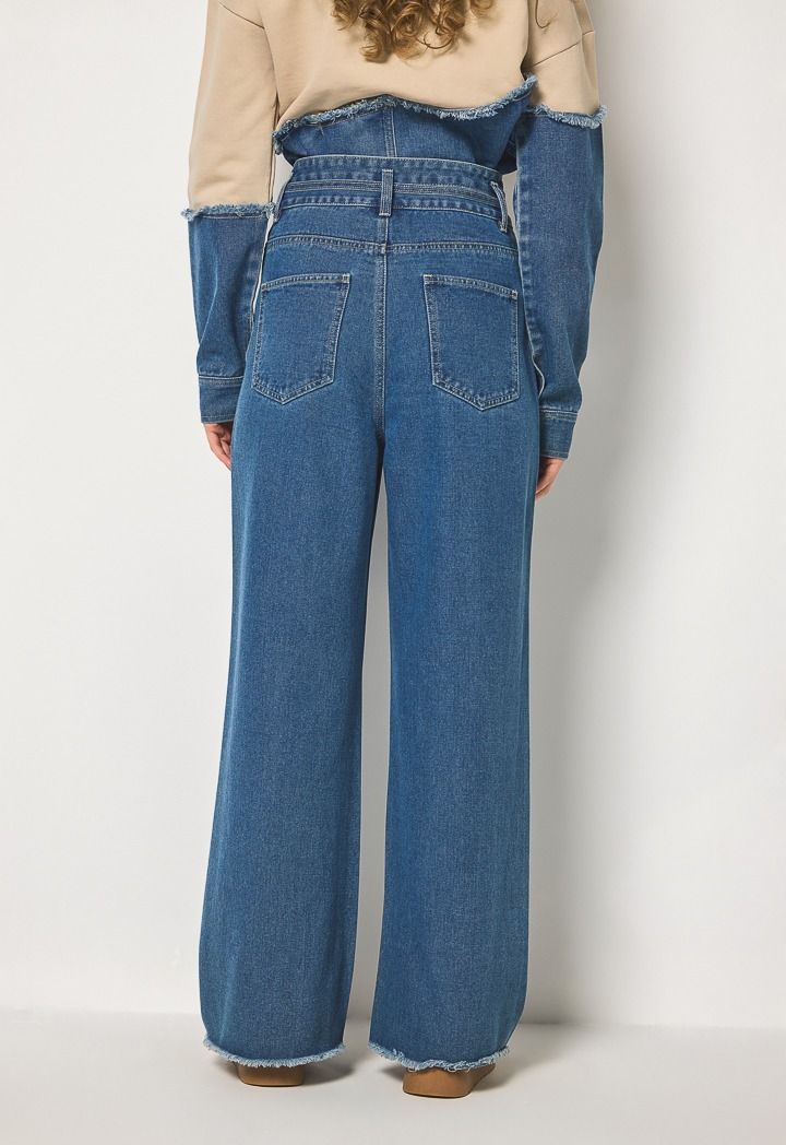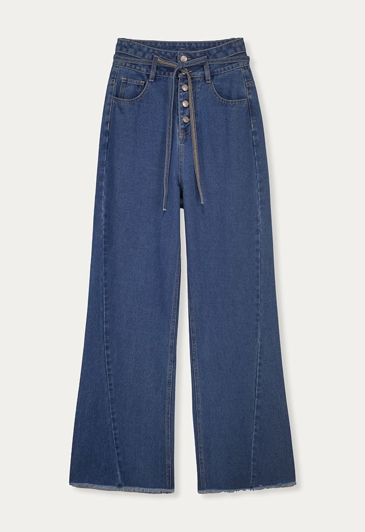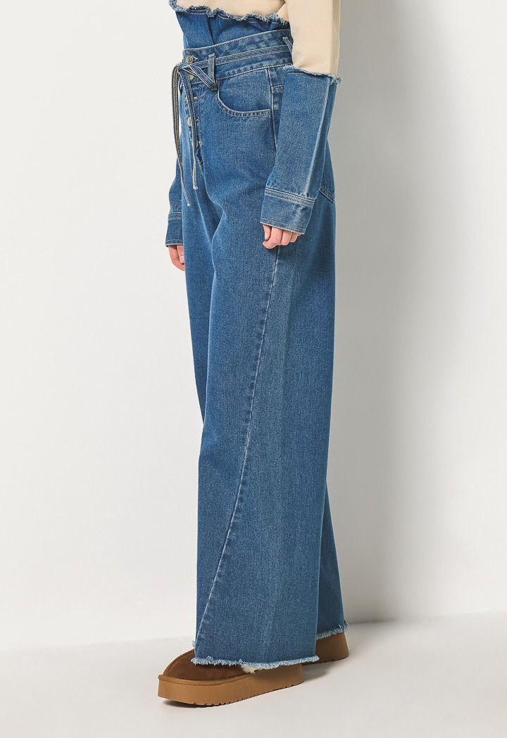 A modern pair of denim jeans that supports a wide leg and a belted waist.