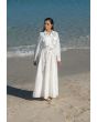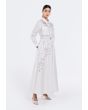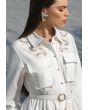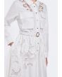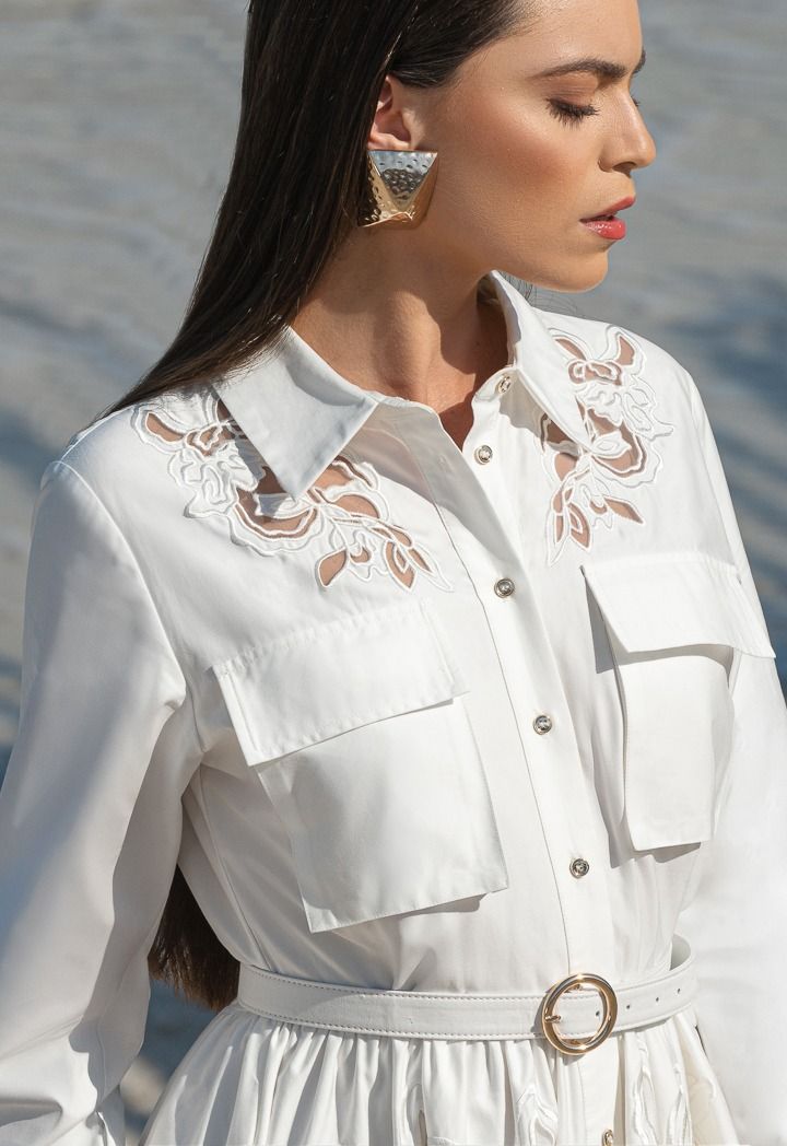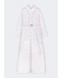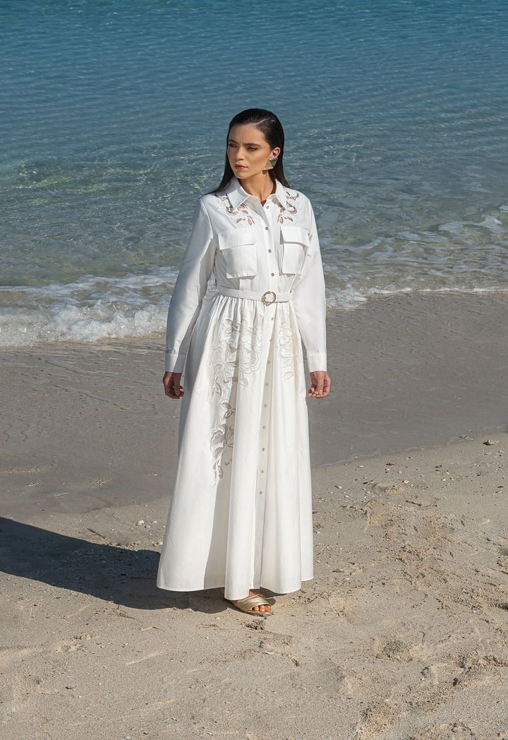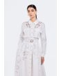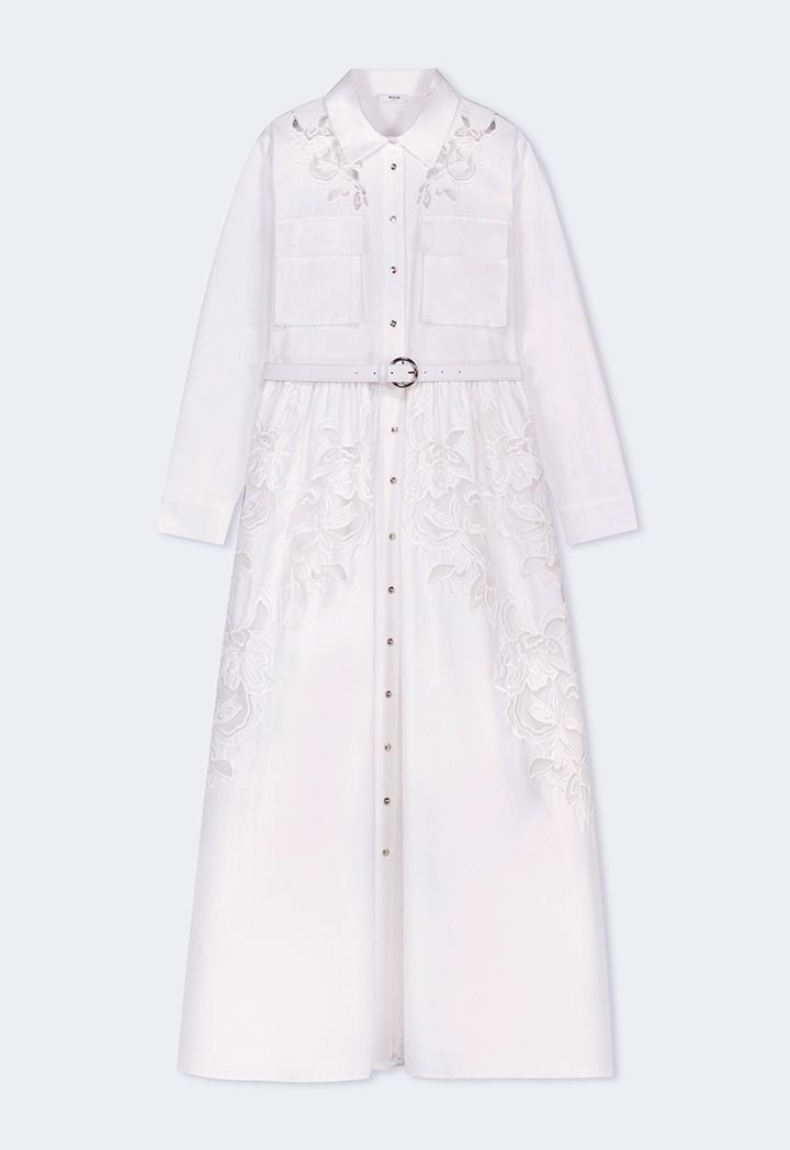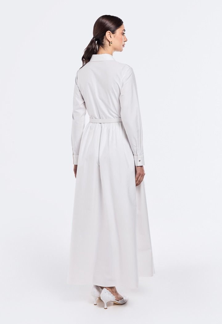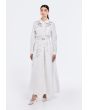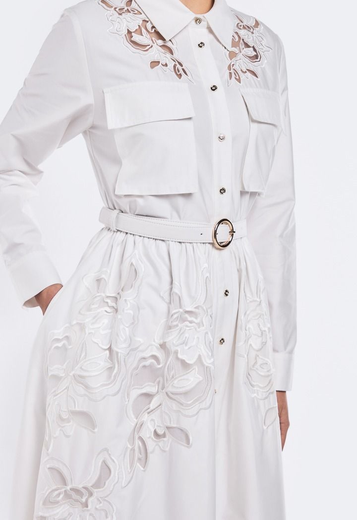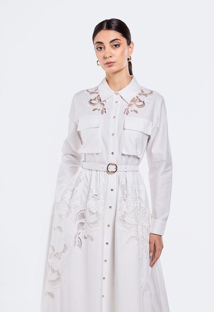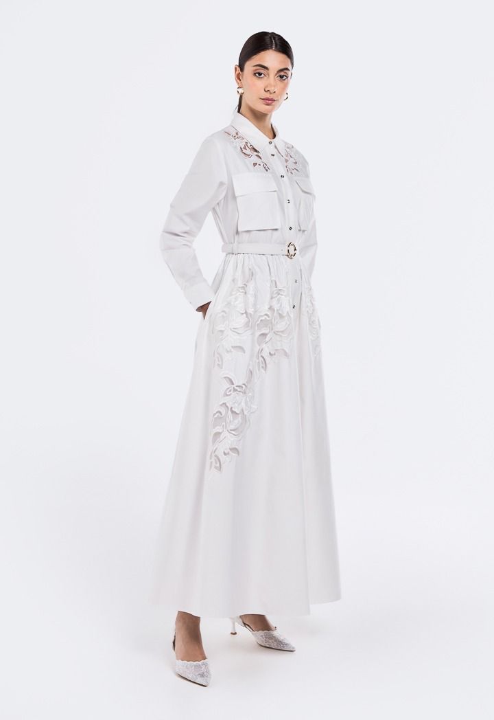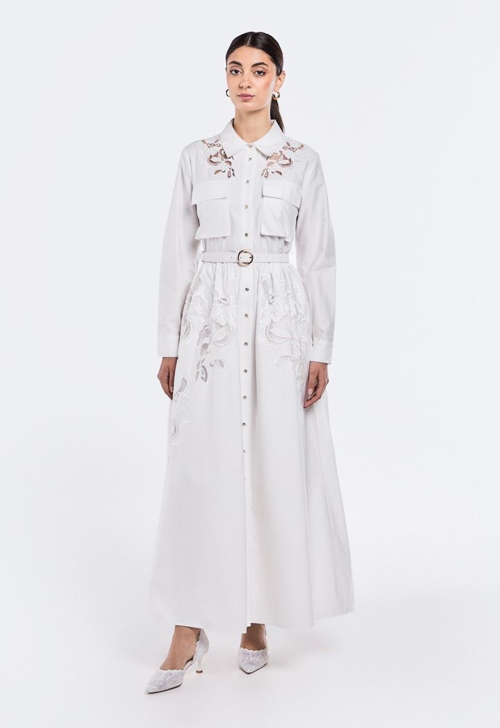 This modest Belted Dress is an exquisite choice for a special occasion. The sleek, tailored silhouette features floral embroidery and an optional belt.