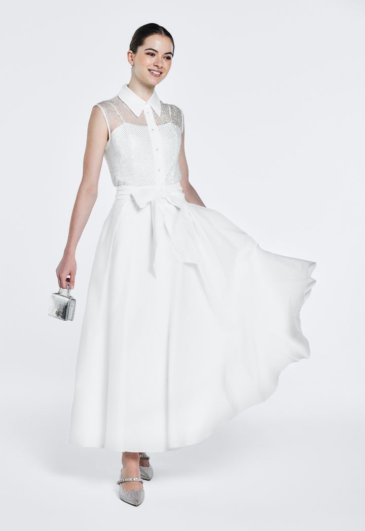 Design : Solid, Pleated, Flared, Attached Lining, Side Pockets, Belted