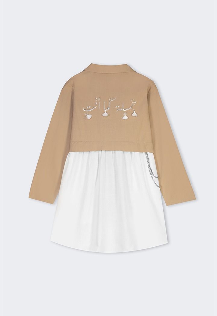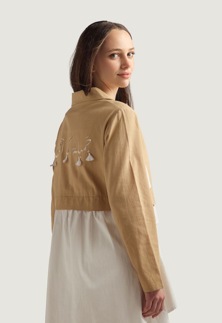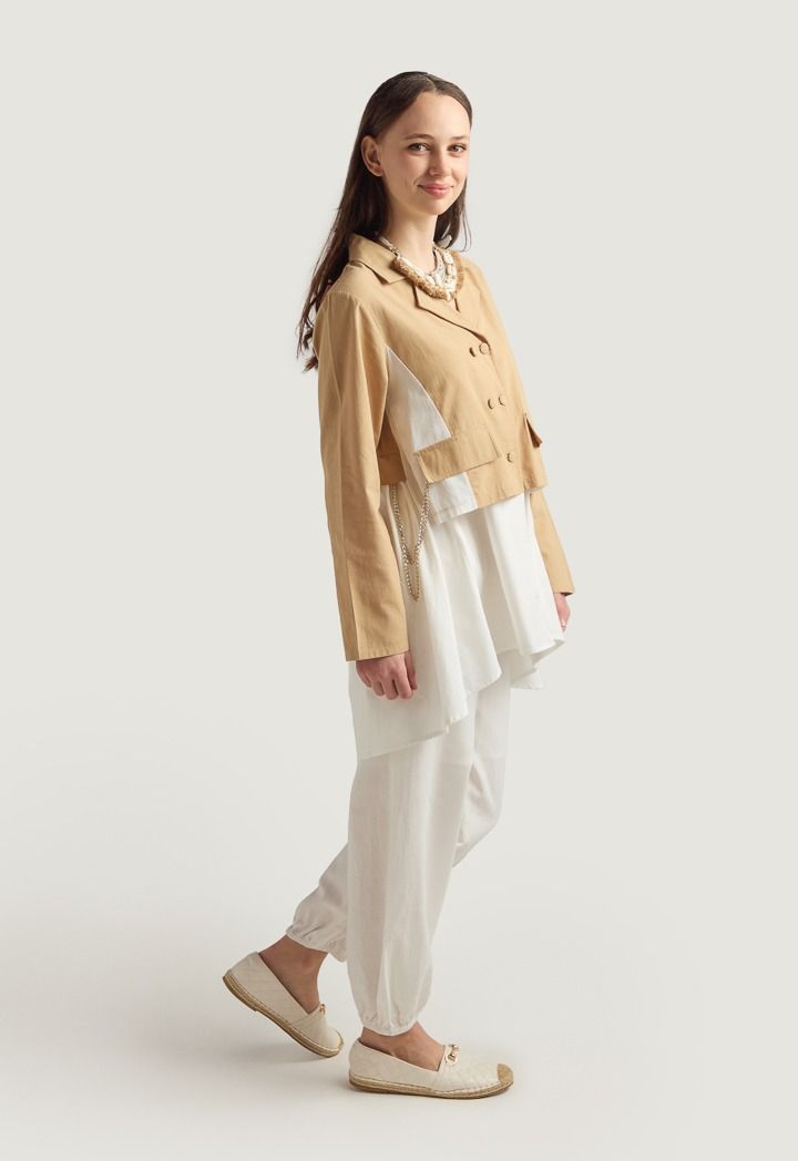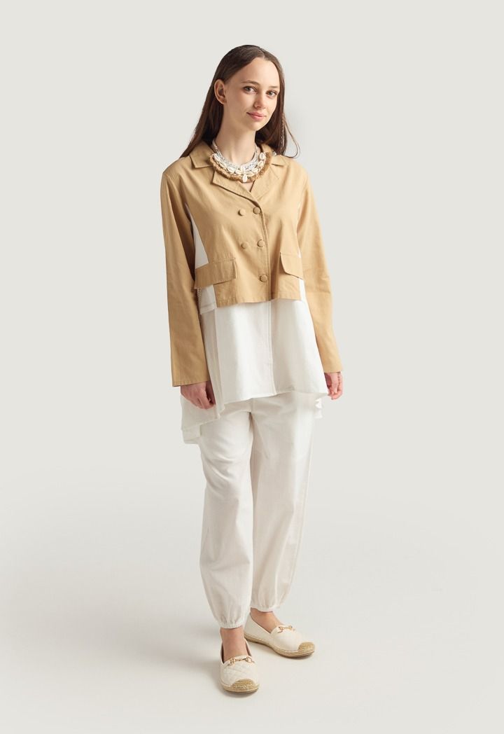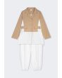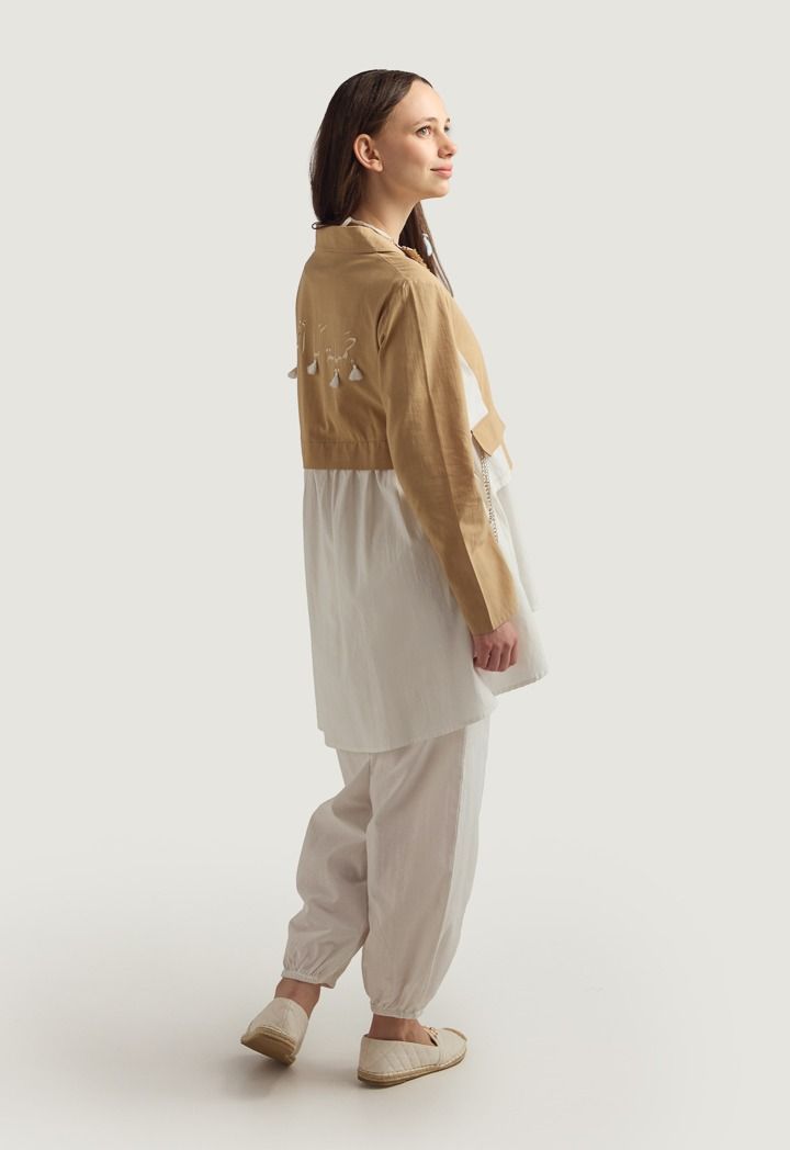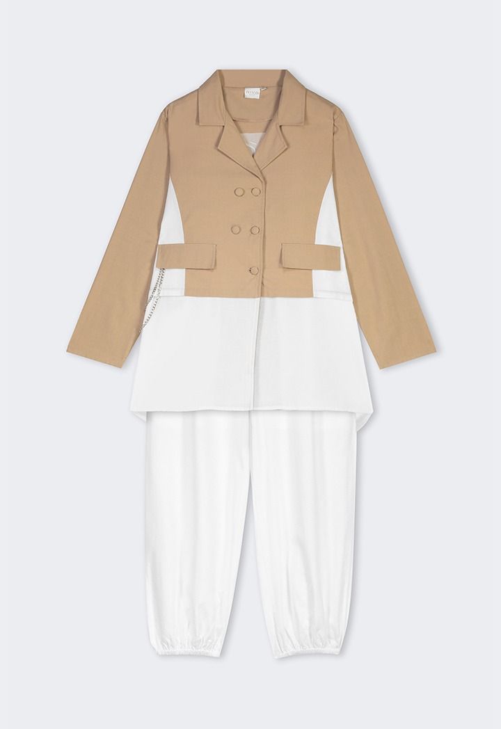 A set that supports an Arabic letter embellished two toned blazer and an elastic waist pair of pants.
