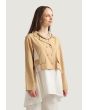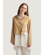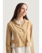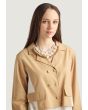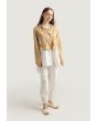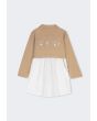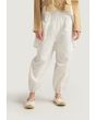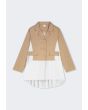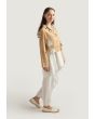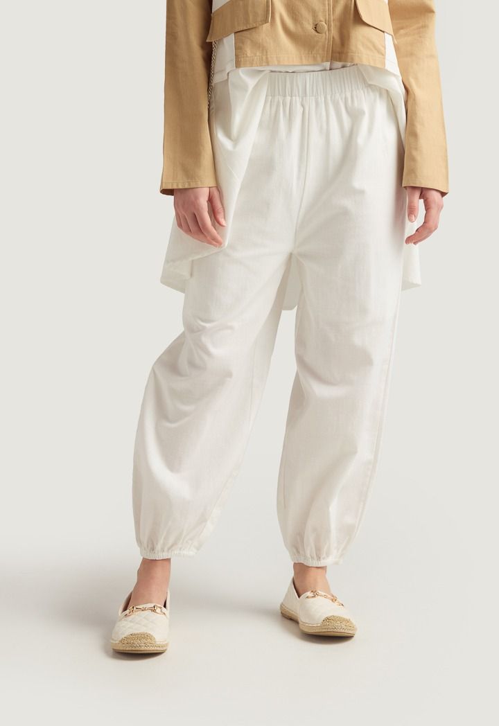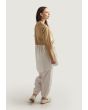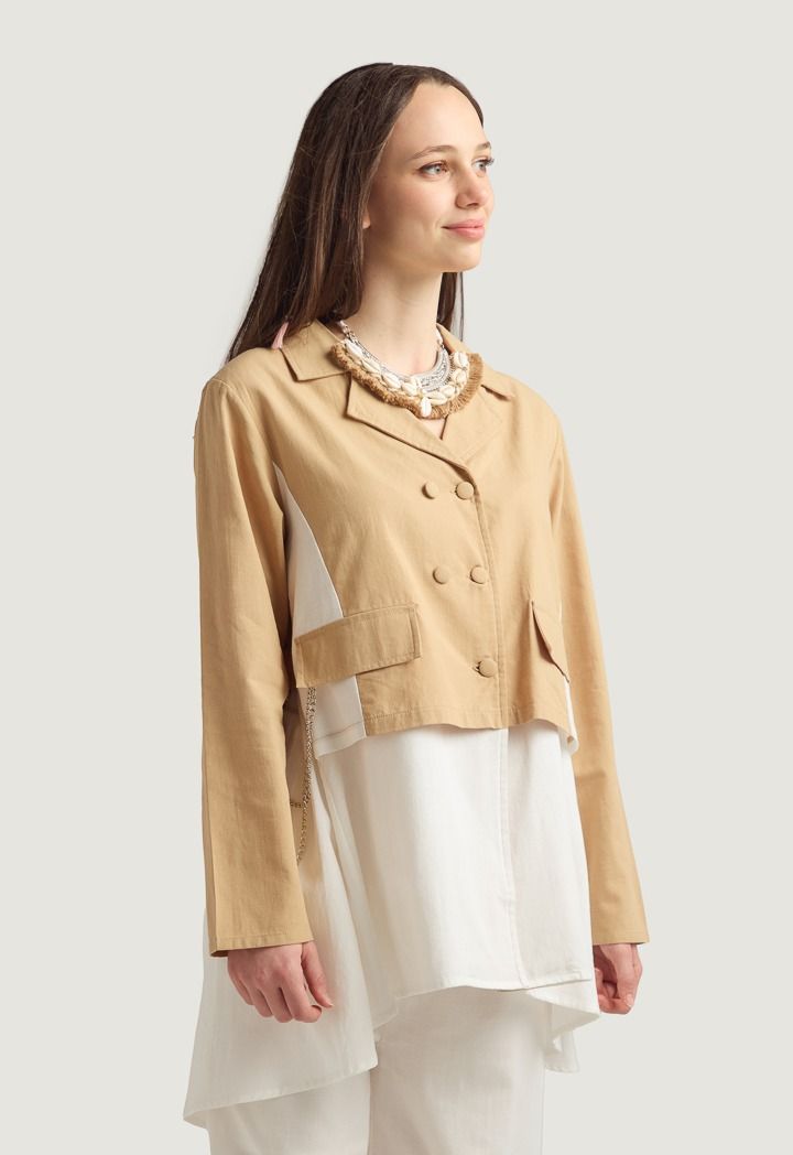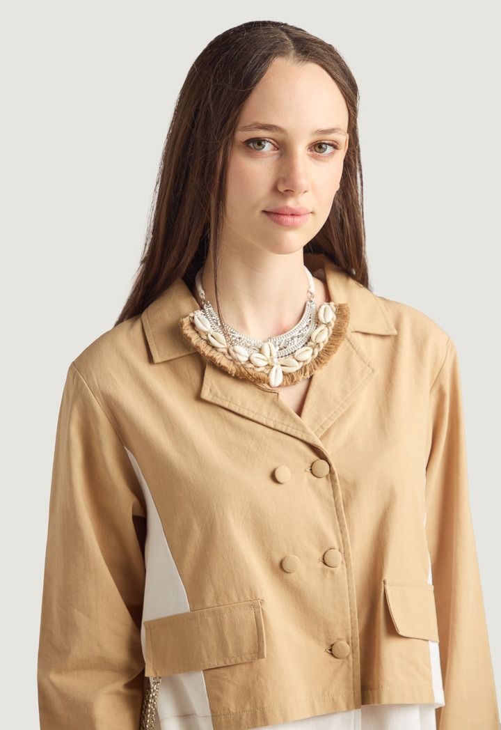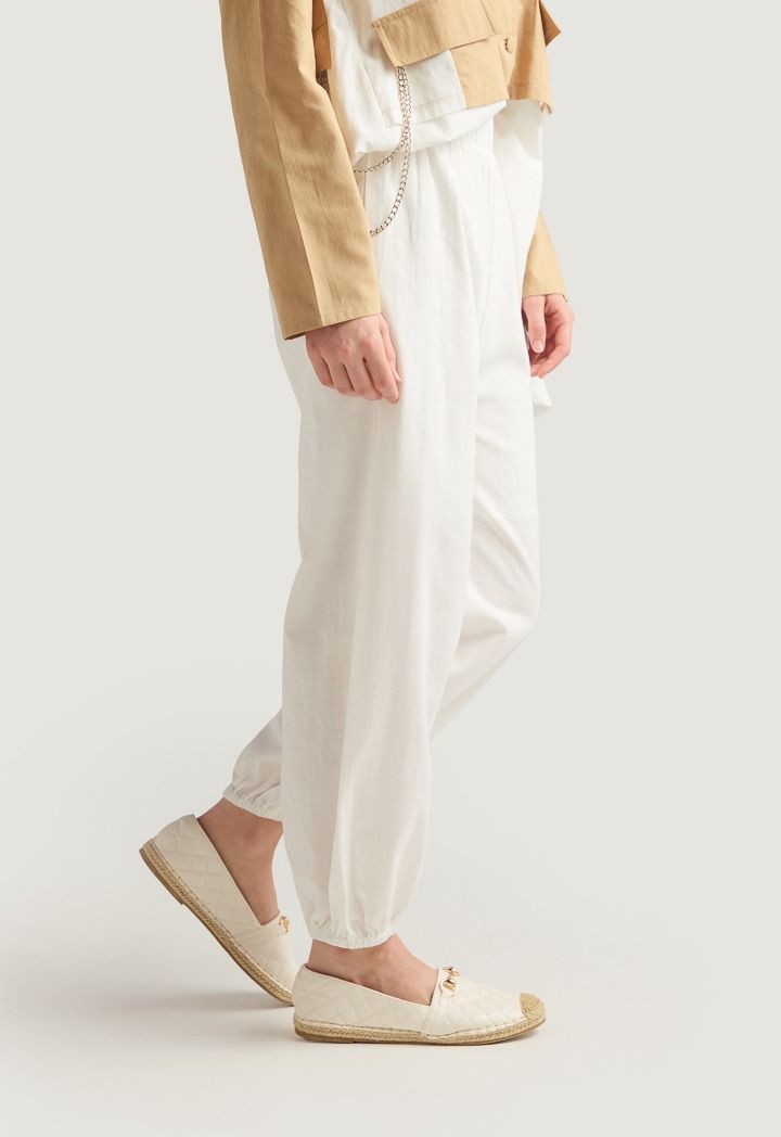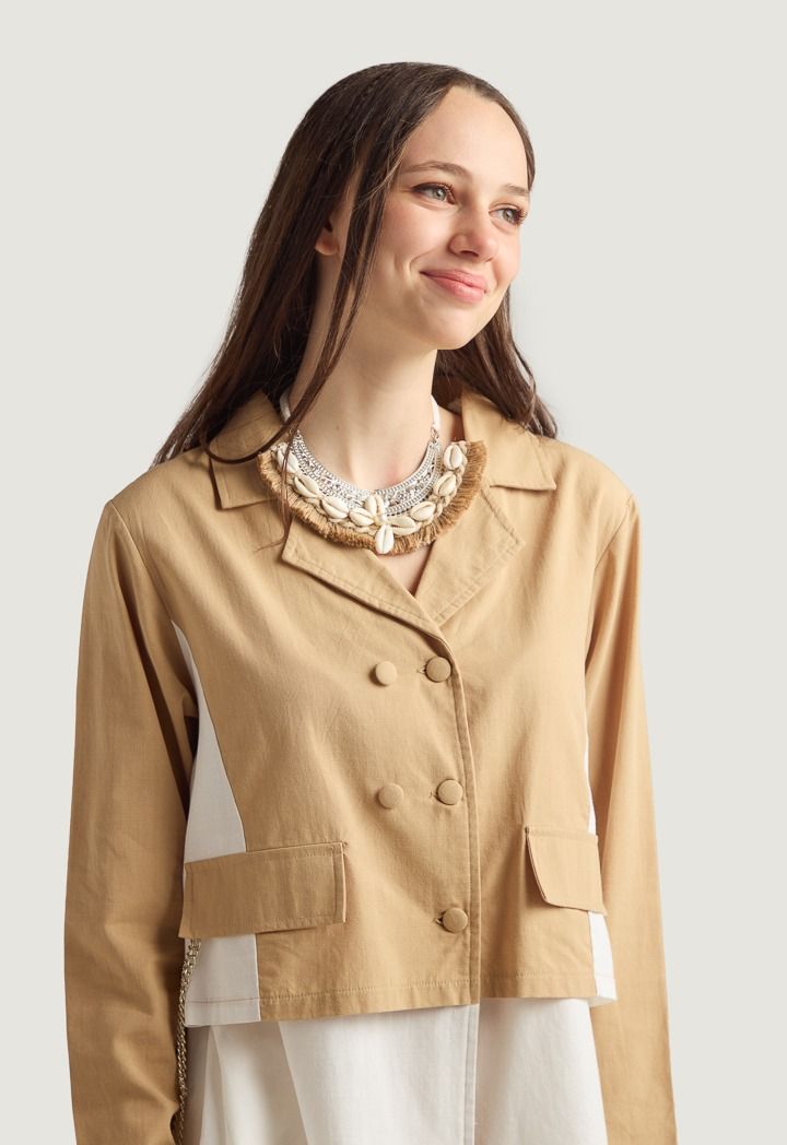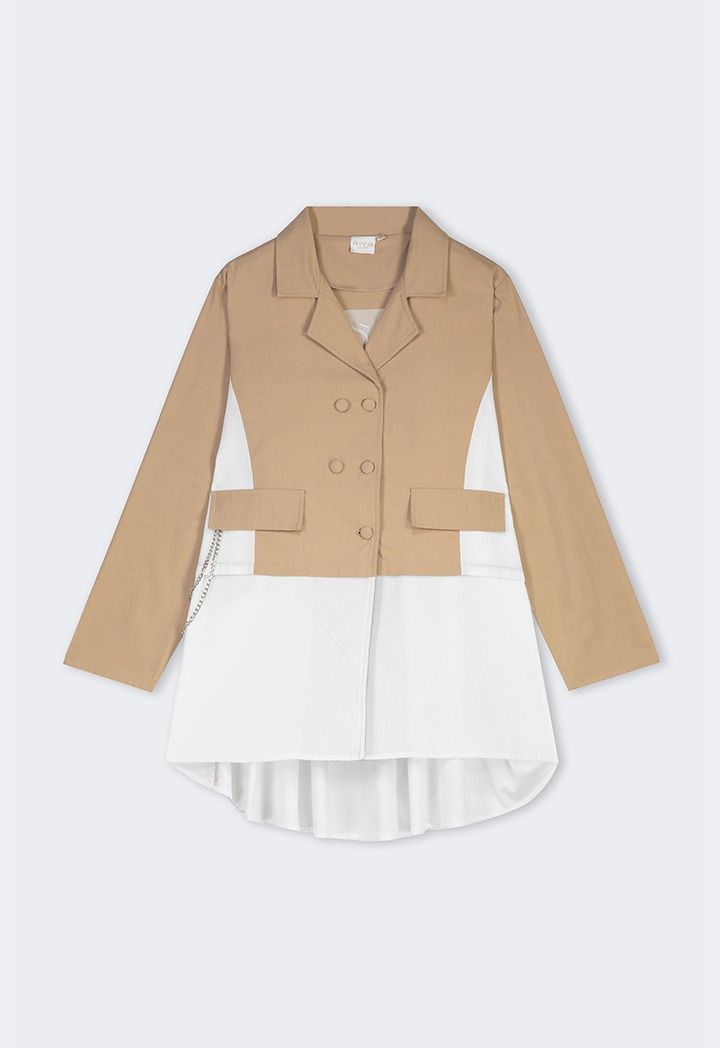 A set that supports an Arabic letter embellished two toned blazer and an elastic waist pair of pants.