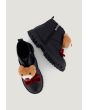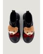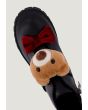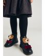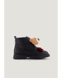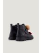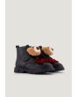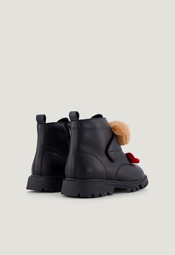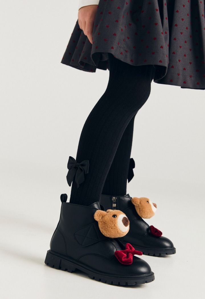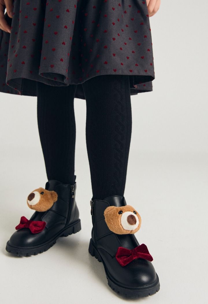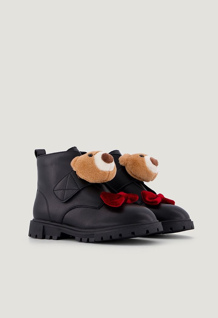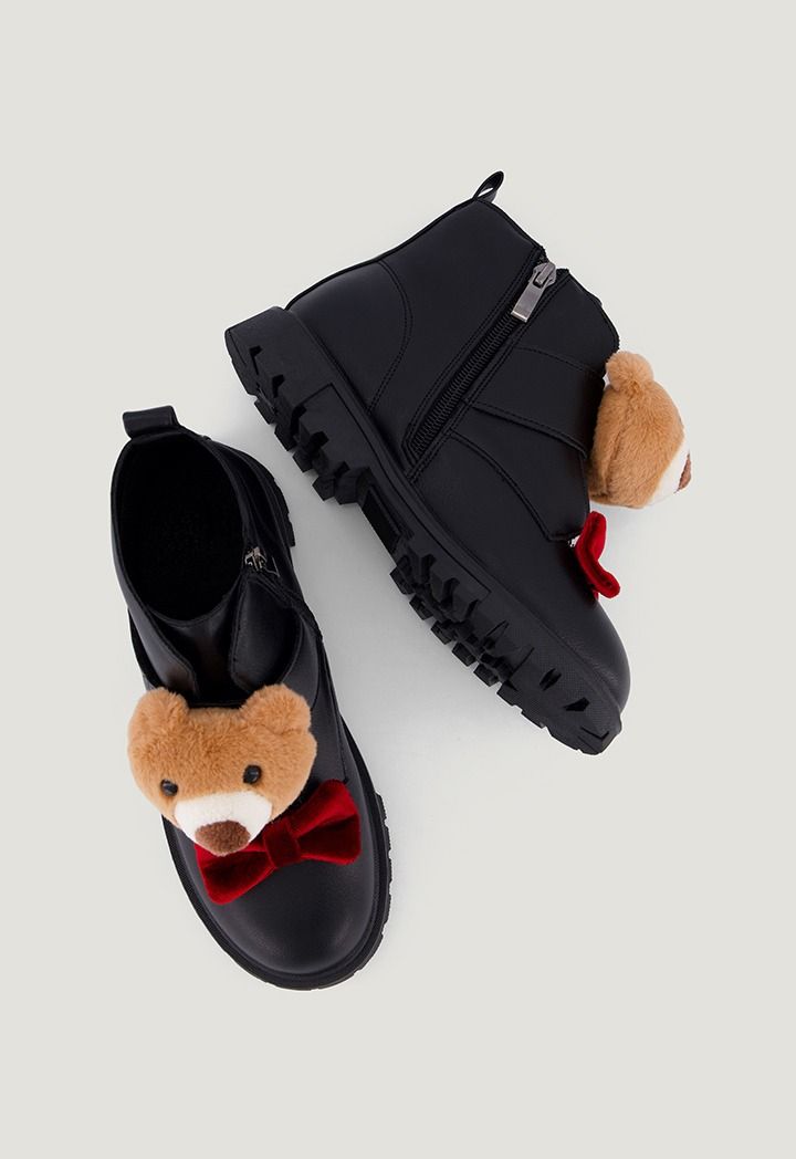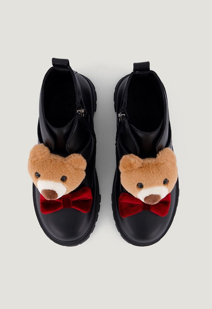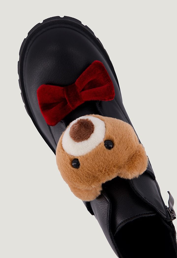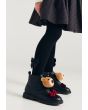 A pair of winter boots that feature an embellished design with a bow and a bear.