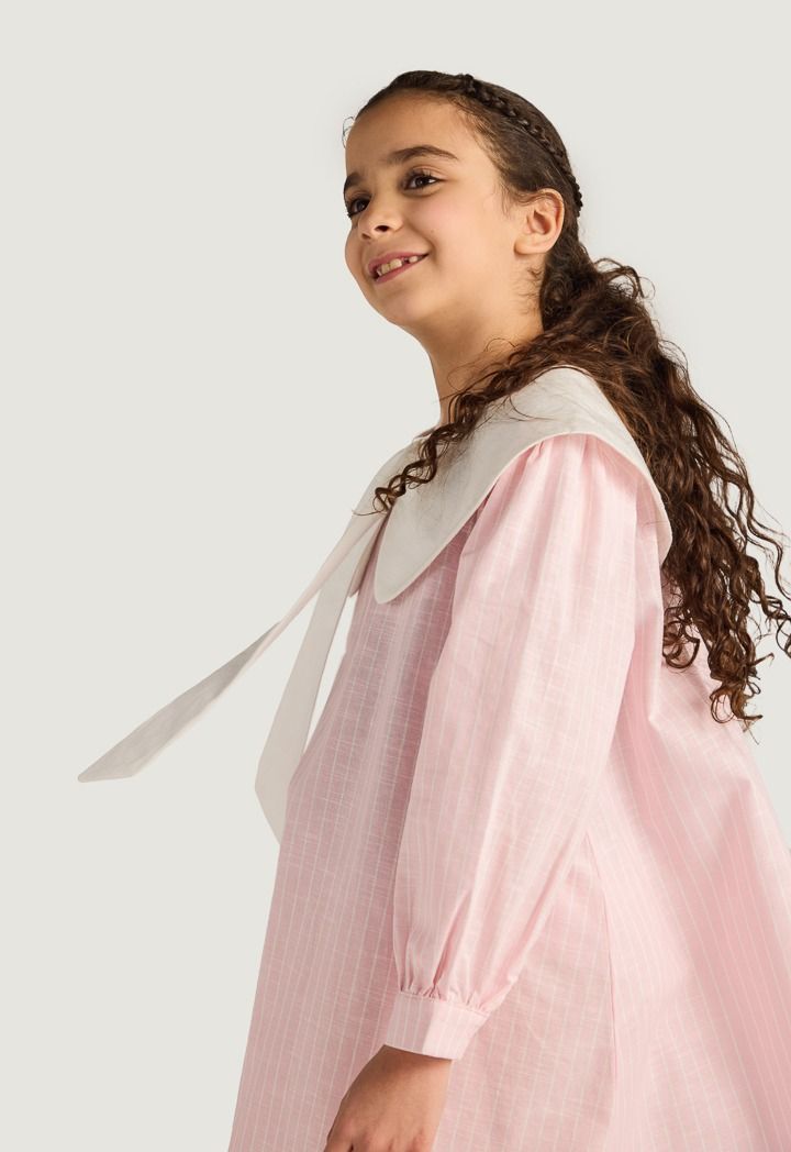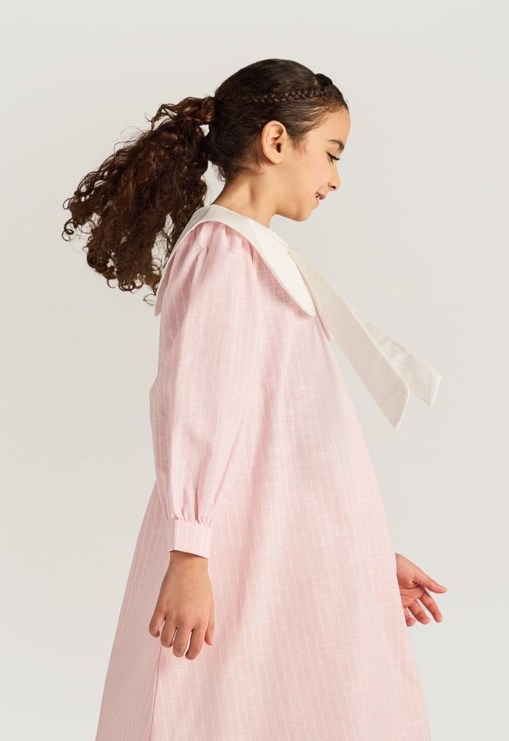 A striped dress that features a dramatic peter pan collar with a bow.