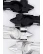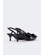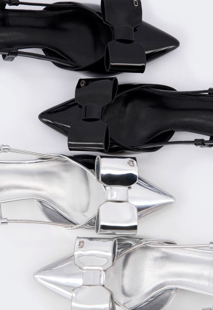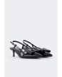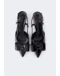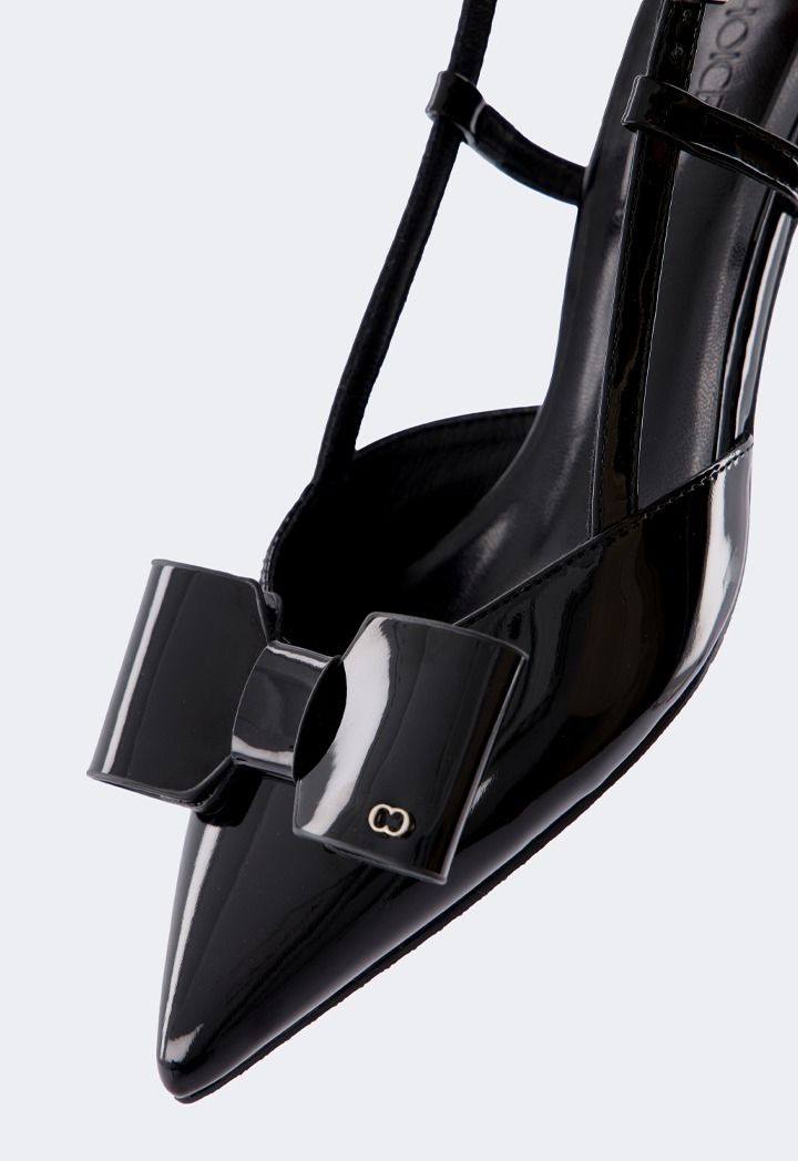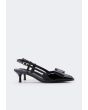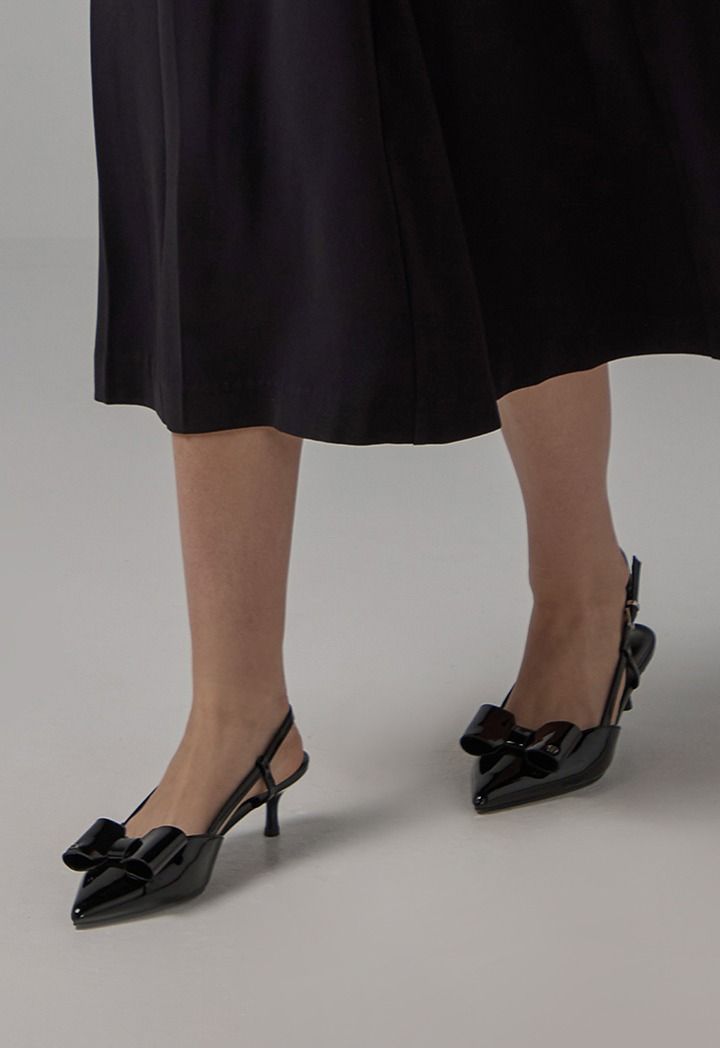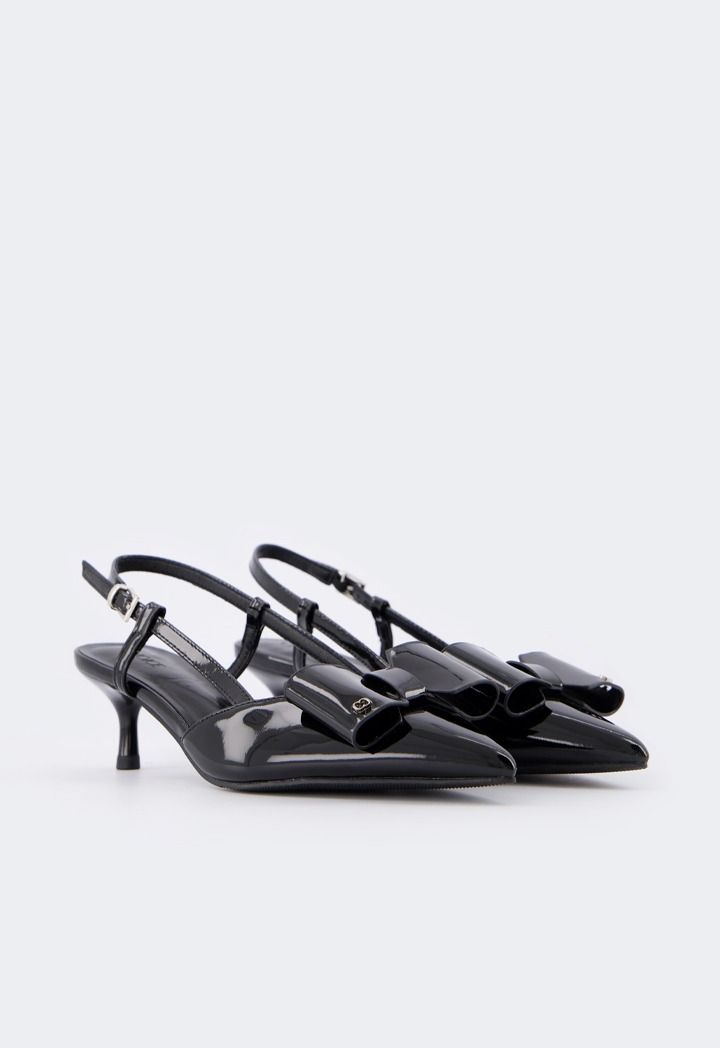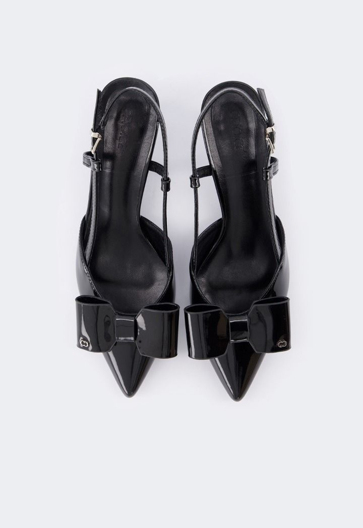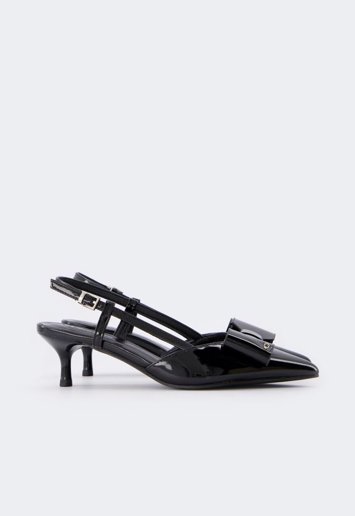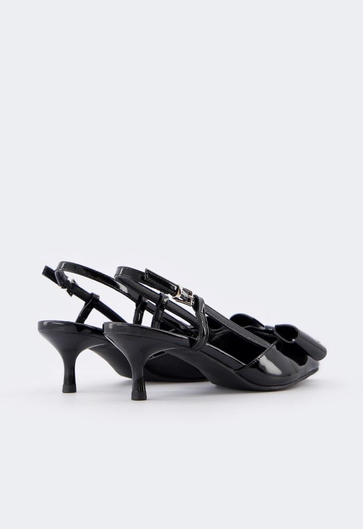 A pair of modern heels that features a glossy buckled strap design that is on trend.