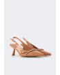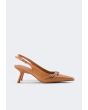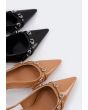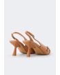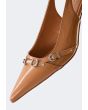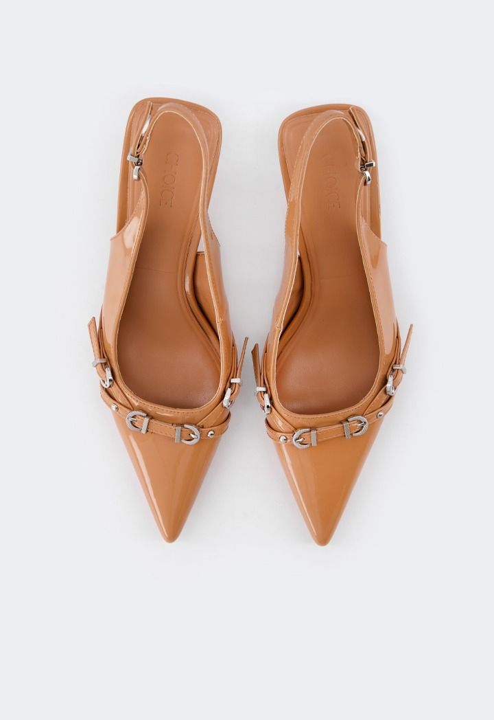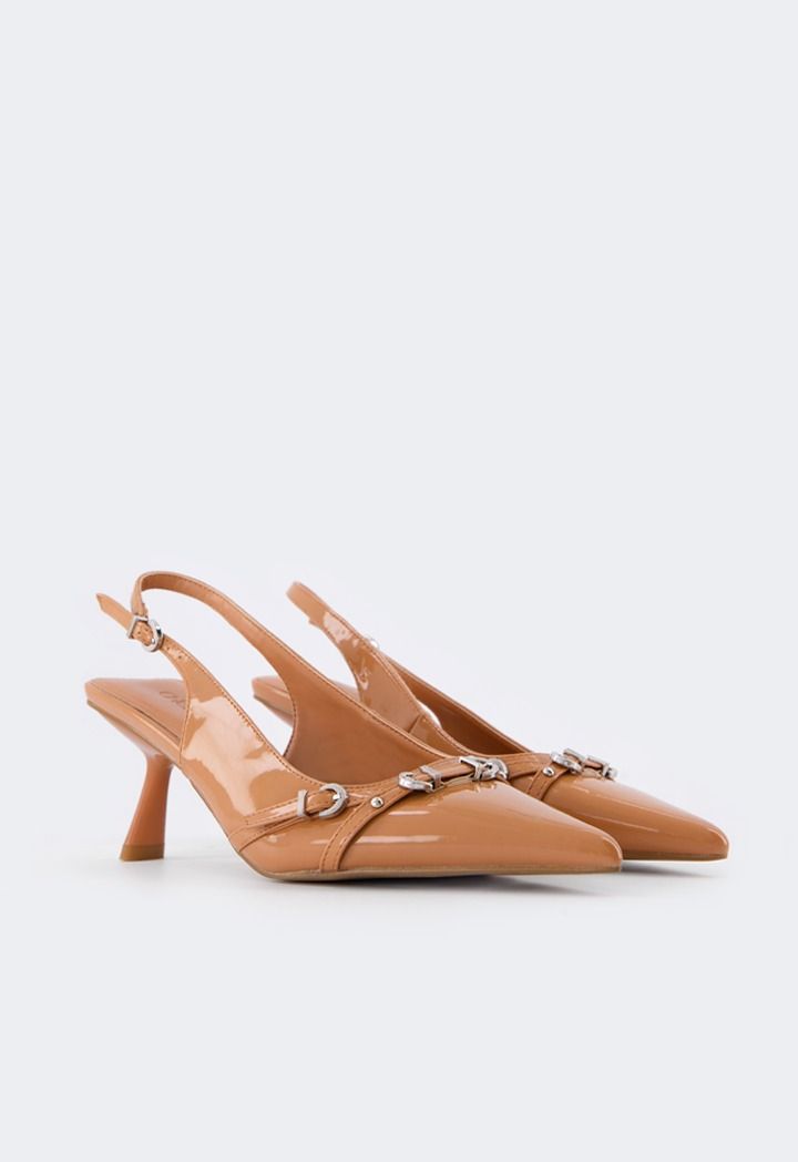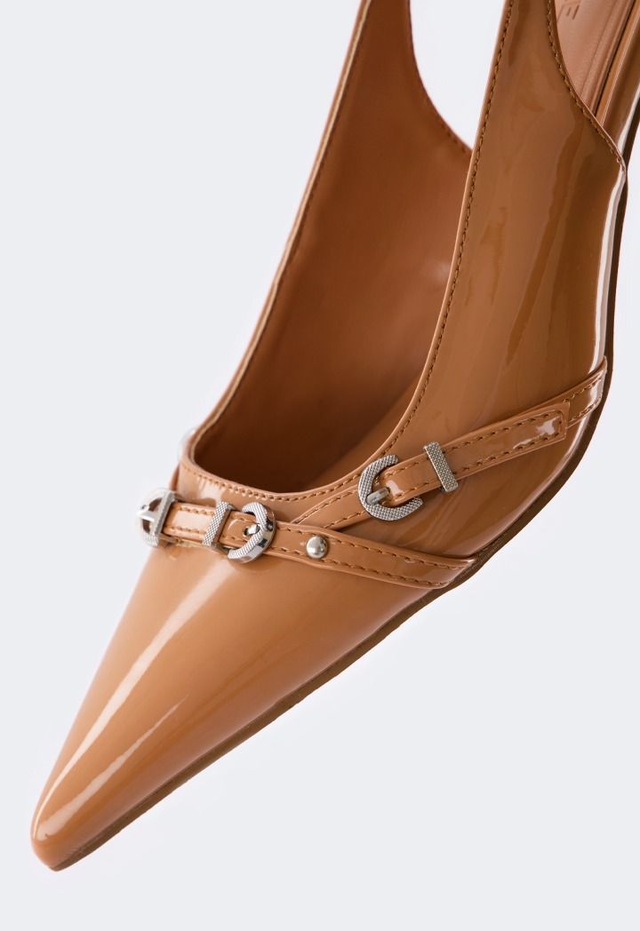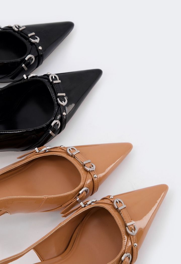 A pair of modern heels that features a glossy buckled strap design that is on trend.
