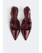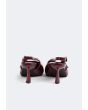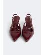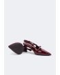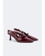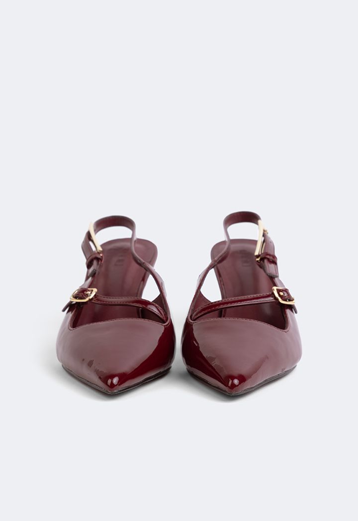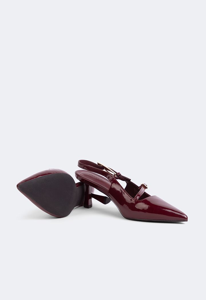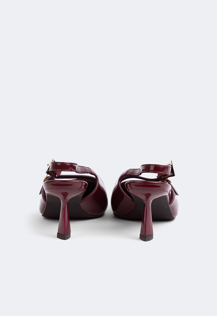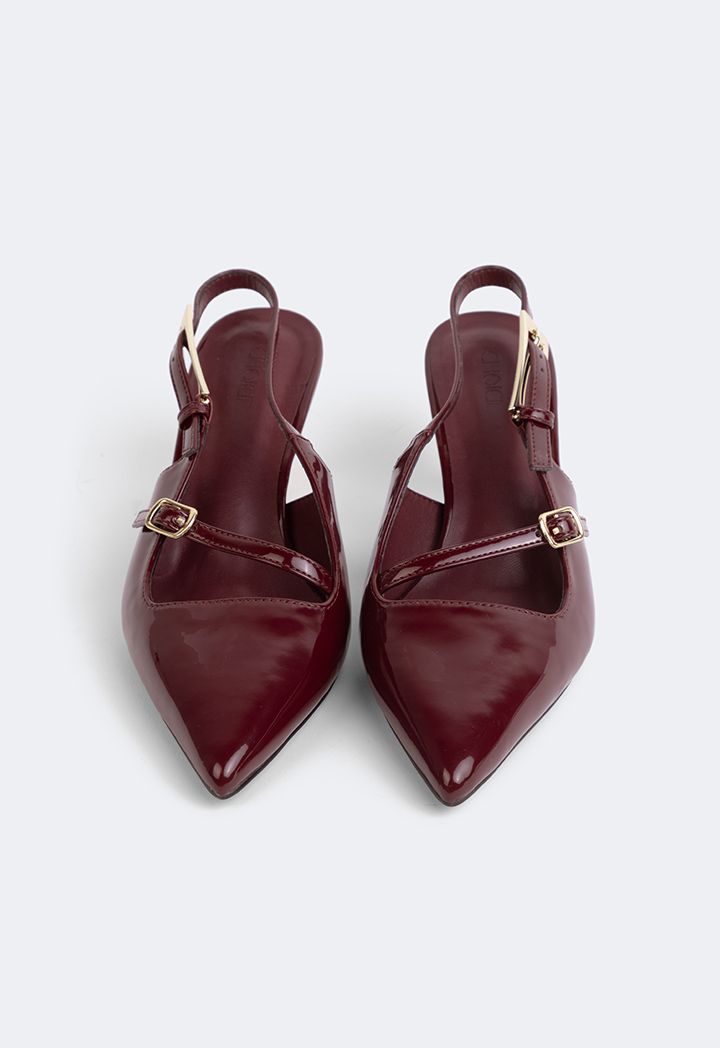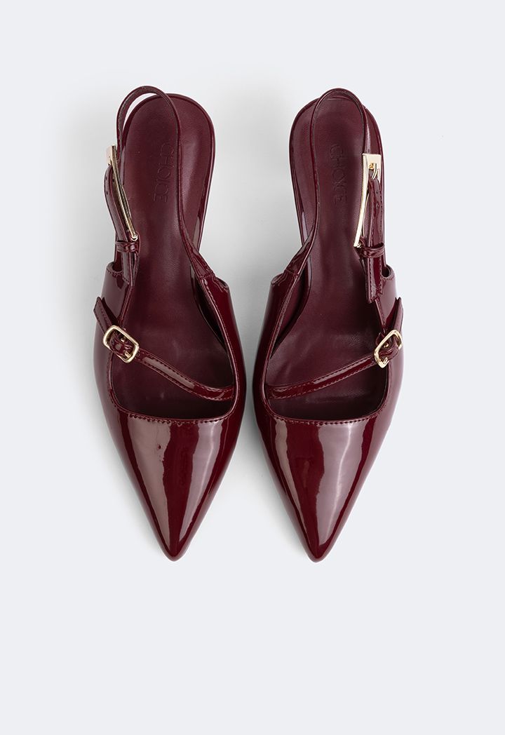 A pair of modern heels that features a glossy buckled strap design that is on trend.