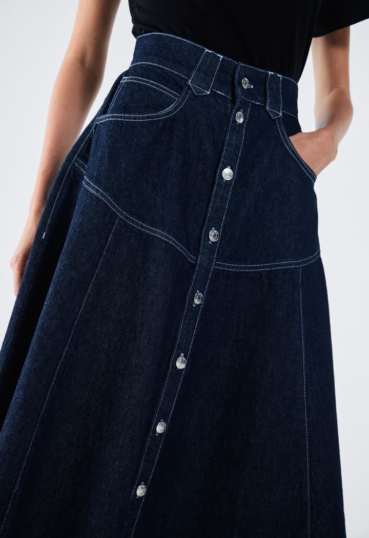 Design: Button Embellished, Flared, Denim, Side Pockets