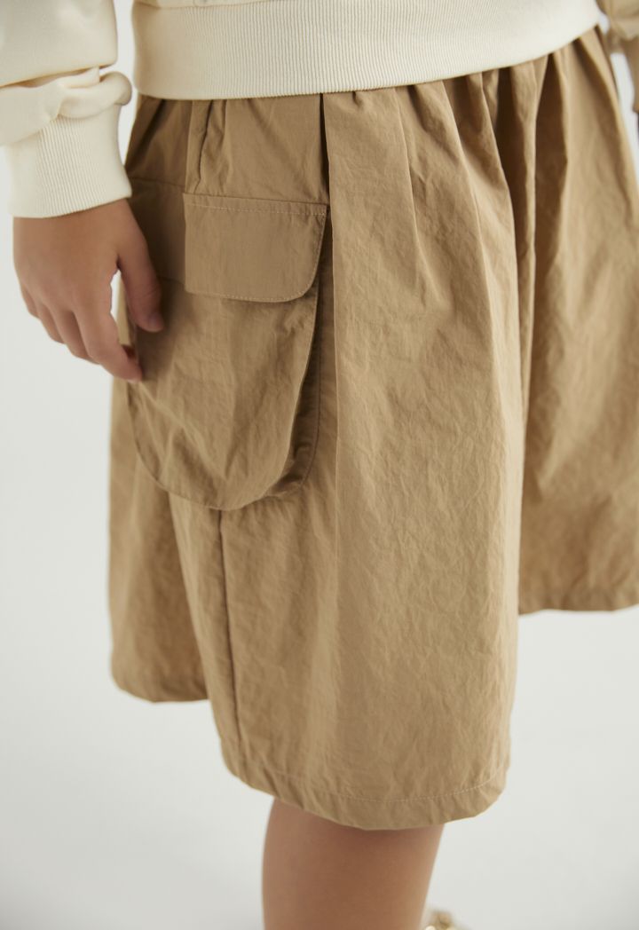 A unique dress design that includes a long sleeved sweatshirt top and a cargo skirt.