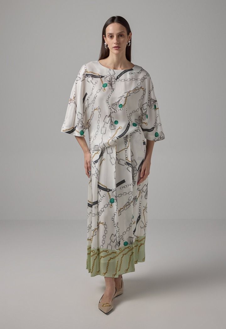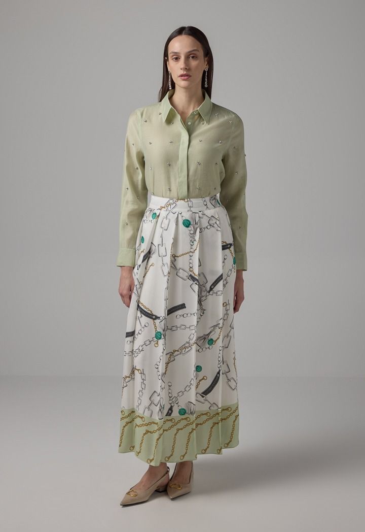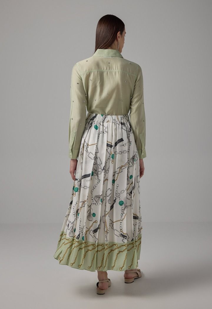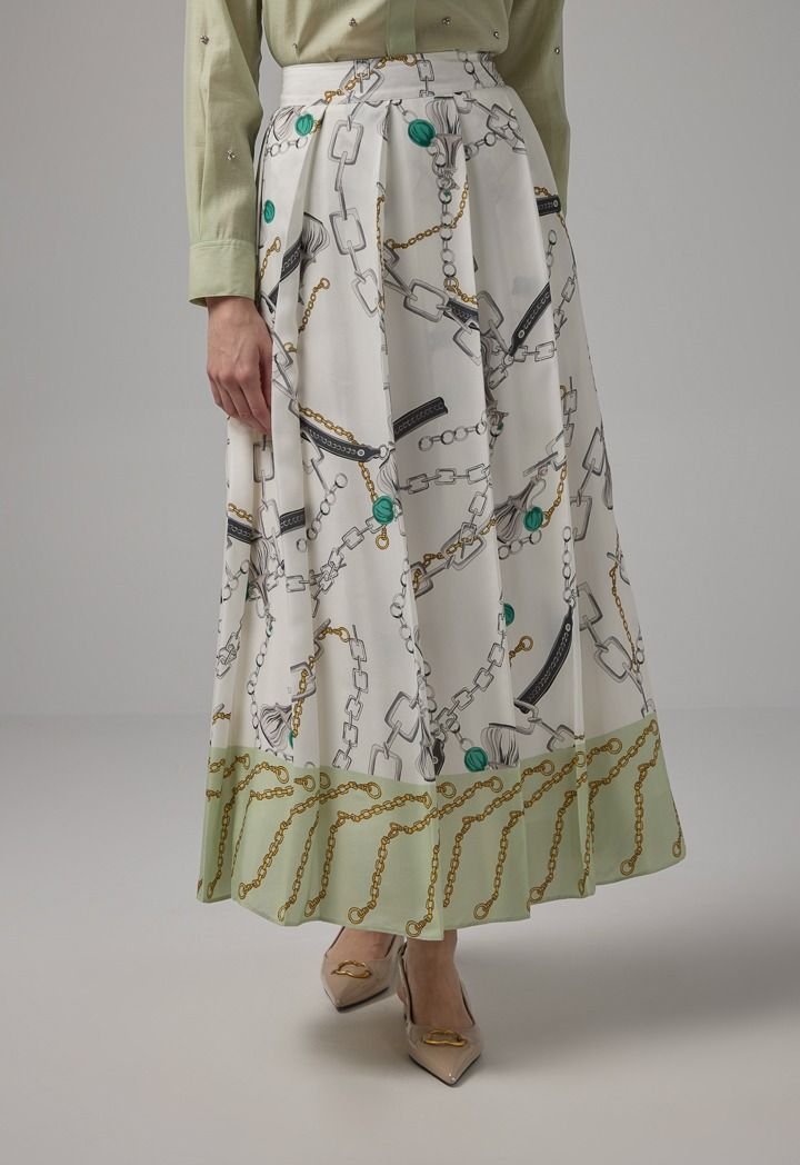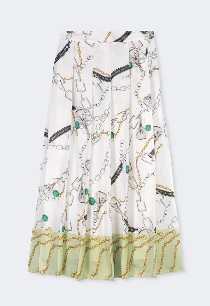 Design: Chain Print, Pleated, Flared, Logo Details, Attached Lining