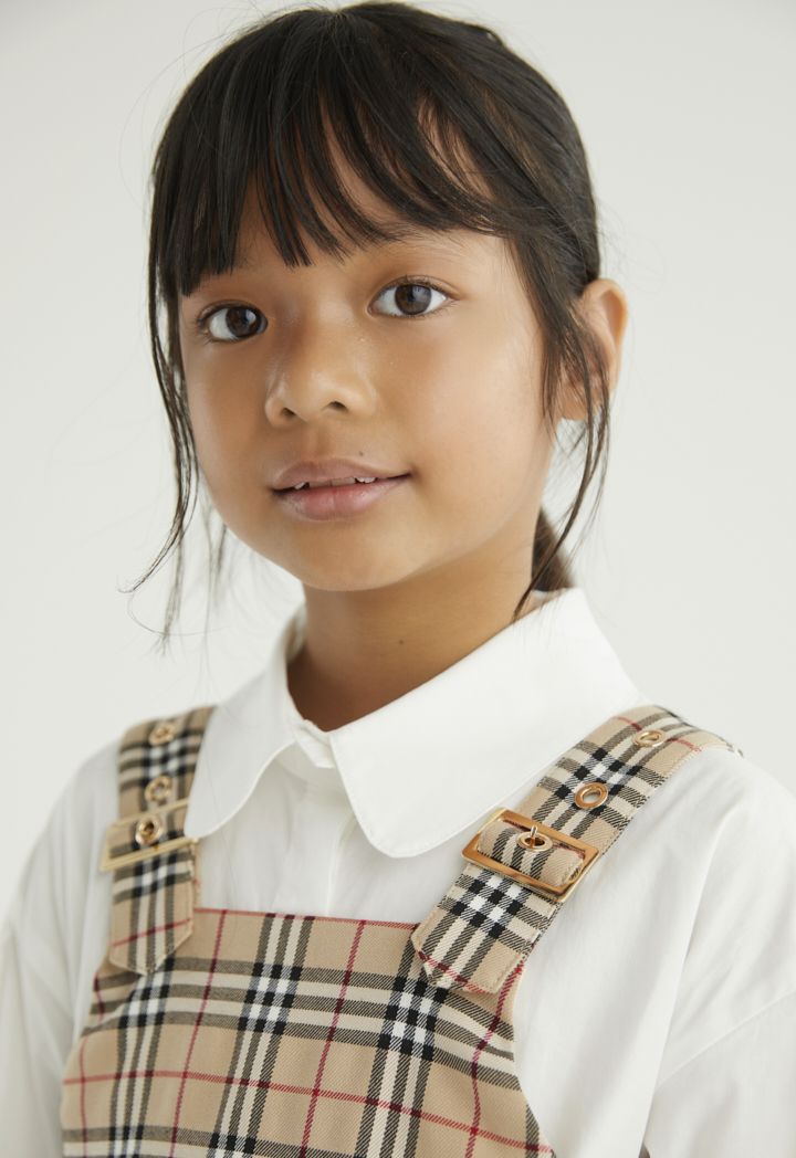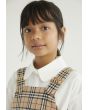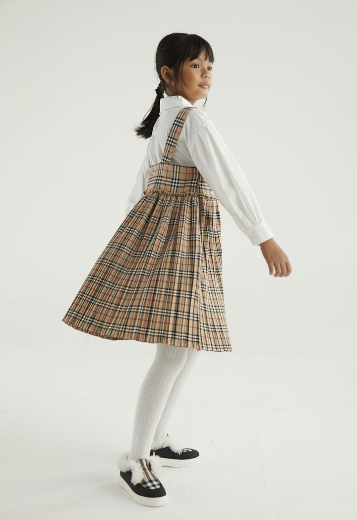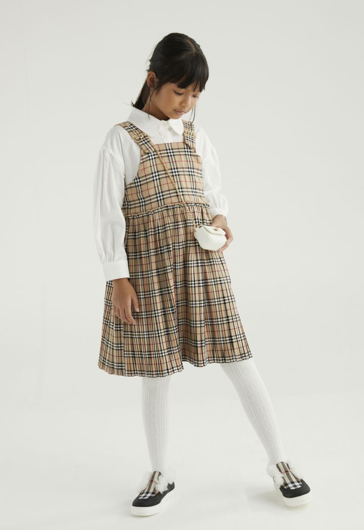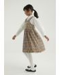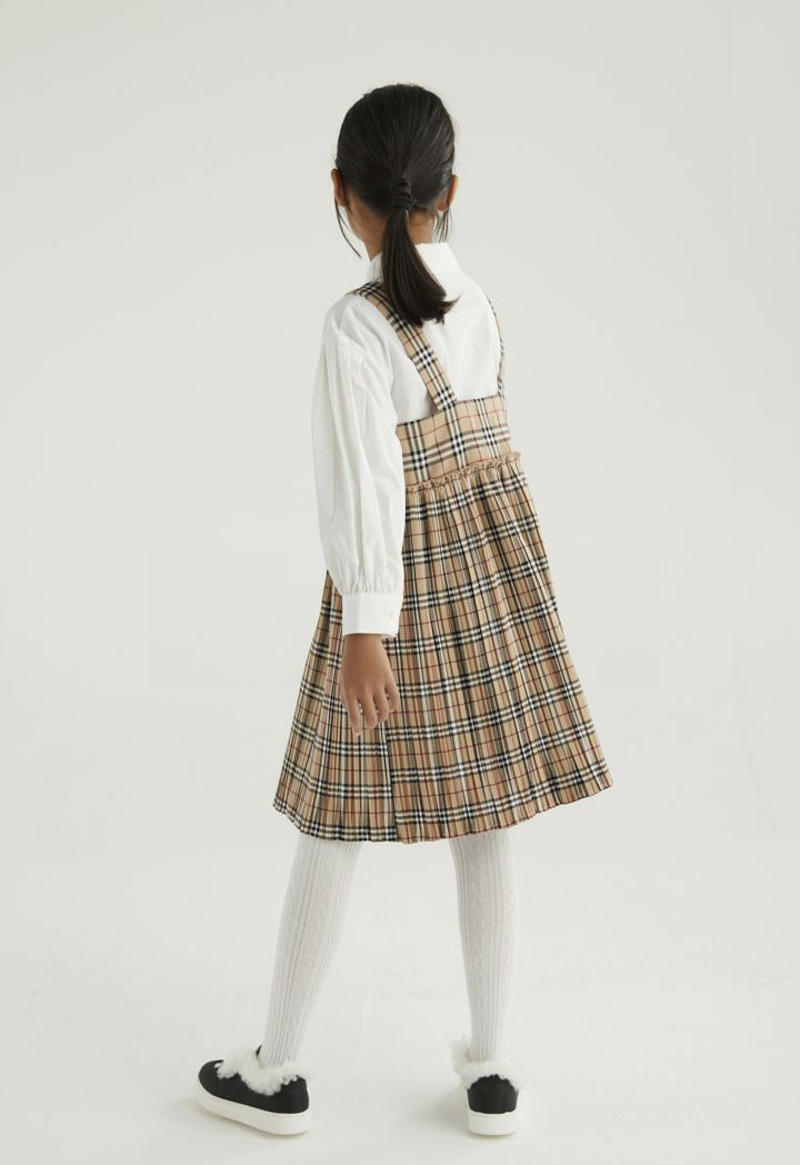 A classic set that features a solid shirt and a sleeveless checkered dress.