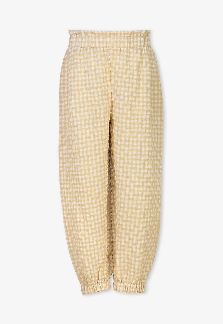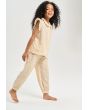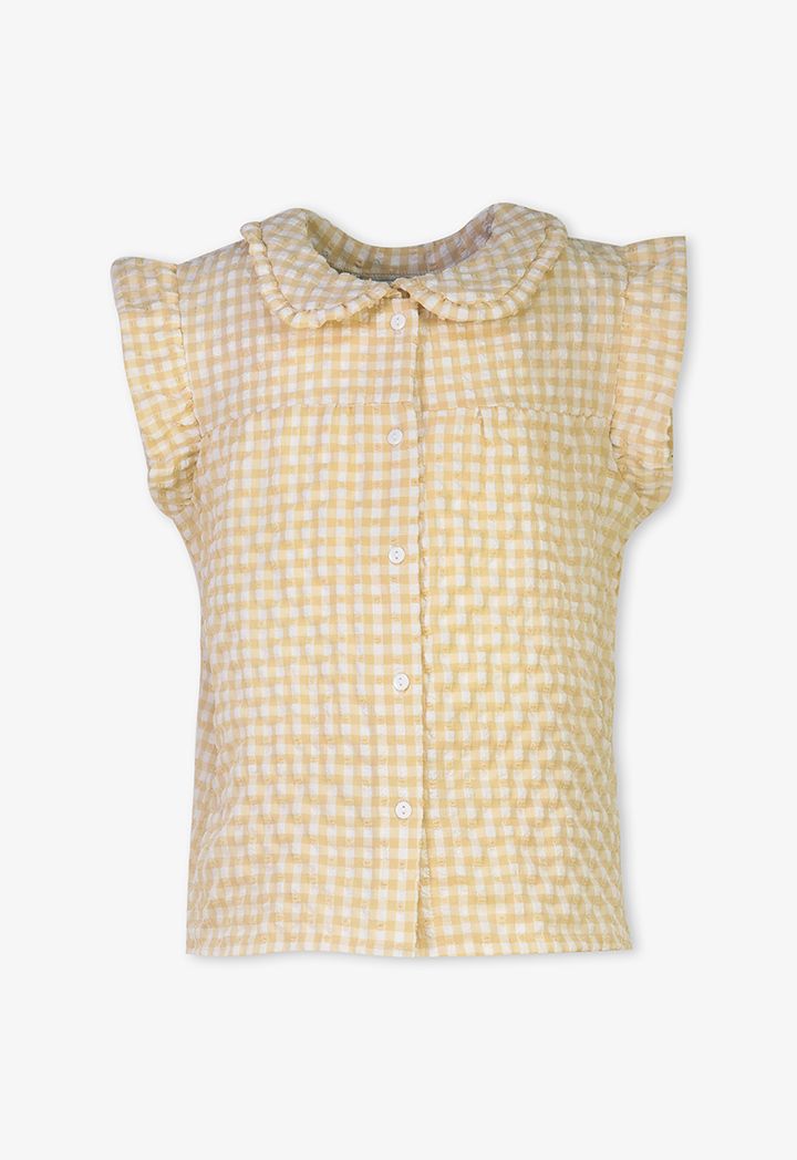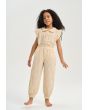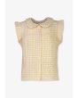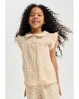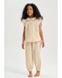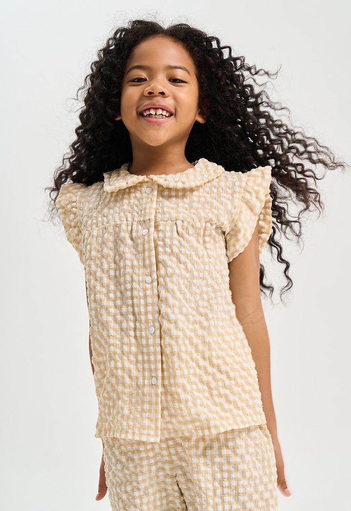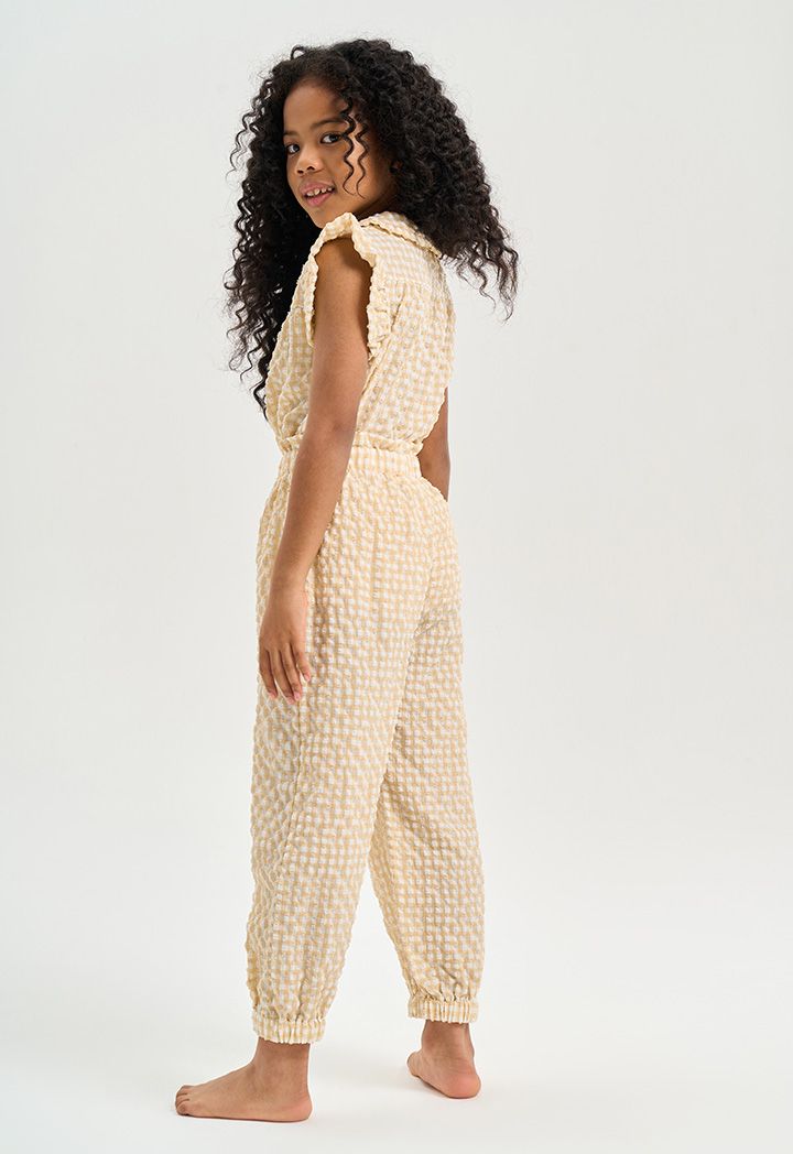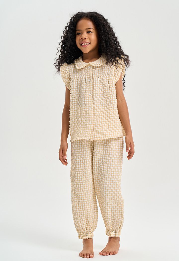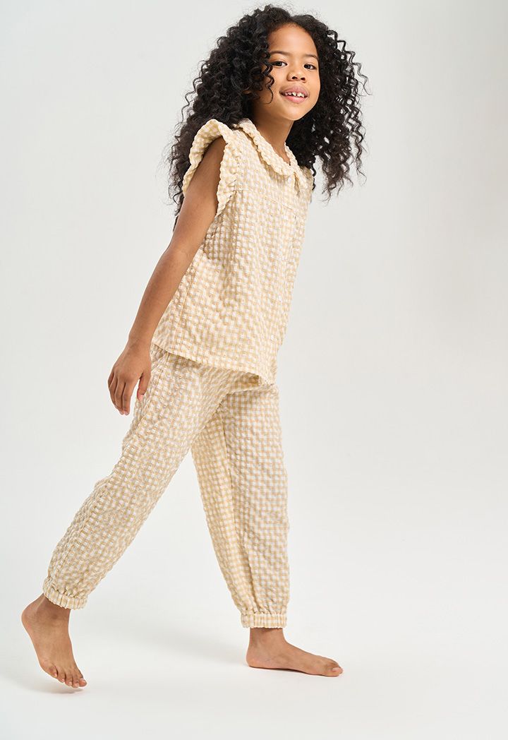 Your young girl's lounging look will be relaxed and sweet with this Checkered Ruffled Pajama set. Shirt with a Sleeveless Ruffled cut, Peter Pan collar buttons down the front. While the pant has an elasticated waistband and elastic hems.