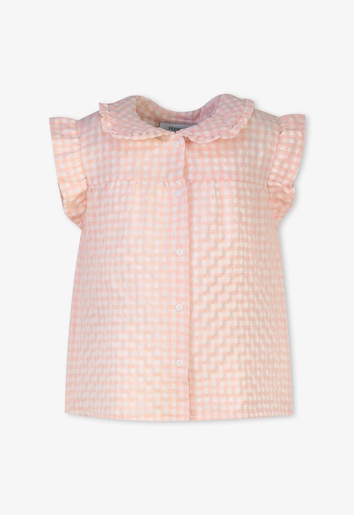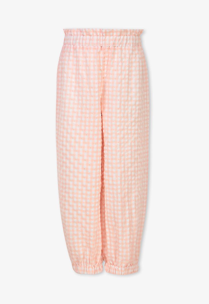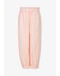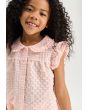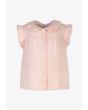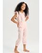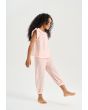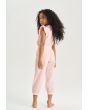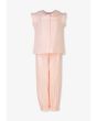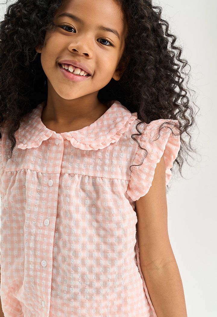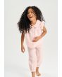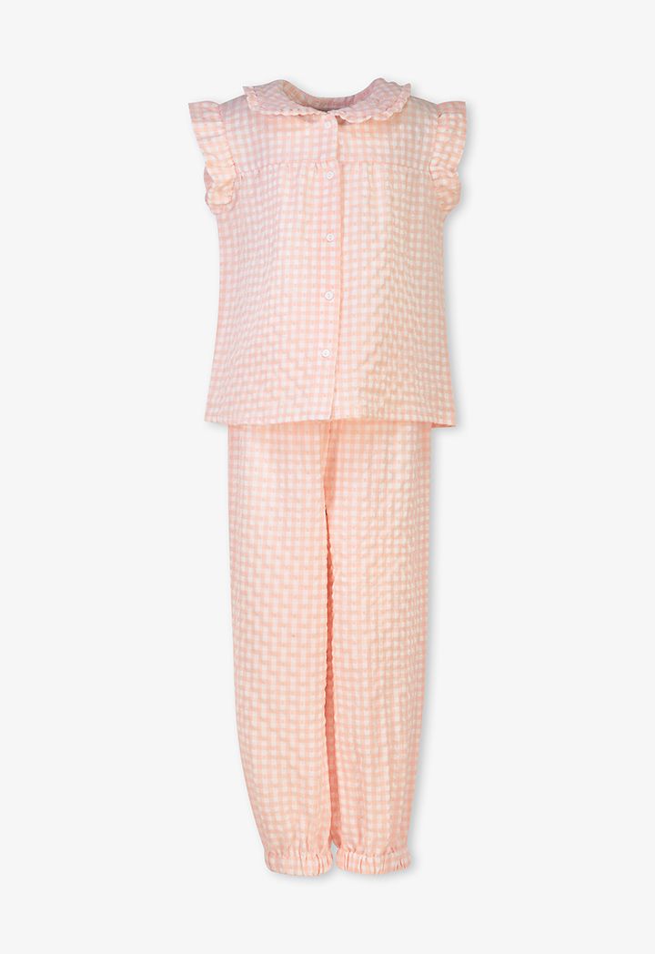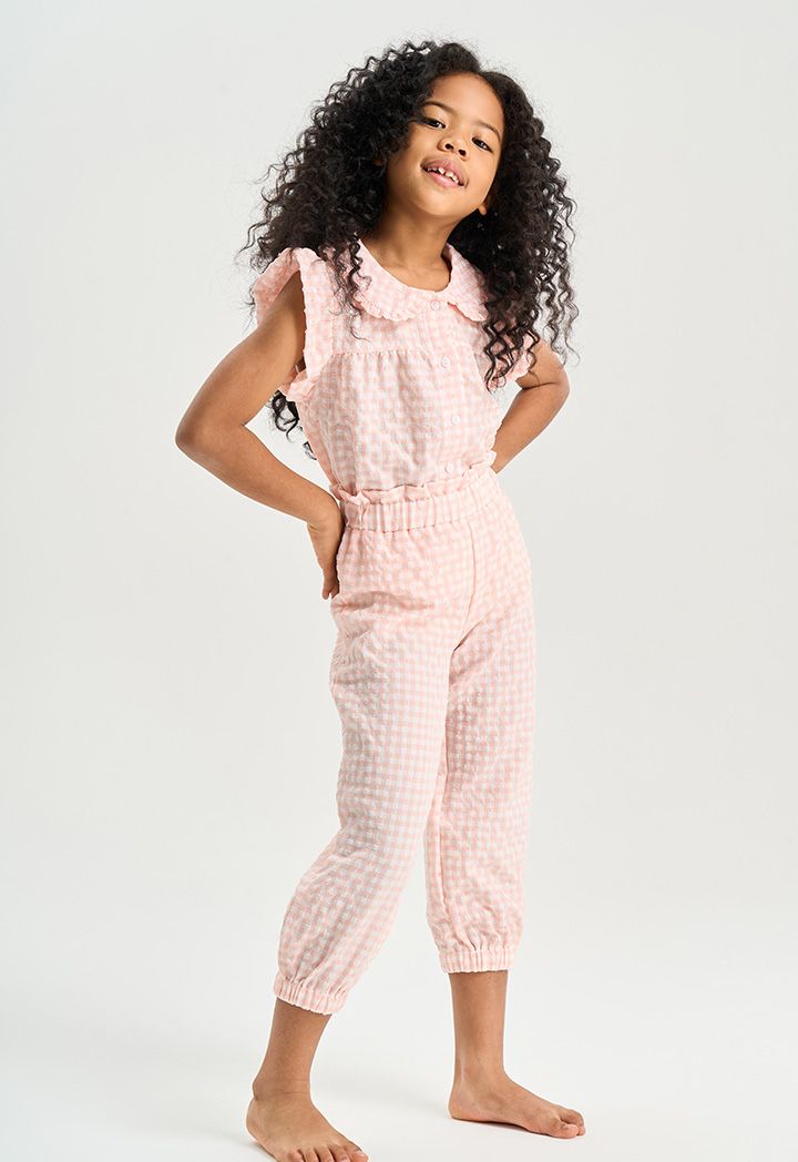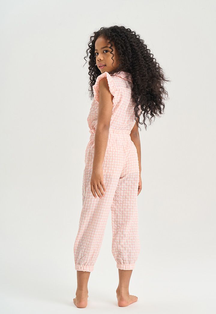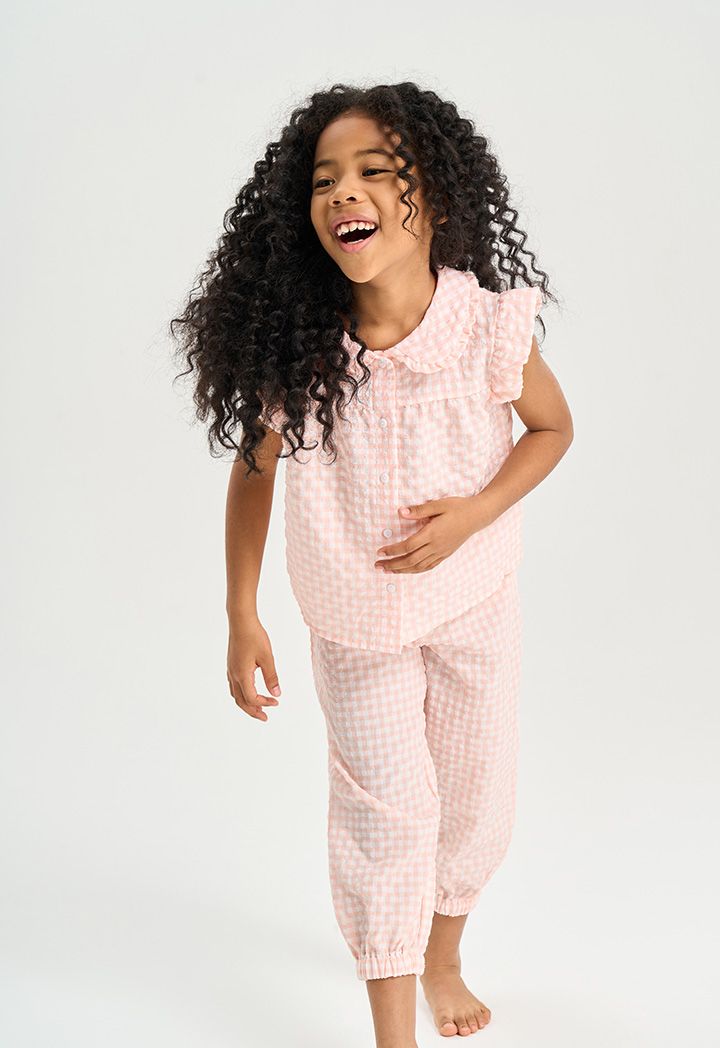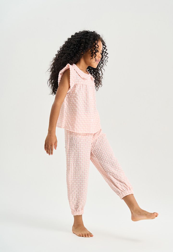 Your young girl's lounging look will be relaxed and sweet with this Checkered Ruffled Pajama set. Shirt with a Sleeveless Ruffled cut, Peter Pan collar buttons down the front. While the pant has an elasticated waistband and elastic hems.
