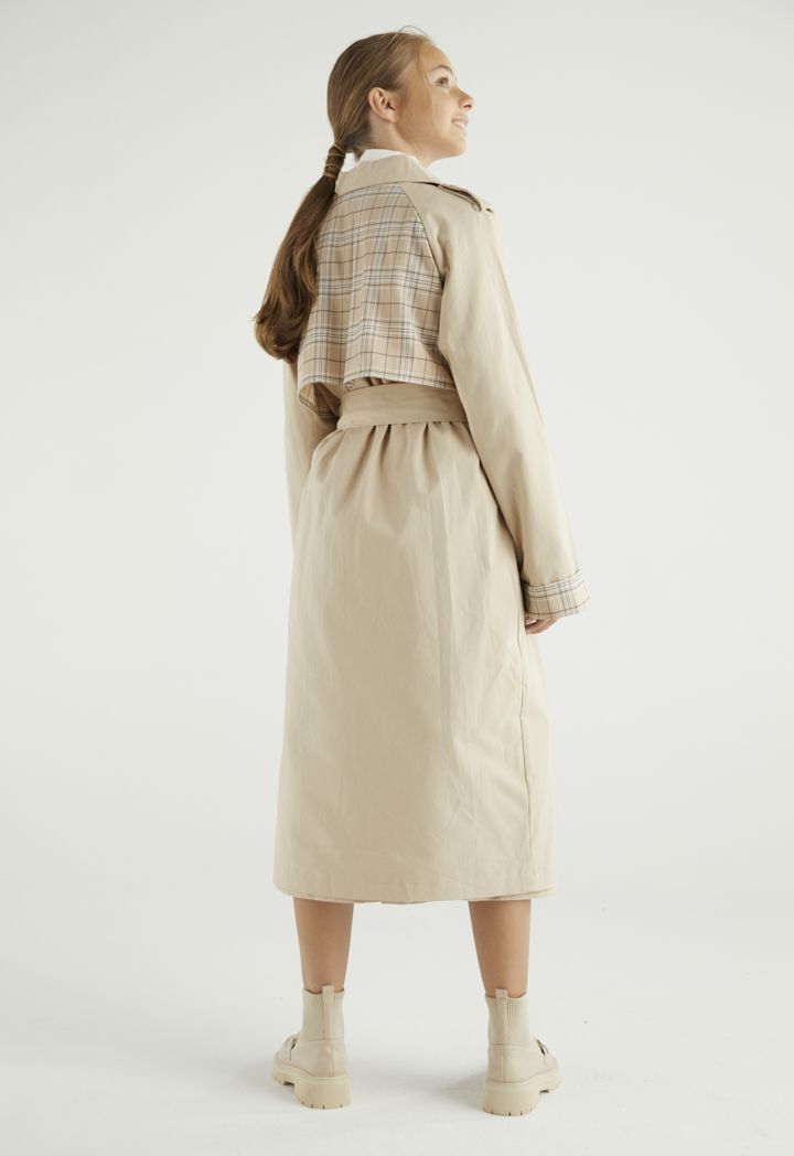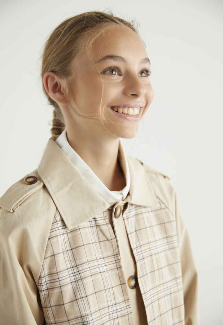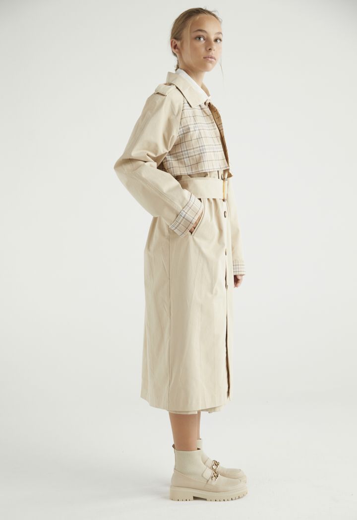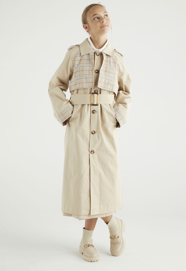 Let your girl say hello to fall with this classic trench coat, featuring a checkered design.