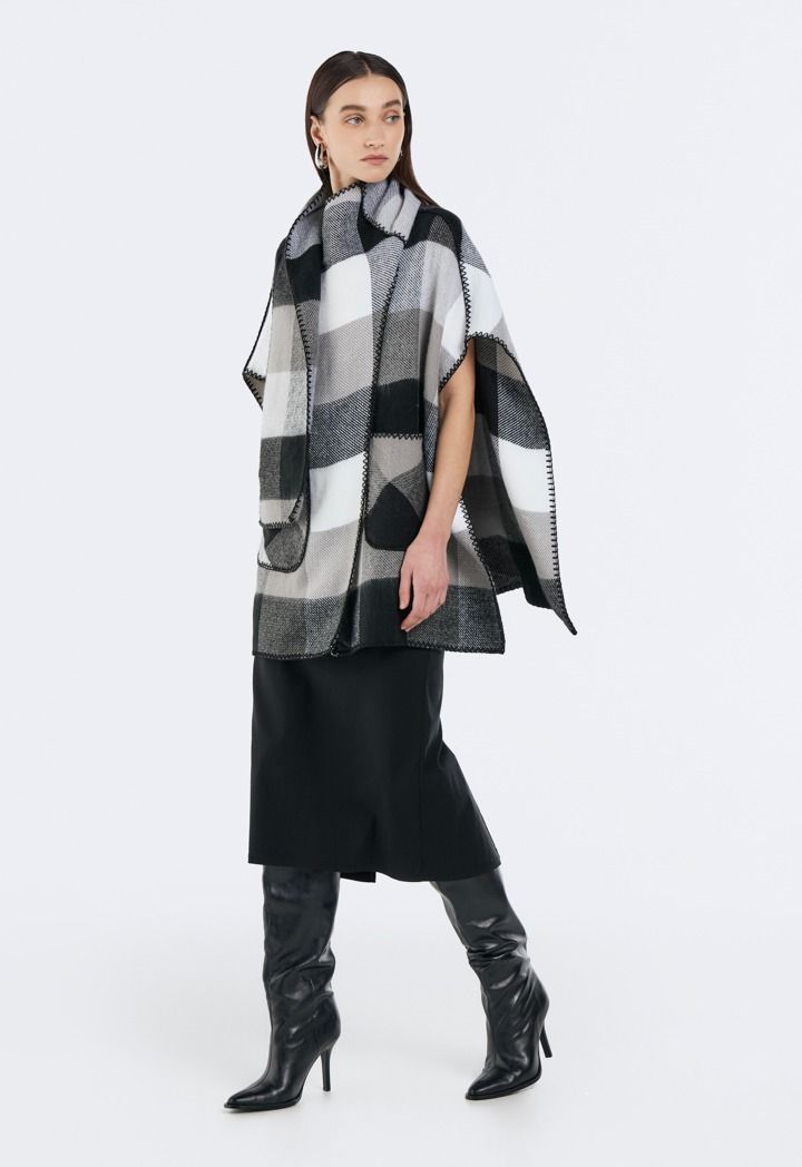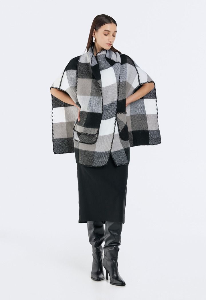 A poncho featuring a checkered pattern that brings playful energy to your outfit.