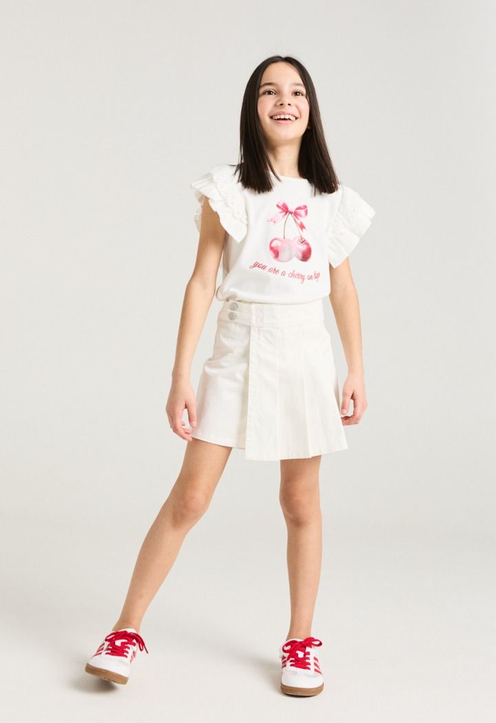 A vibrant short sleeved t shirt that features a cherry embellished design.