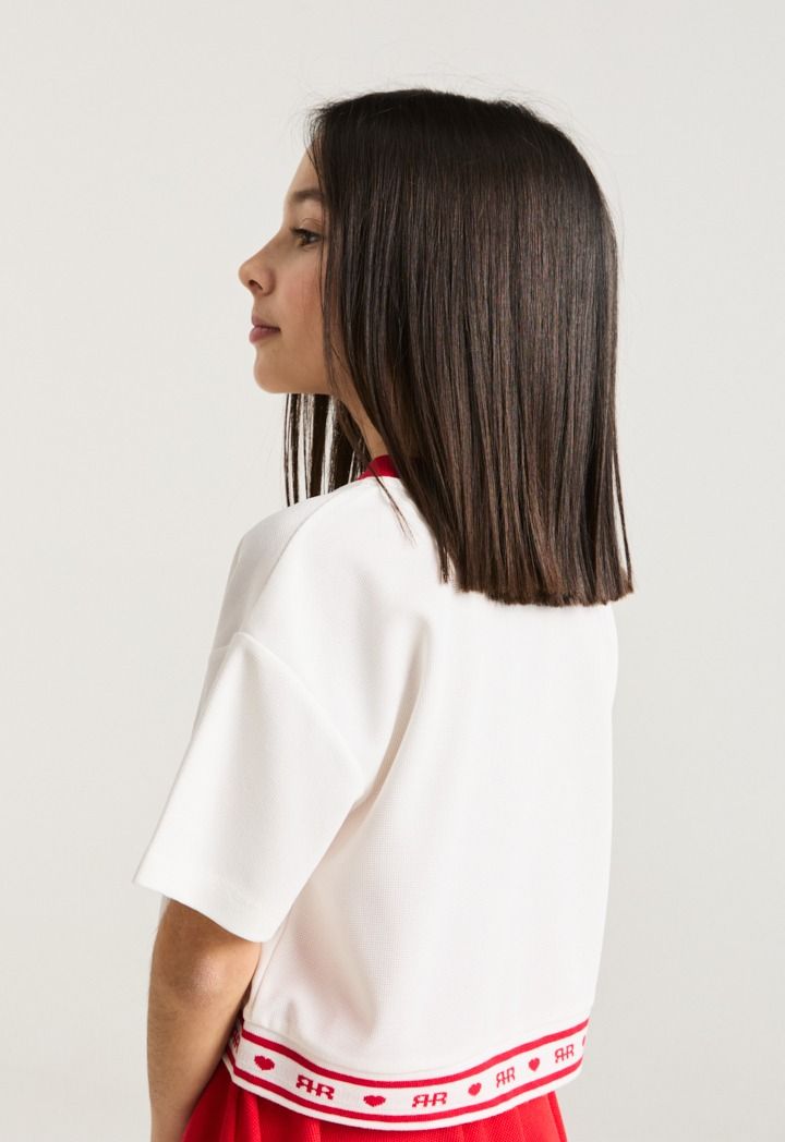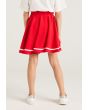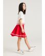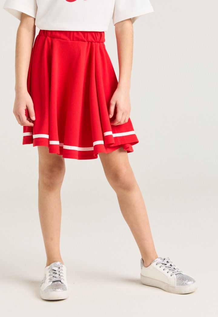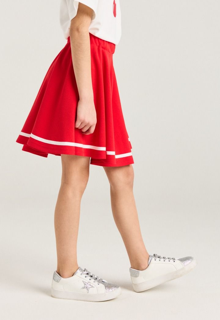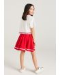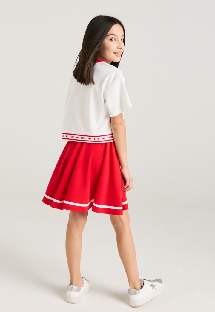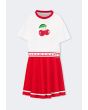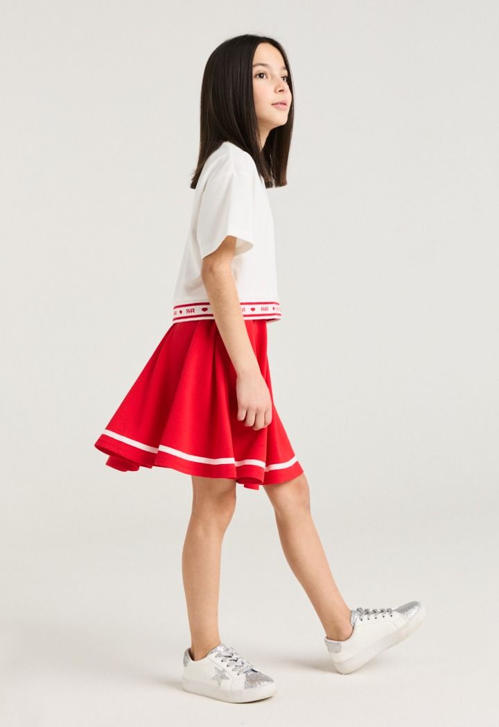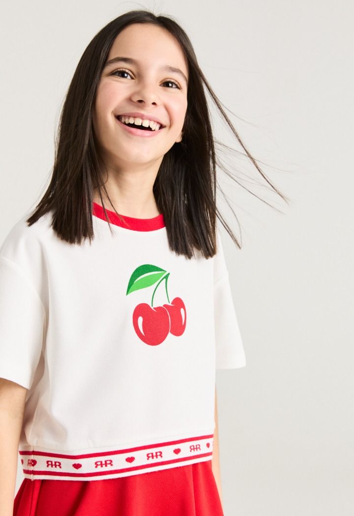 A vibrant set that features a short sleeved cherry t shirt and a matching skirt.