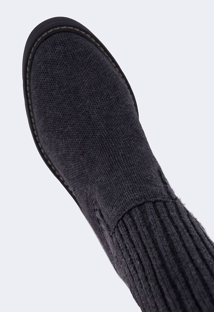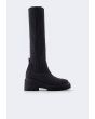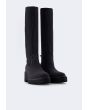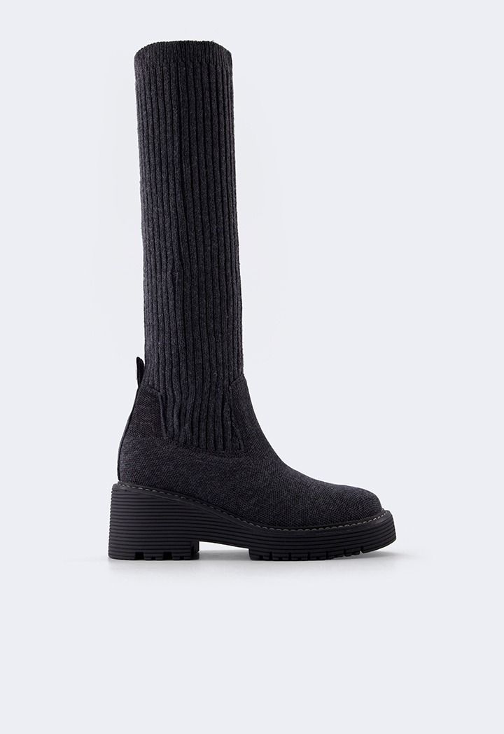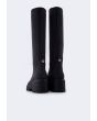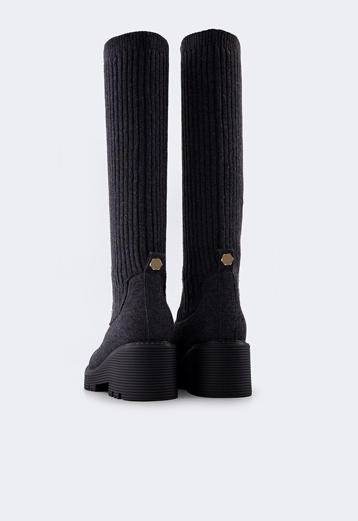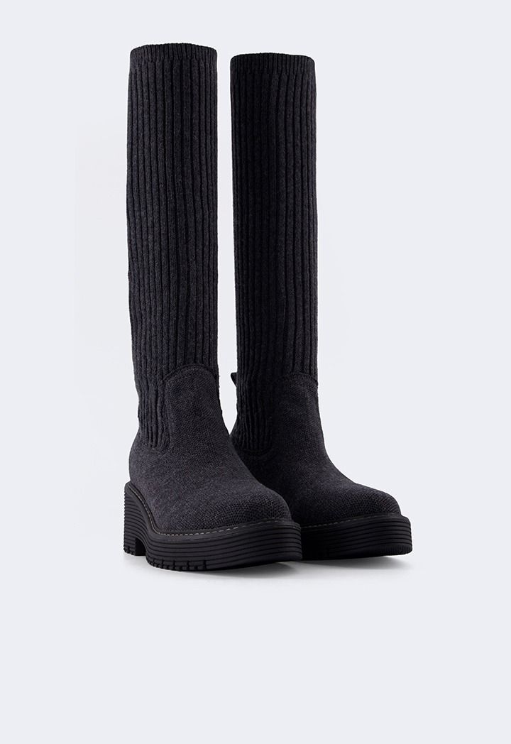 A pair of solid chunky boots with elastic fabric around the calf, designed for maximum comfort and warmth.
