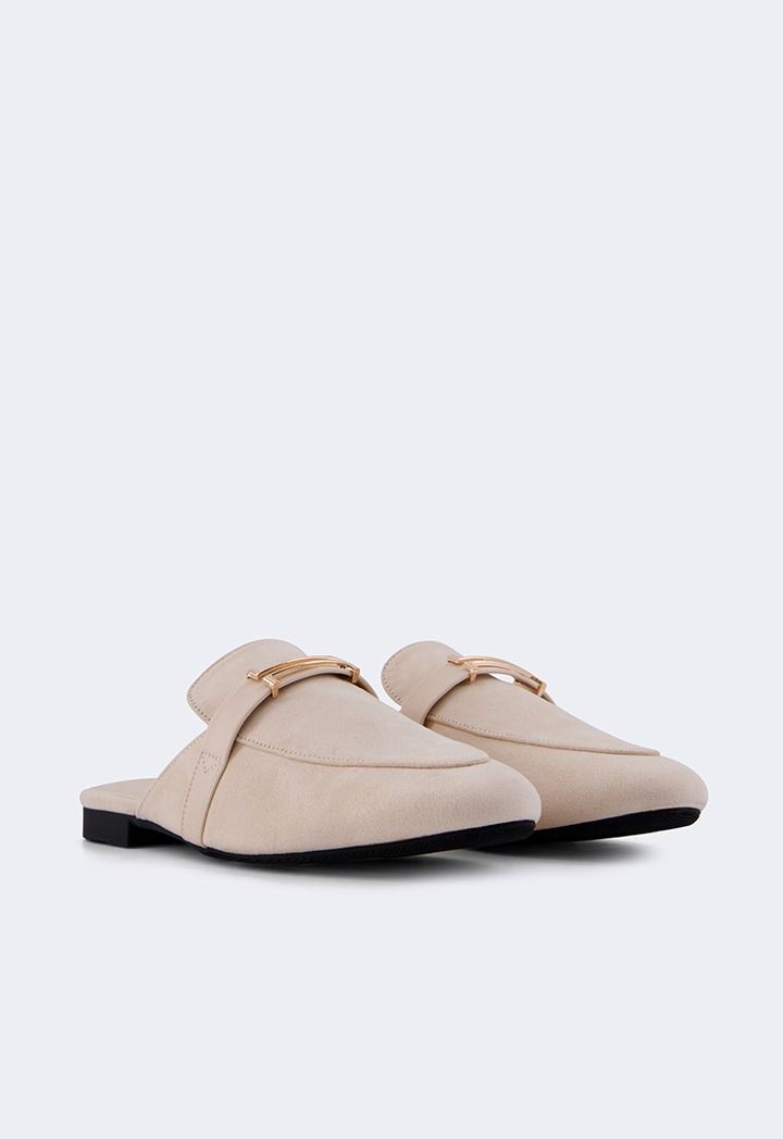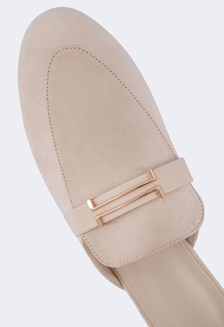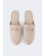 A pair of comfortable flat suede mules with metallic details.
