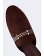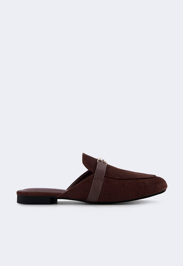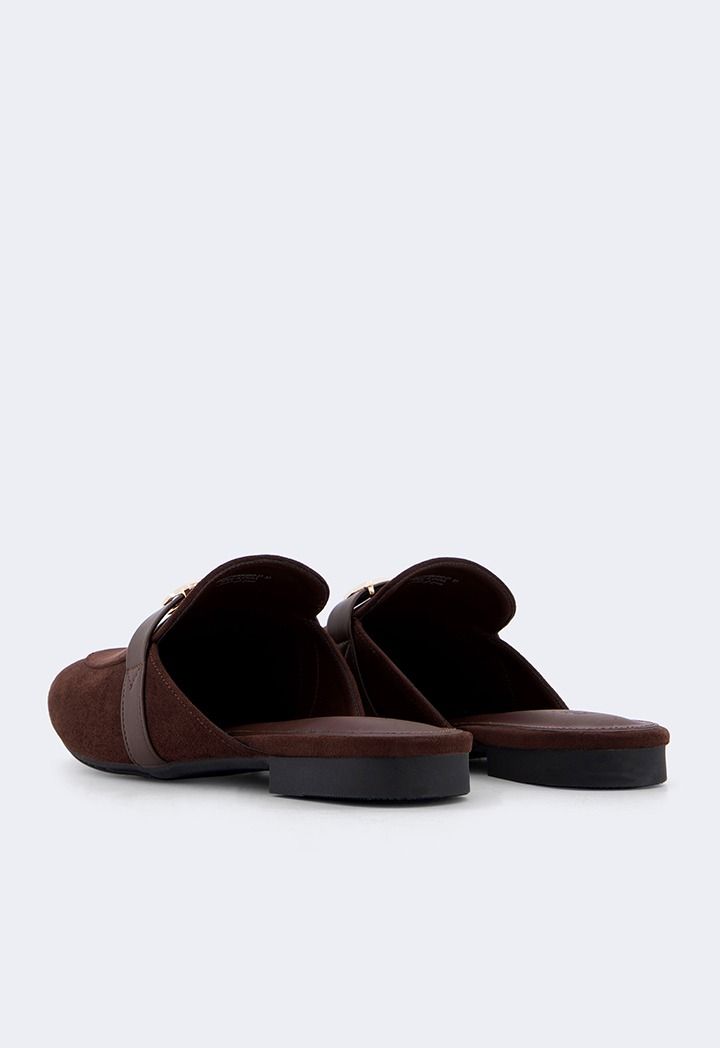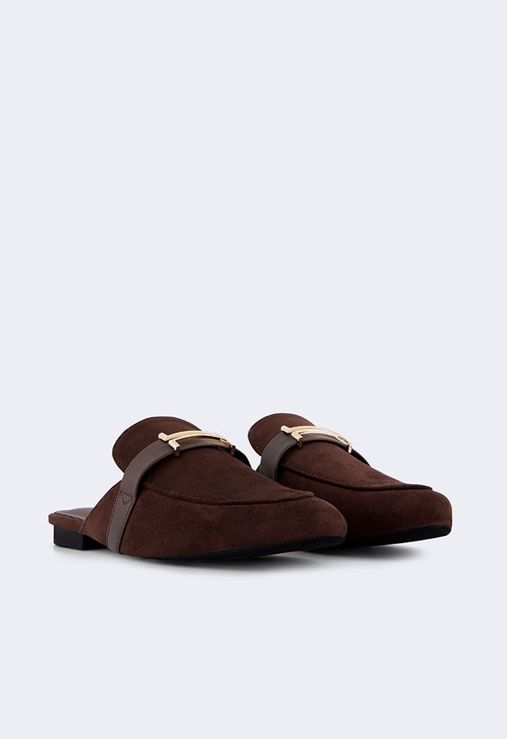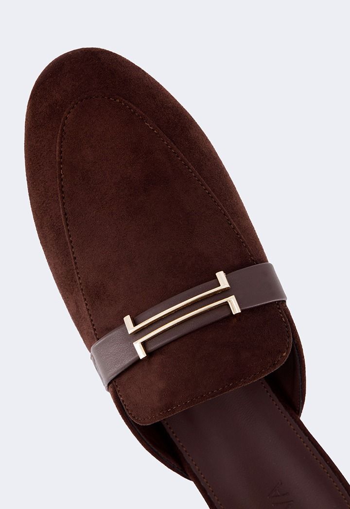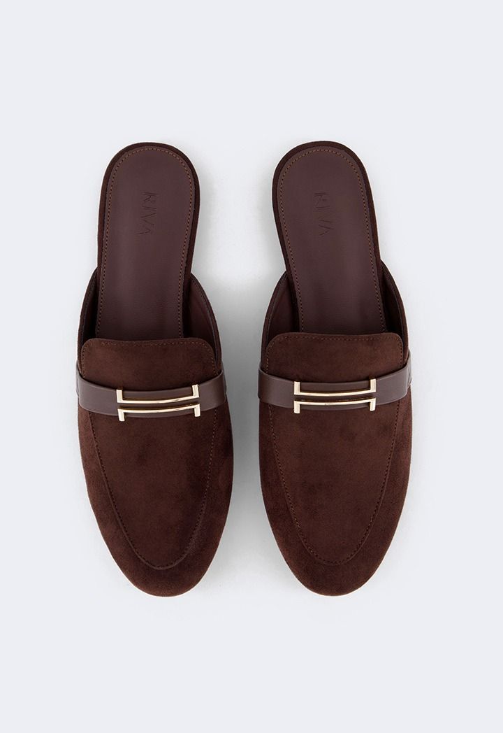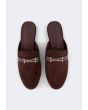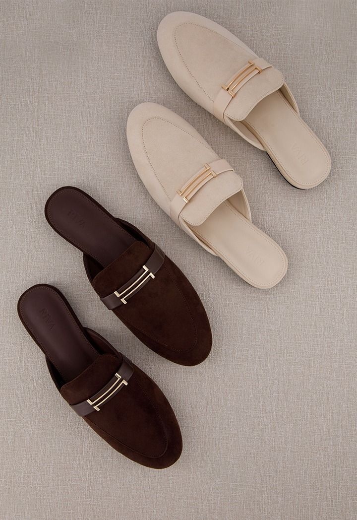 A pair of comfortable flat suede mules with metallic details.