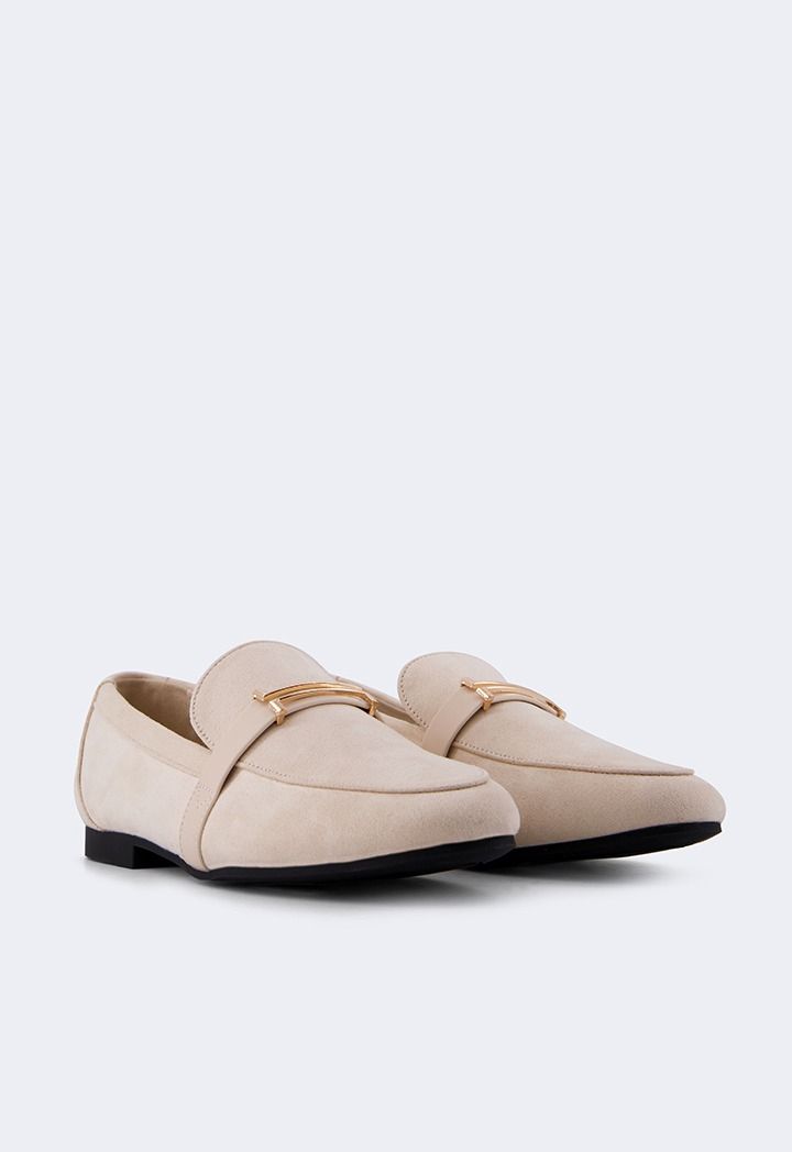 A pair of comfortable loafers featuring a suede design with metallic details.