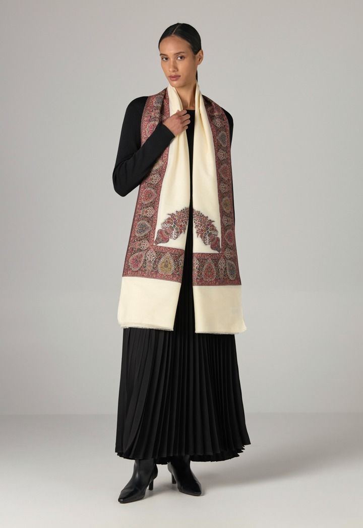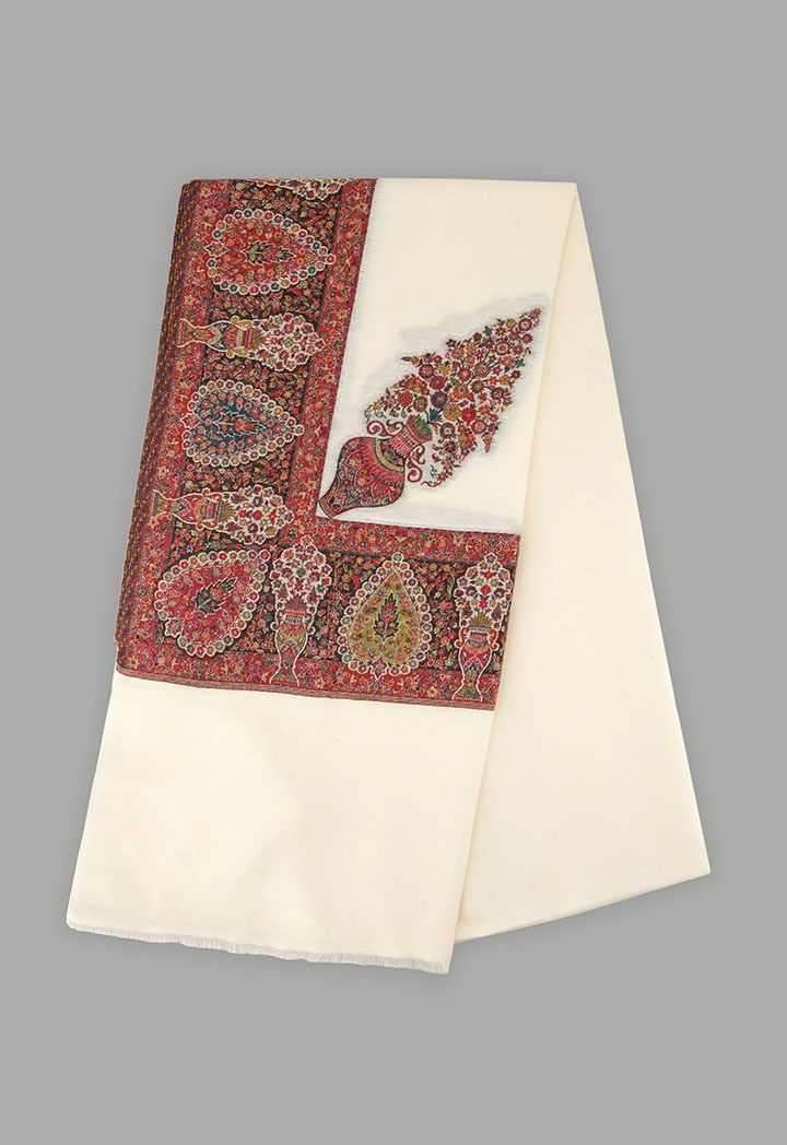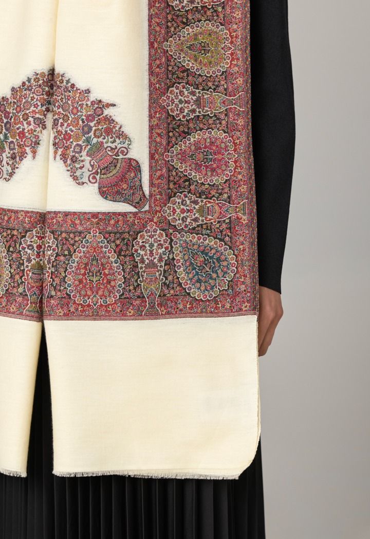 A warm winter shawl that features an elegant colorful embroidered design.