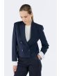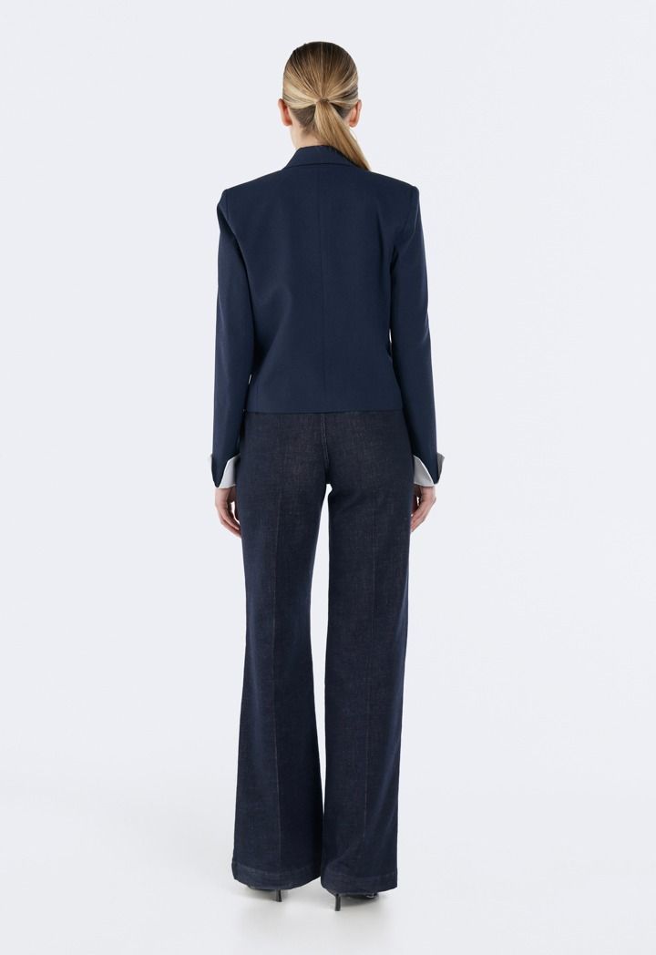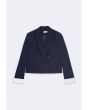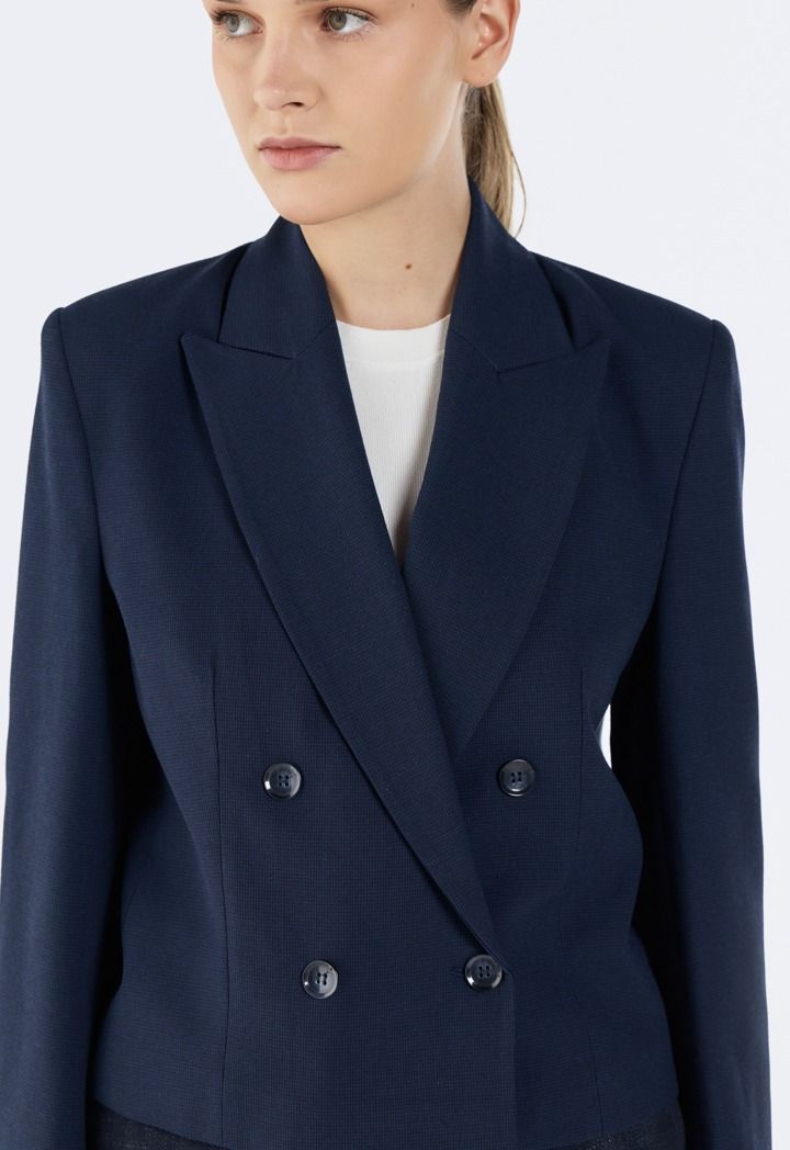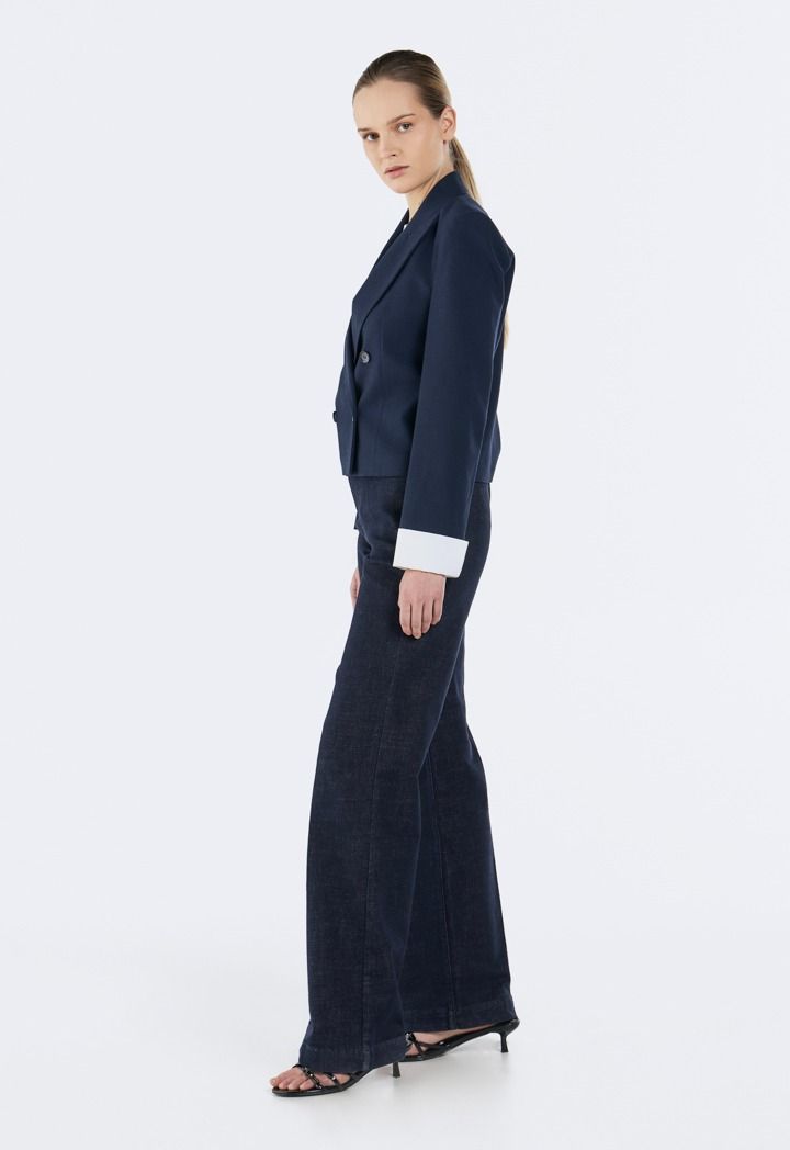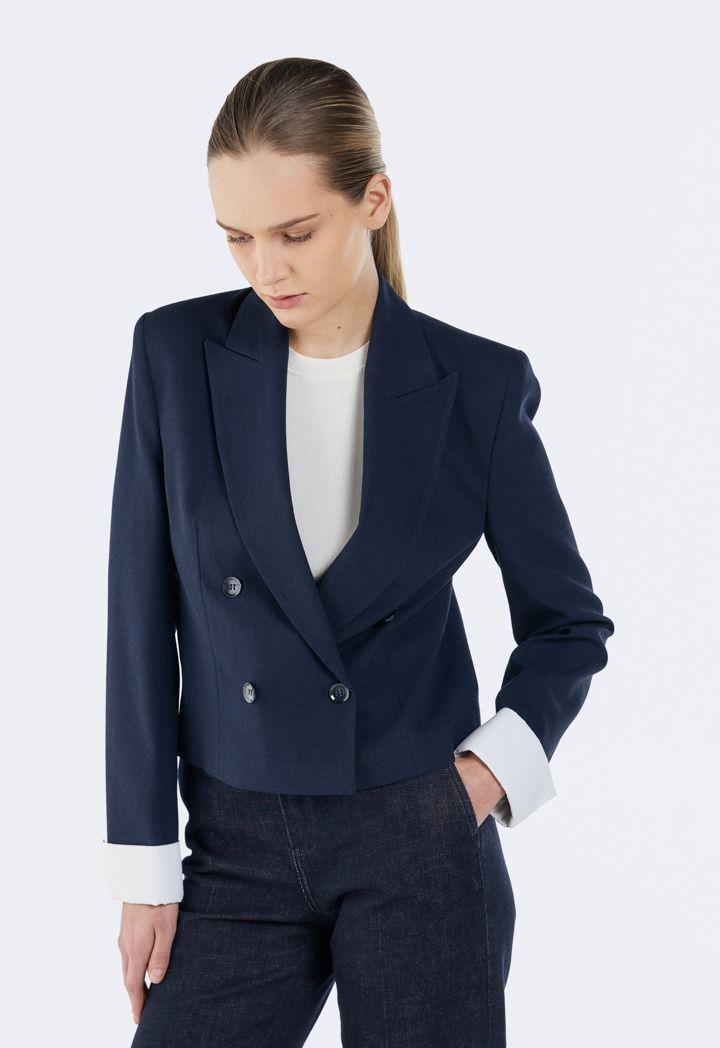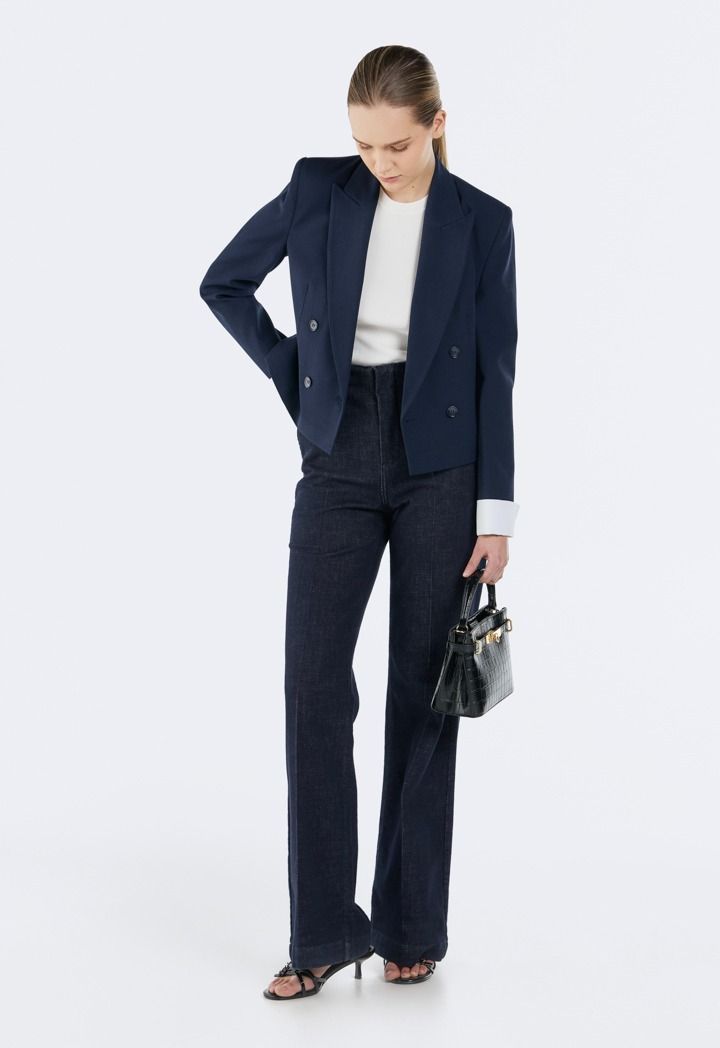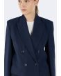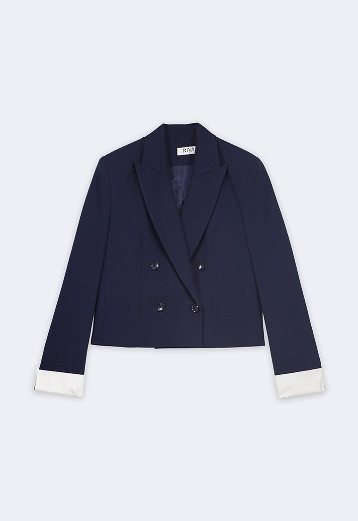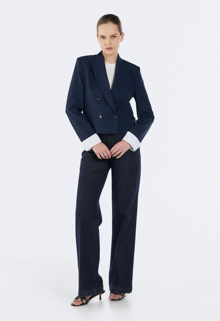 A minimalist double breasted blazer that brings a modern flair to everyday clothing ideal for chic and relaxed look .