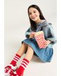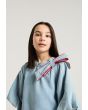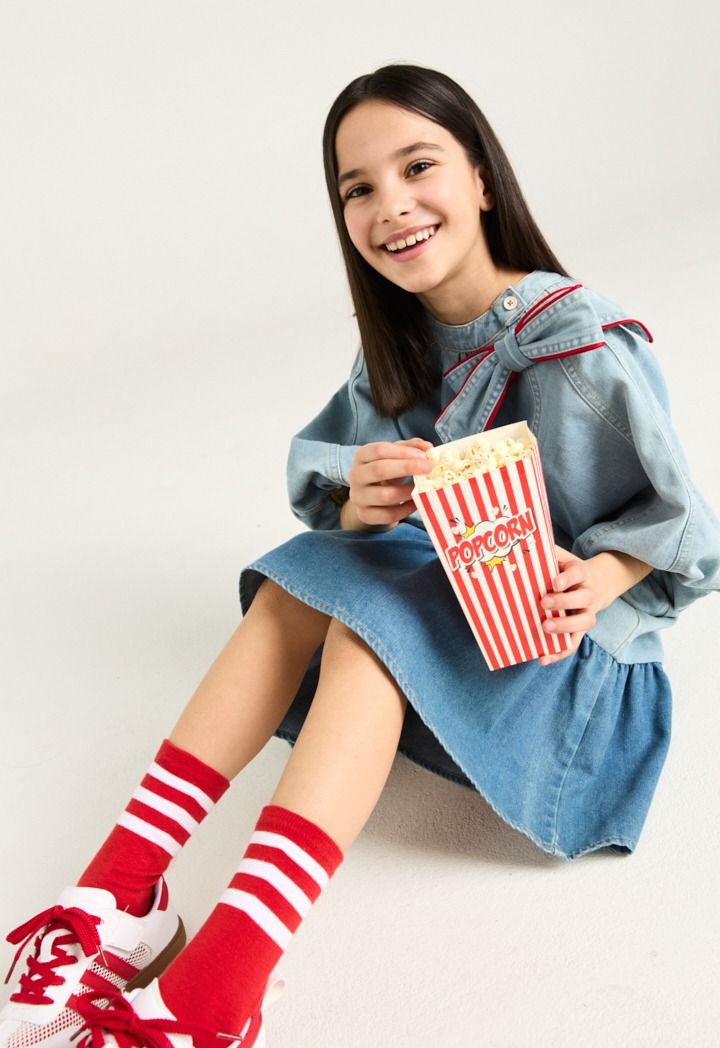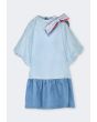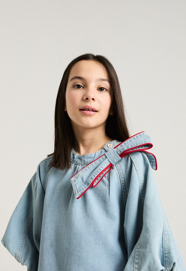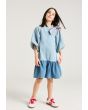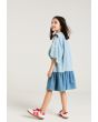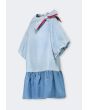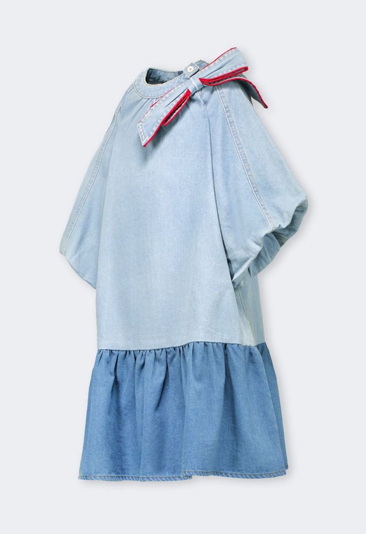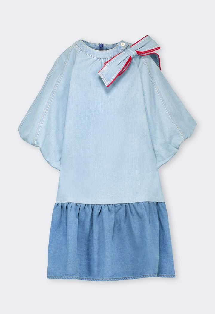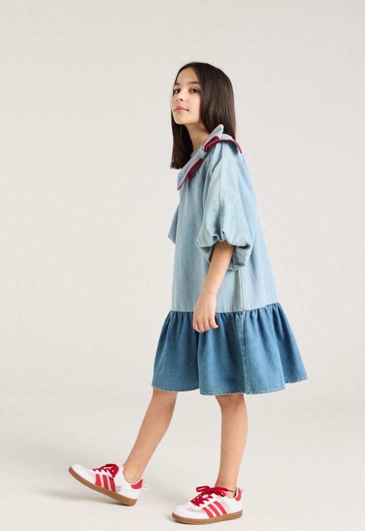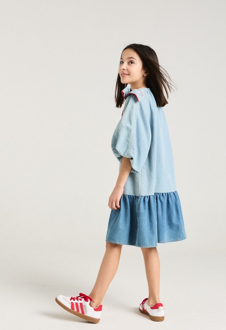 A denim dress that features a mandarin collar, puff sleeves and a drop waist.