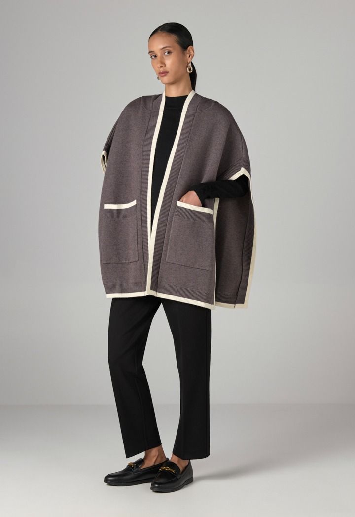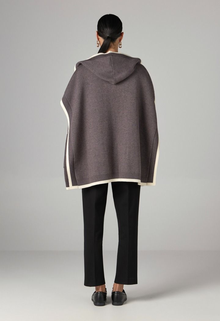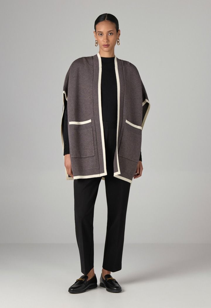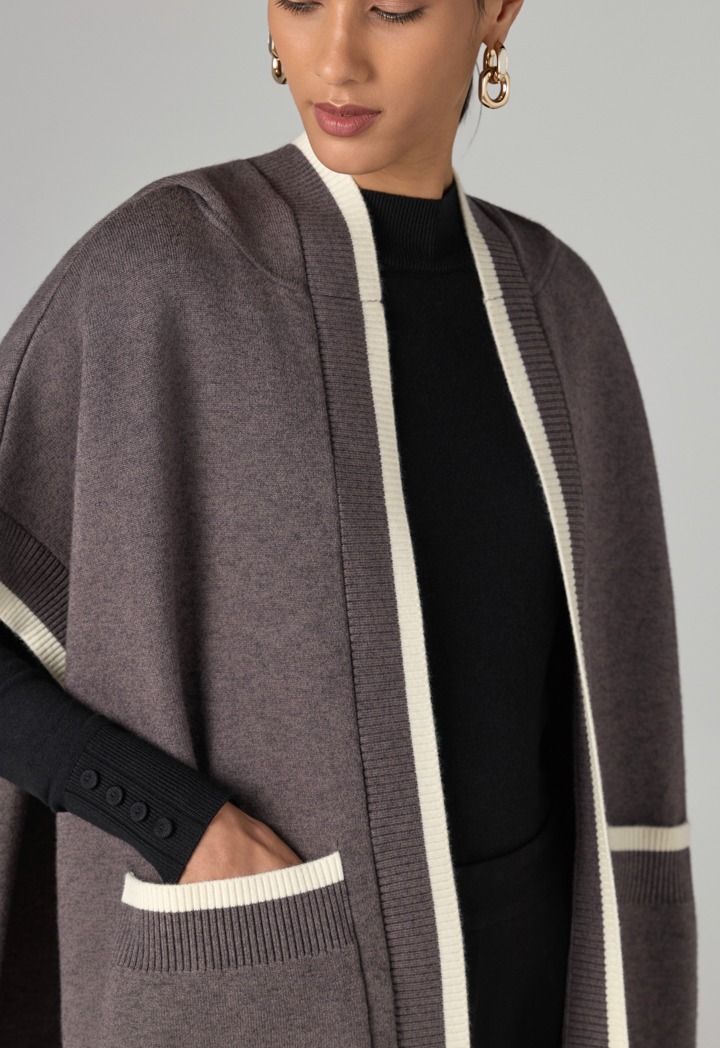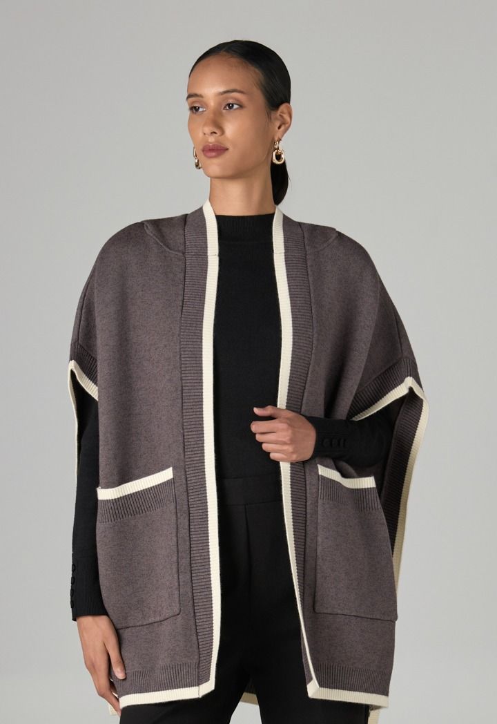 This contrast poncho is perfect for quick outings as a cozy outerwear piece for cold mornings.