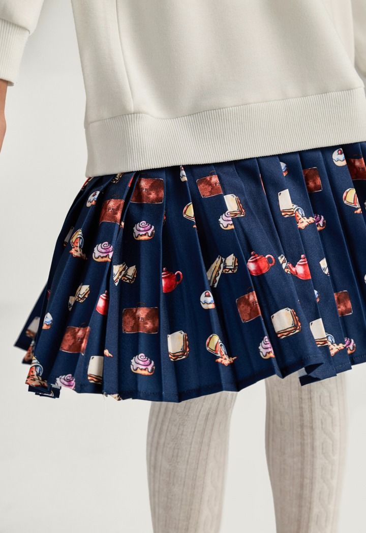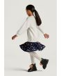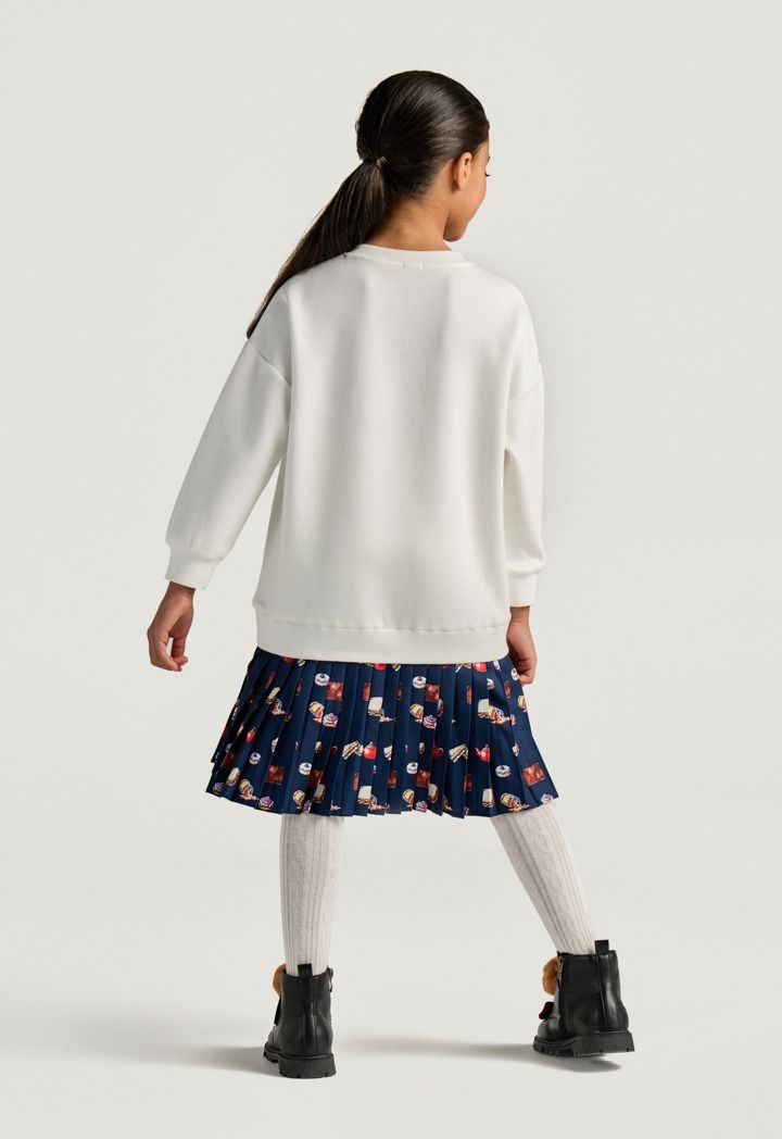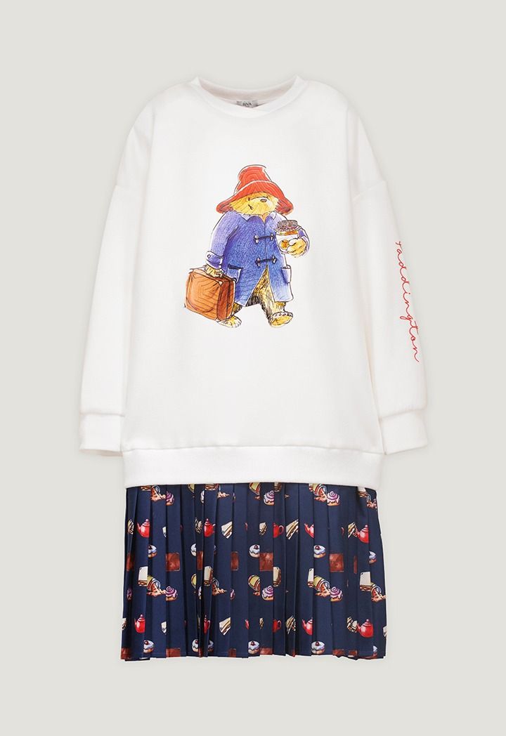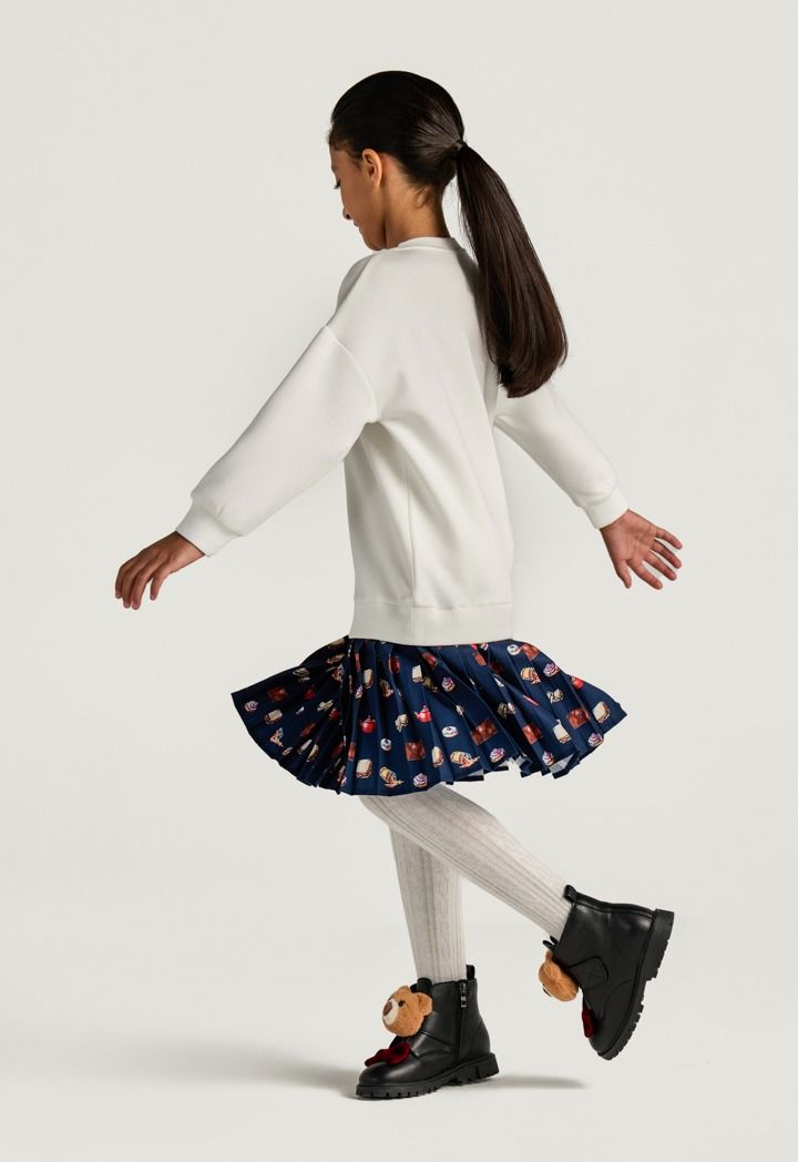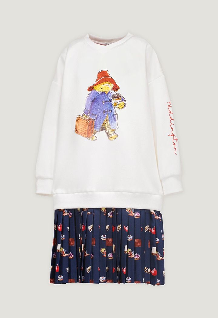 A contrast sweater dress that features a pleated skirt and an embossed batch.