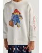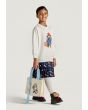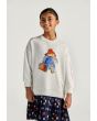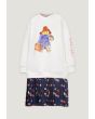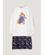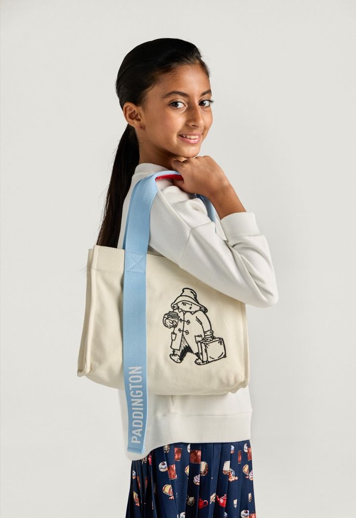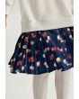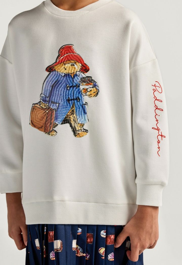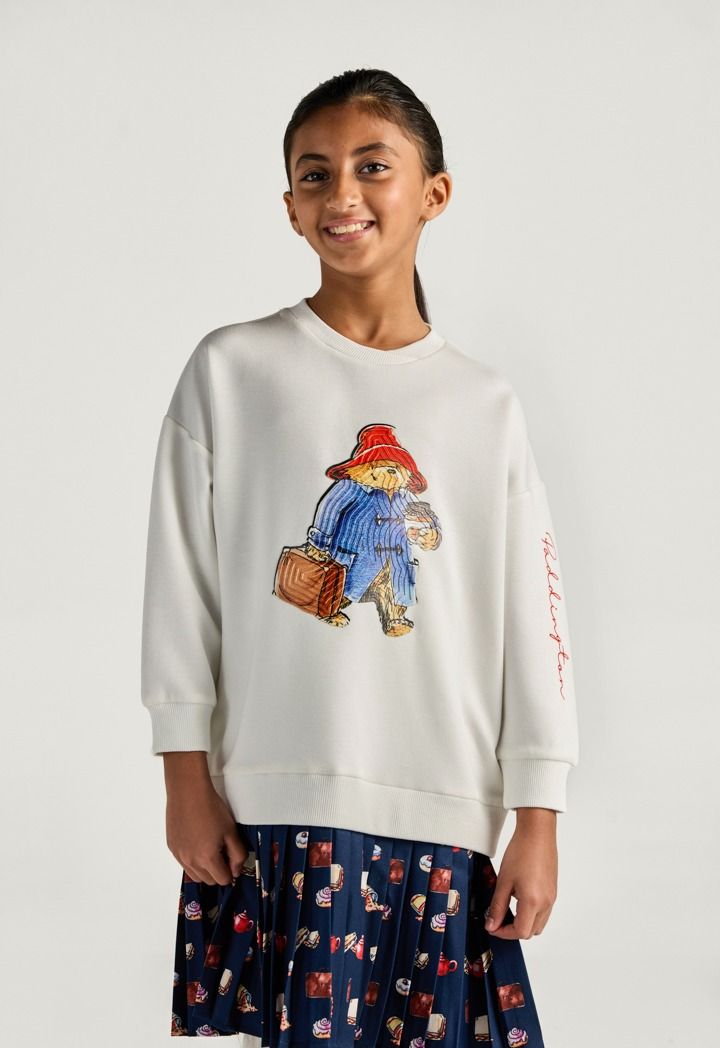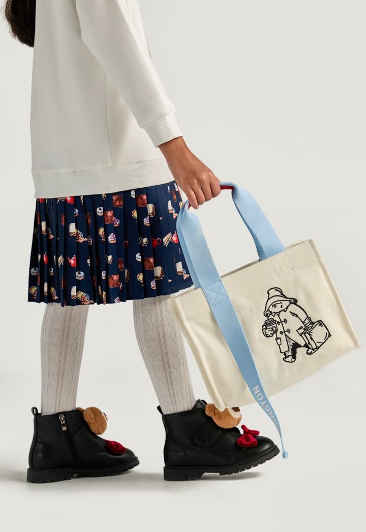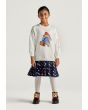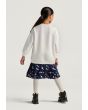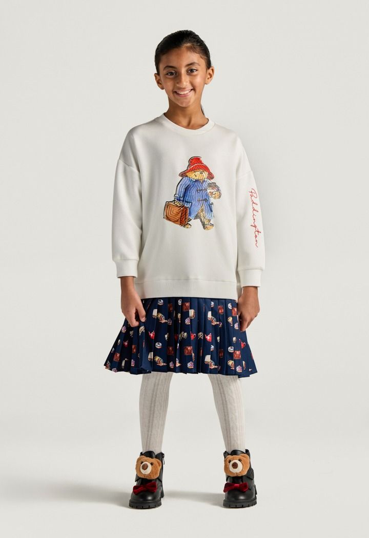 A contrast sweater dress that features a pleated skirt and an embossed batch.