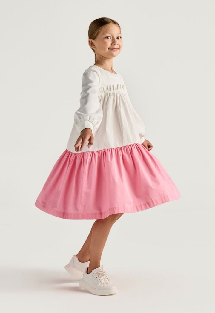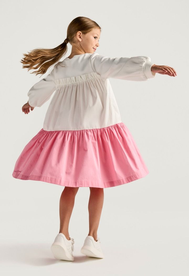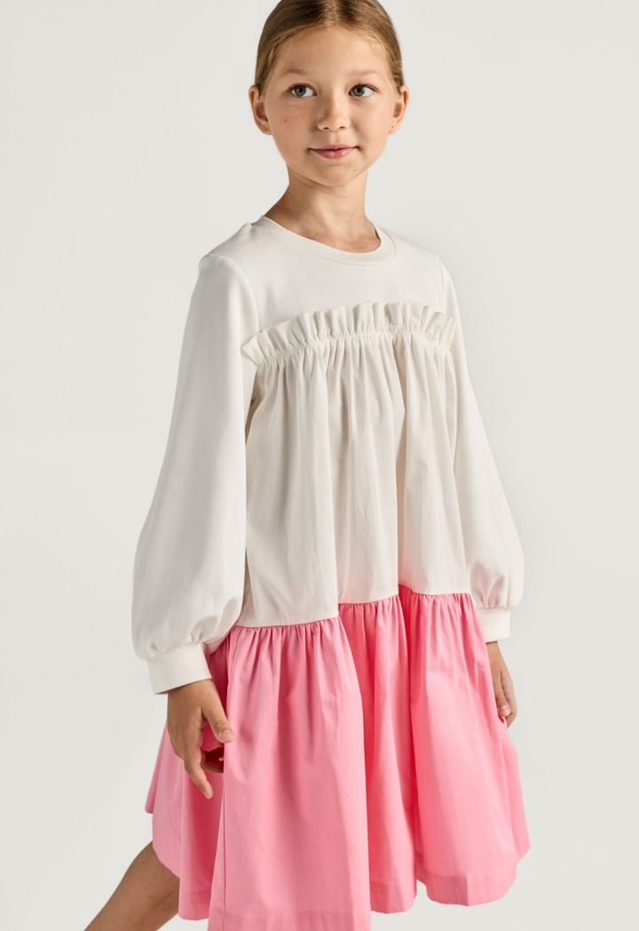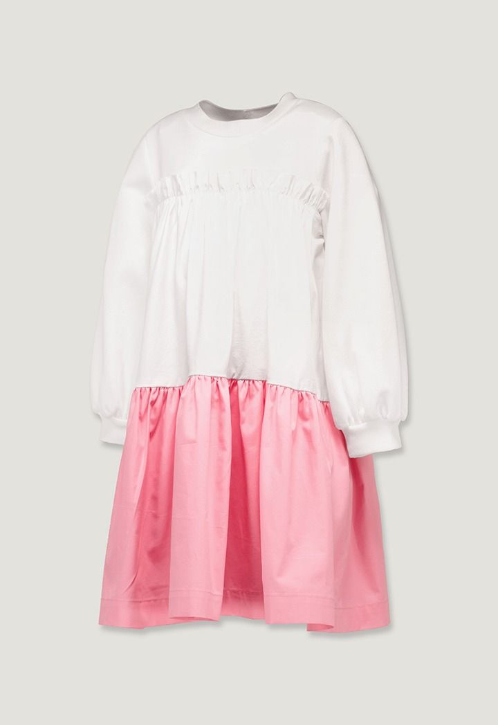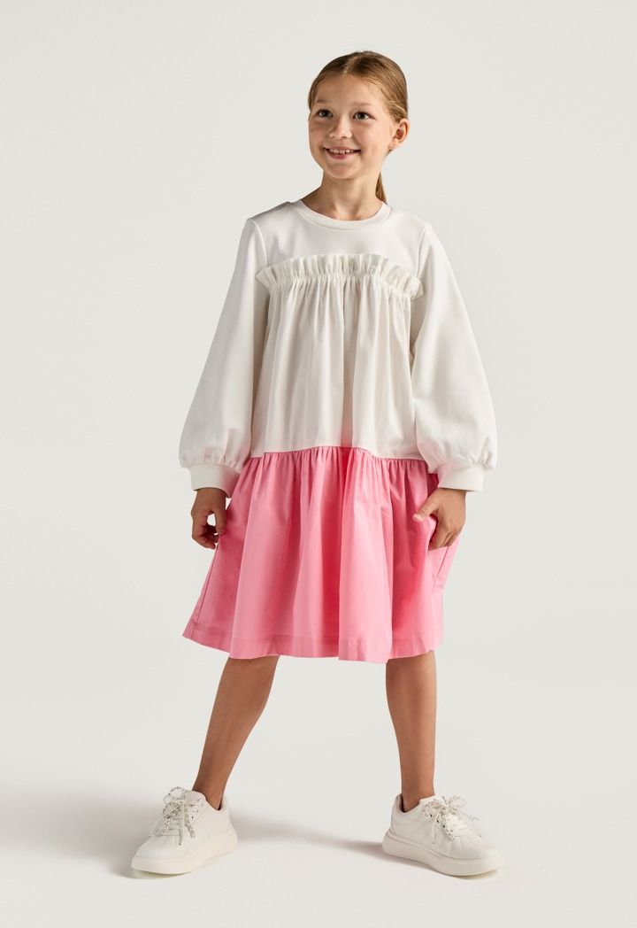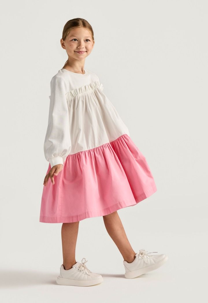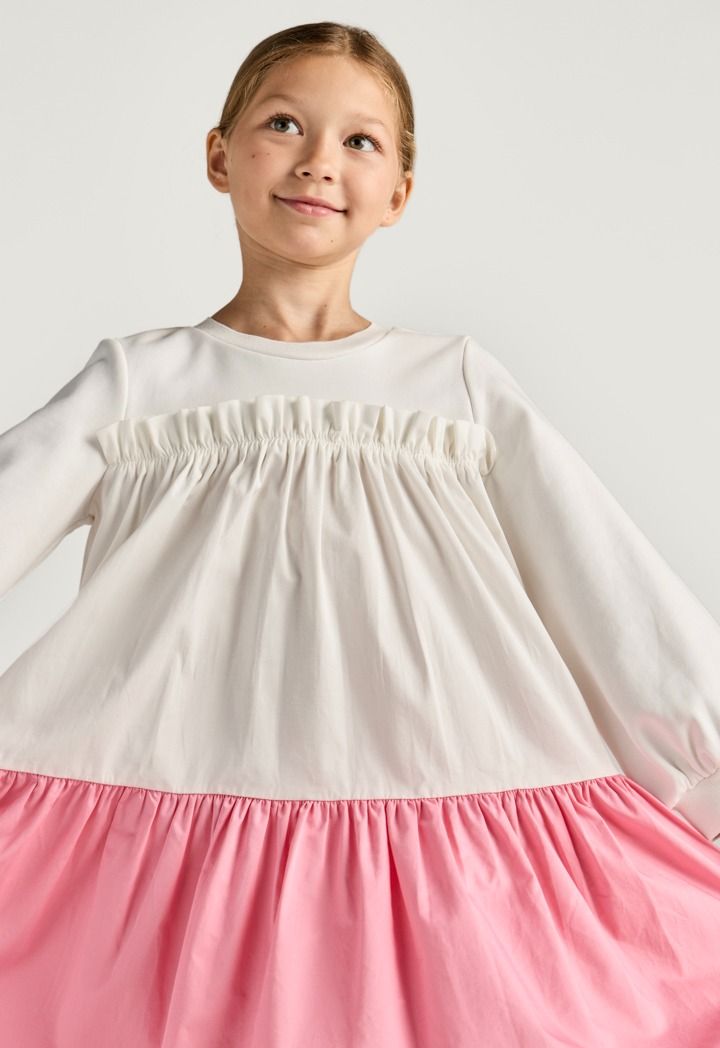A contrast dress that features a crew neck and a ruffled bodice.