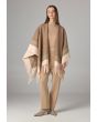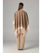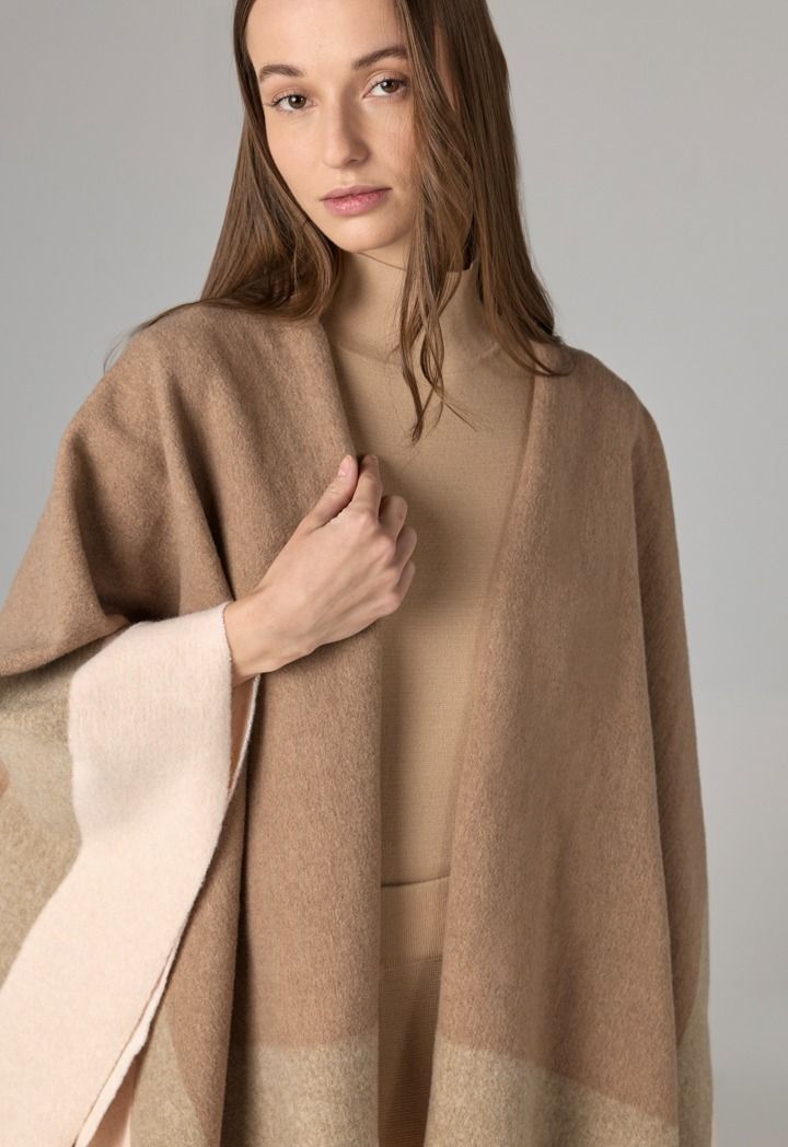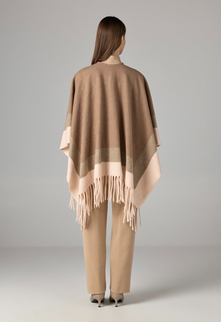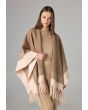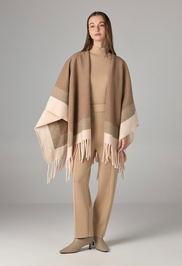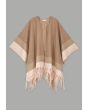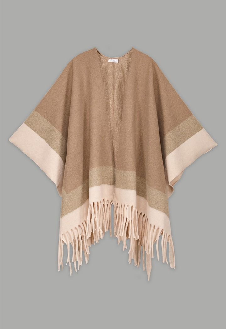 This contrast poncho with tassels is lightweight yet provides the warmth you need.