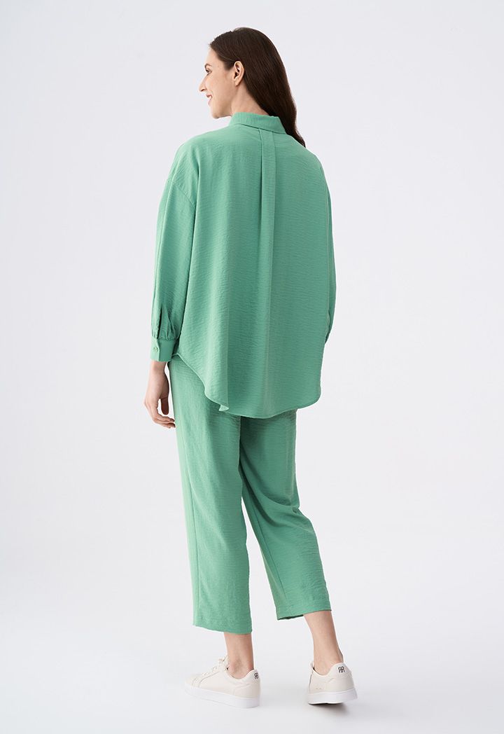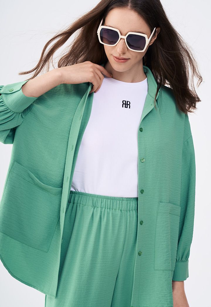 Design: Solid, Crinkled, High Low, Loose Fit, Drop Shoulder, Patch Pockets
