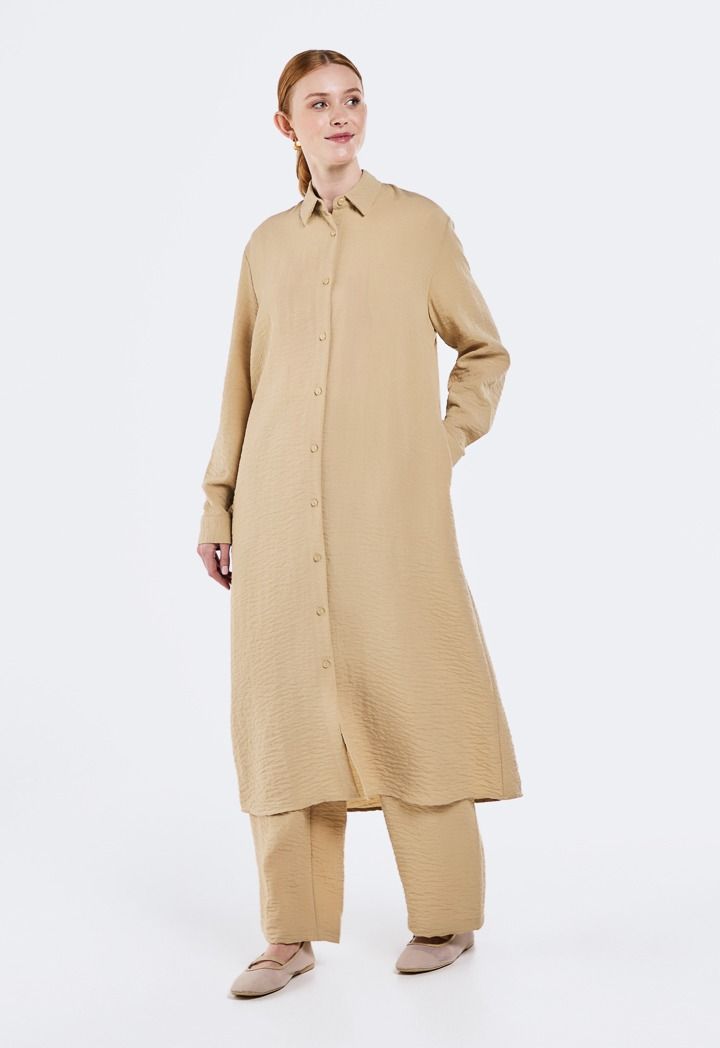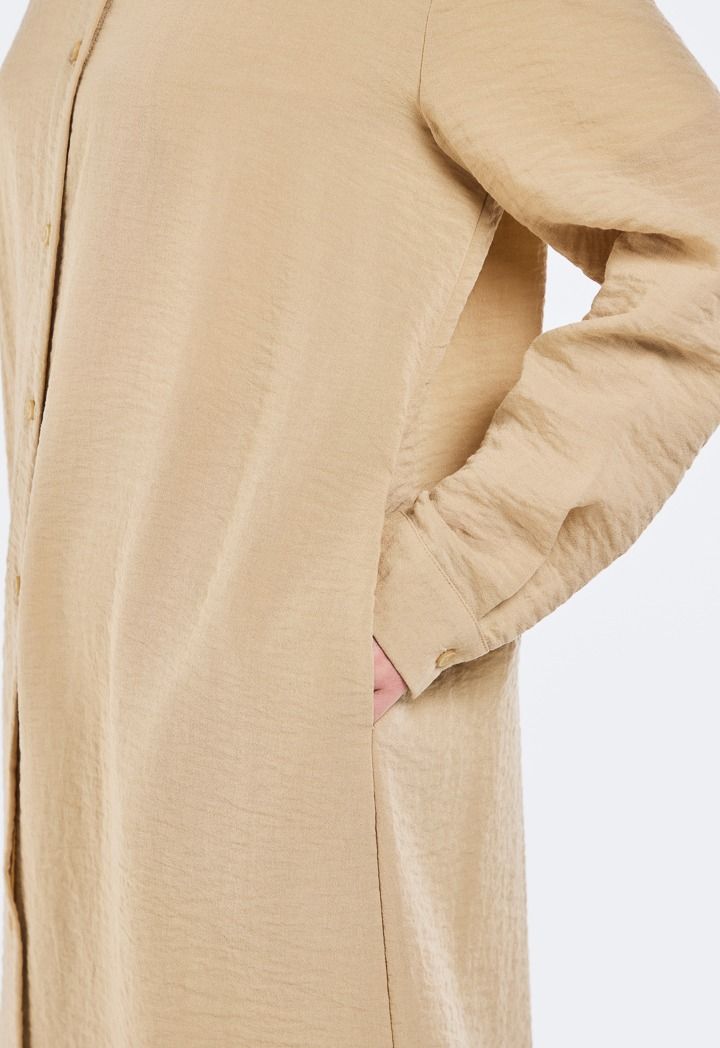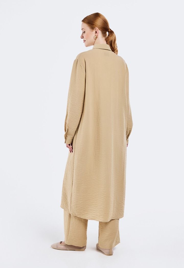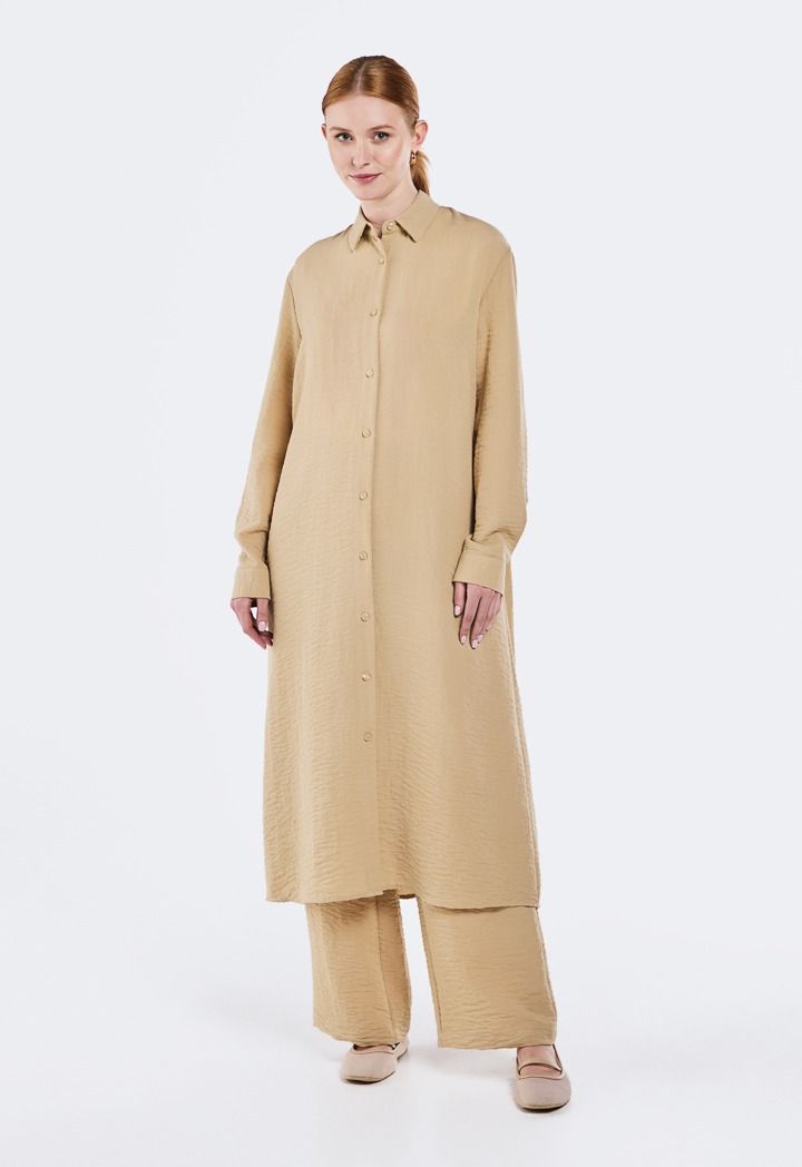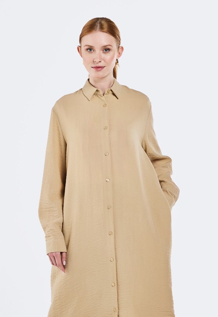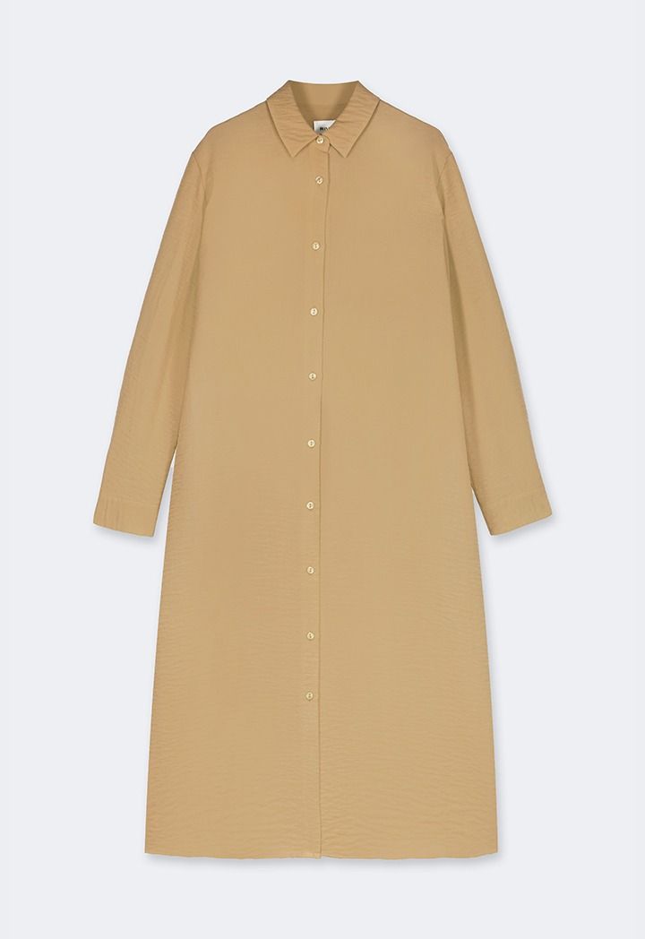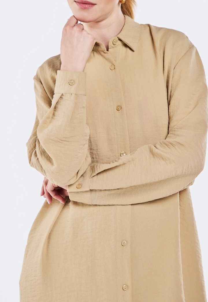 This Midi Shirt Dress brings a fresh perspective to modern femininity with its graceful silhouette. Crafted in crinkled fabric, design that adds dimension and movement to the dress.