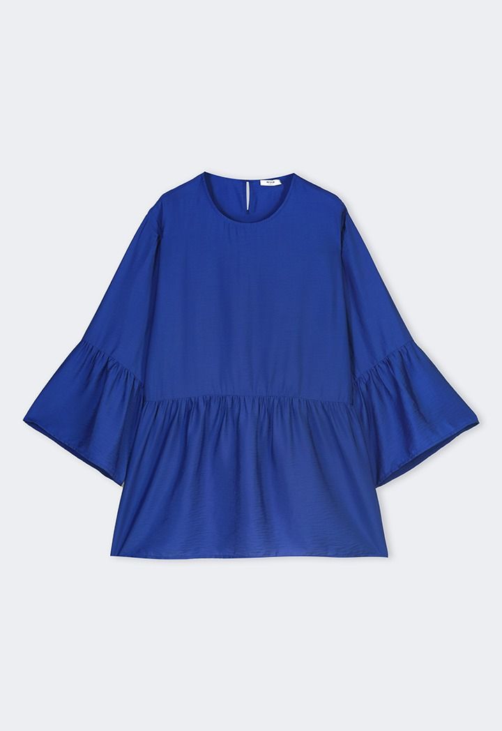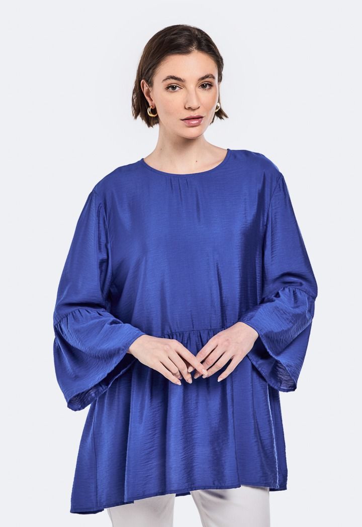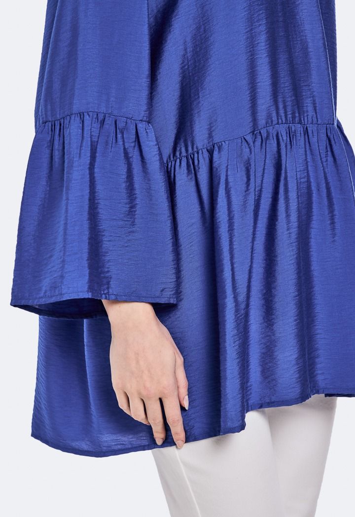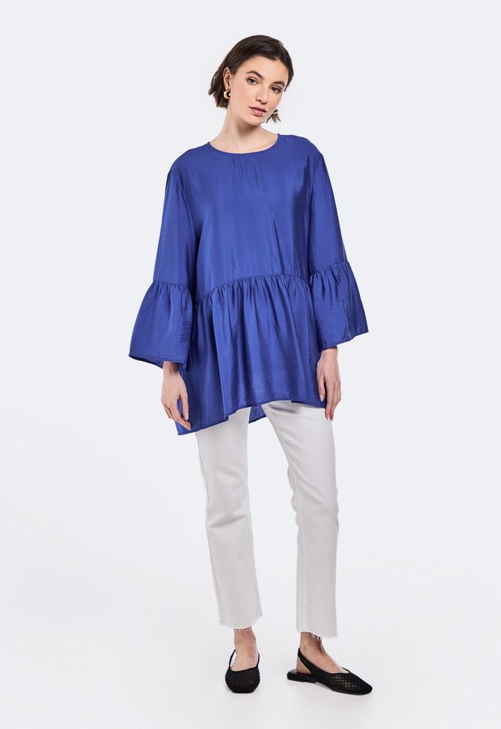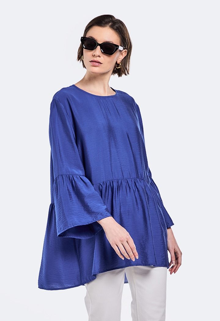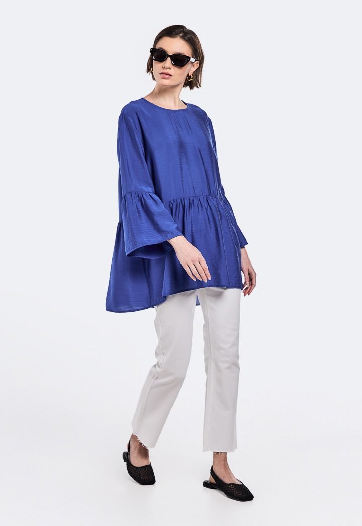 This piece boasts a ruffle detail for modern flair, while the crinkled details add feminine touches.