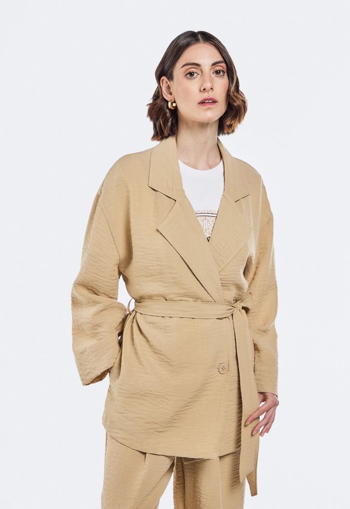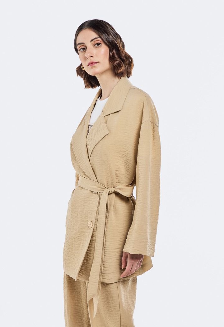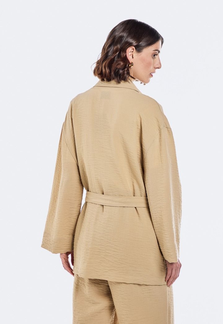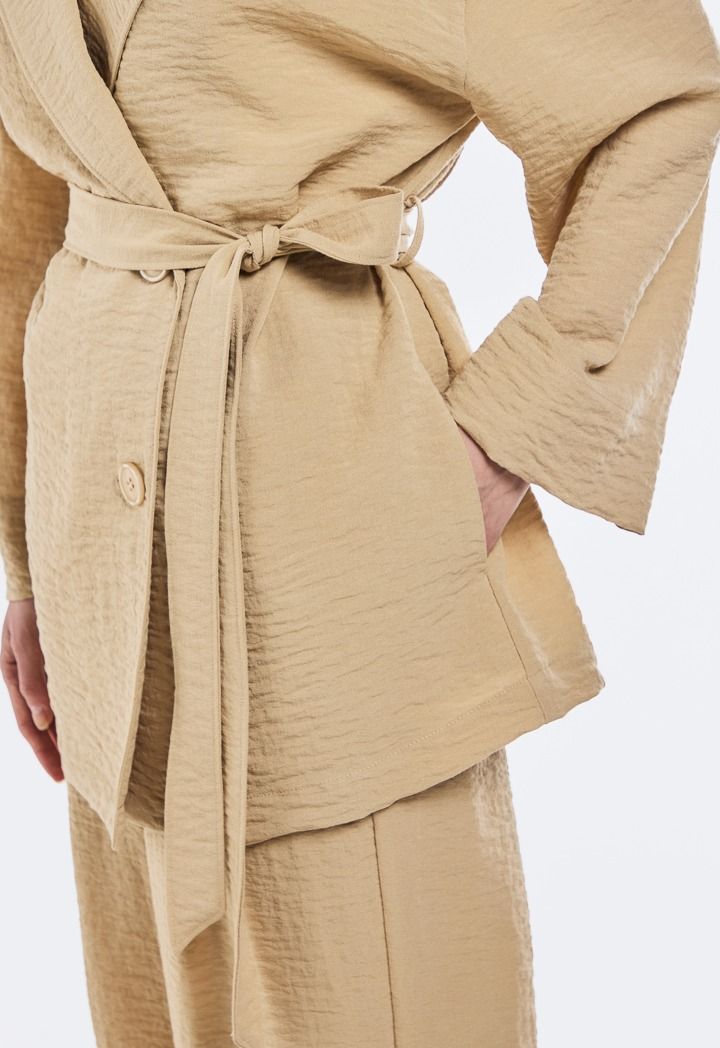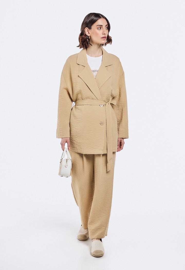 Design: Solid, Crinkled, Belted, Single Breasted, Side Pockets